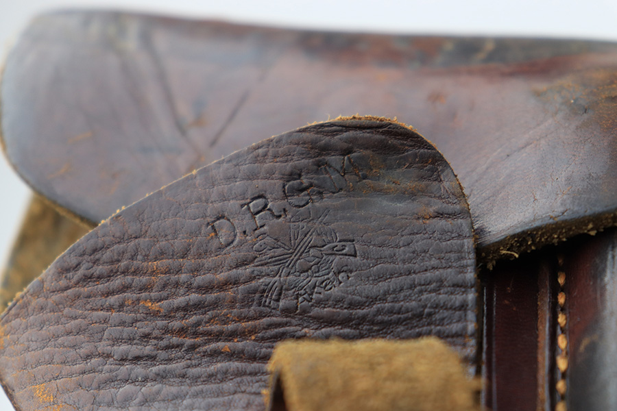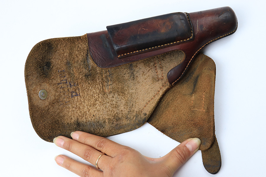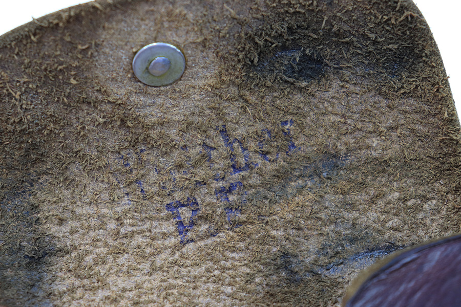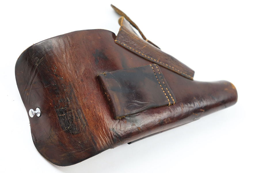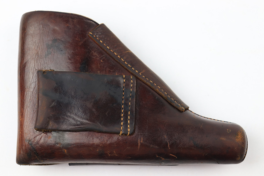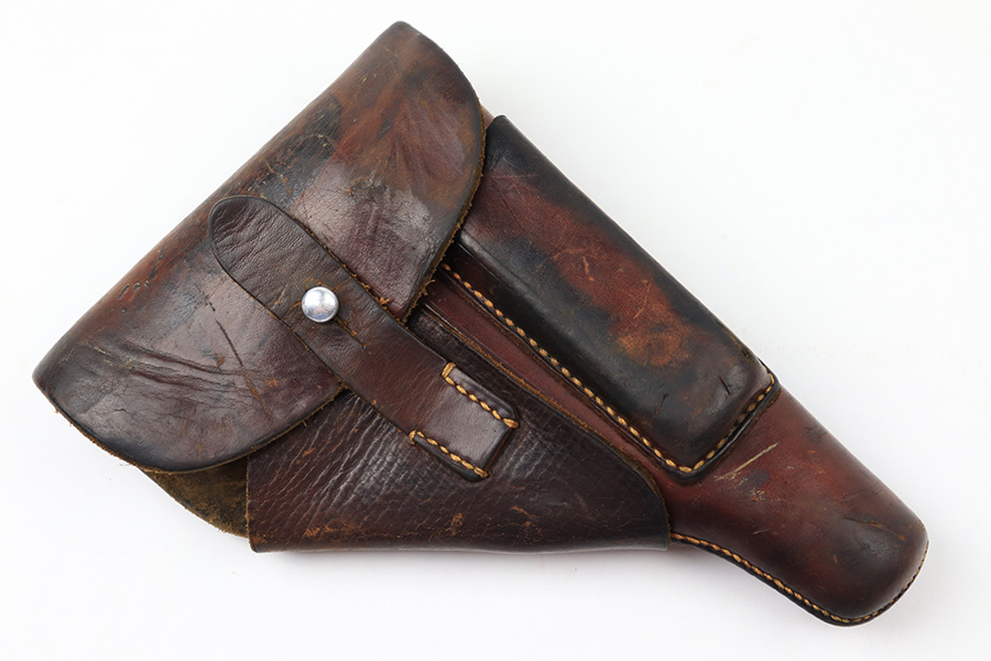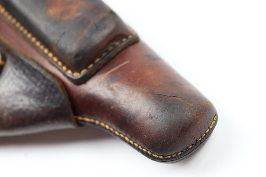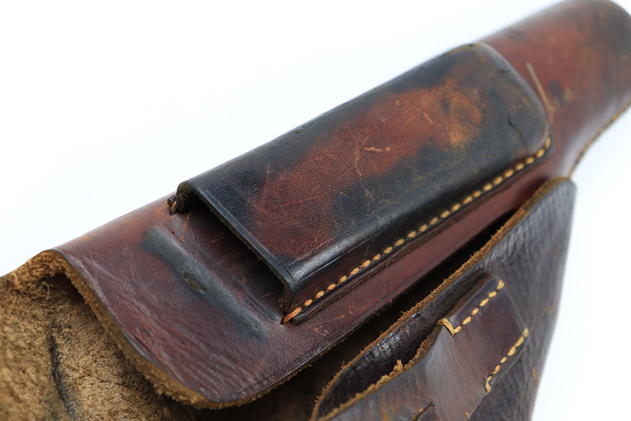 7/14/22 – This is an original brown leather AKAH Walther PP holster from WW2. The holster is maker stamped under the closure strap, and still has the original Walther PP interior ink stamp visible. The leather is pliable and shows previous use wear and aging throughout. No notable stitching issues.
