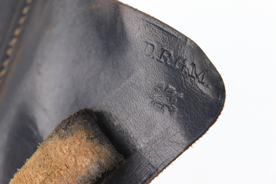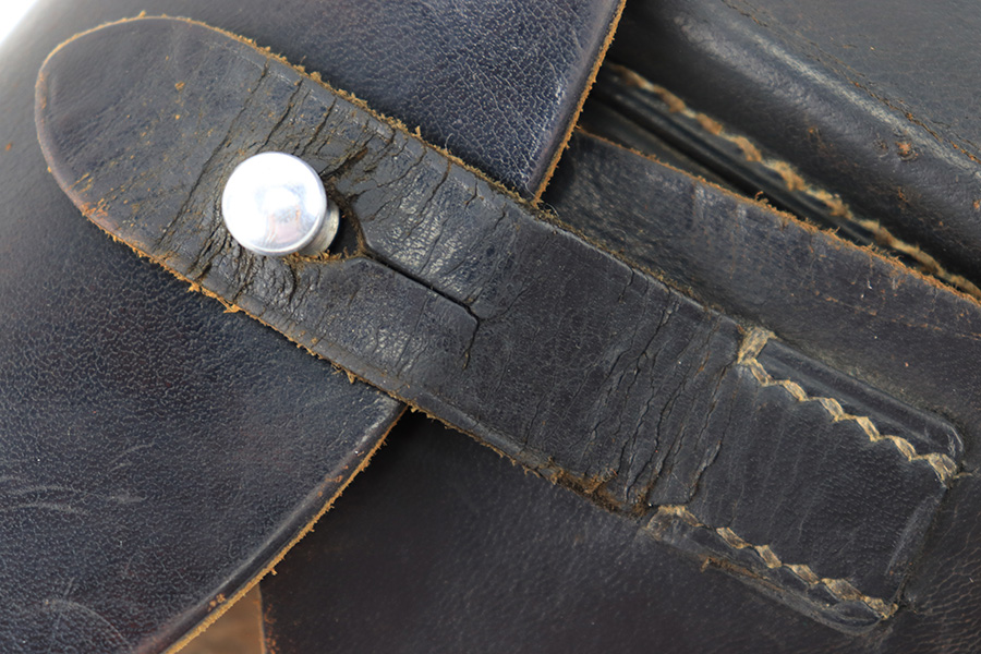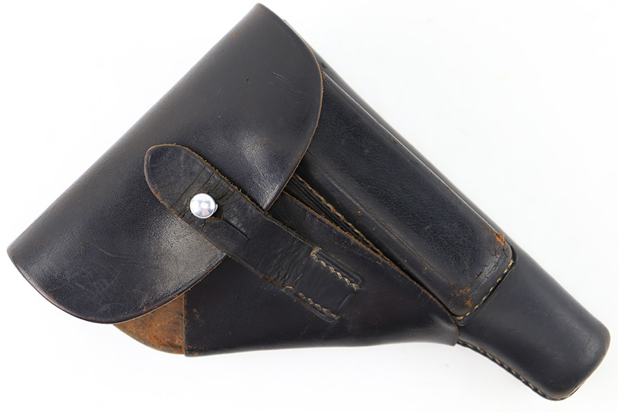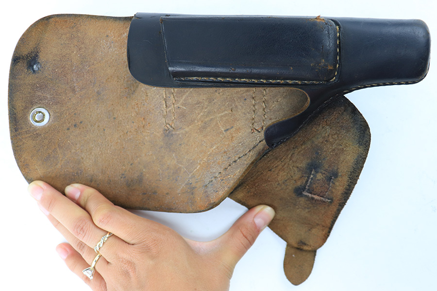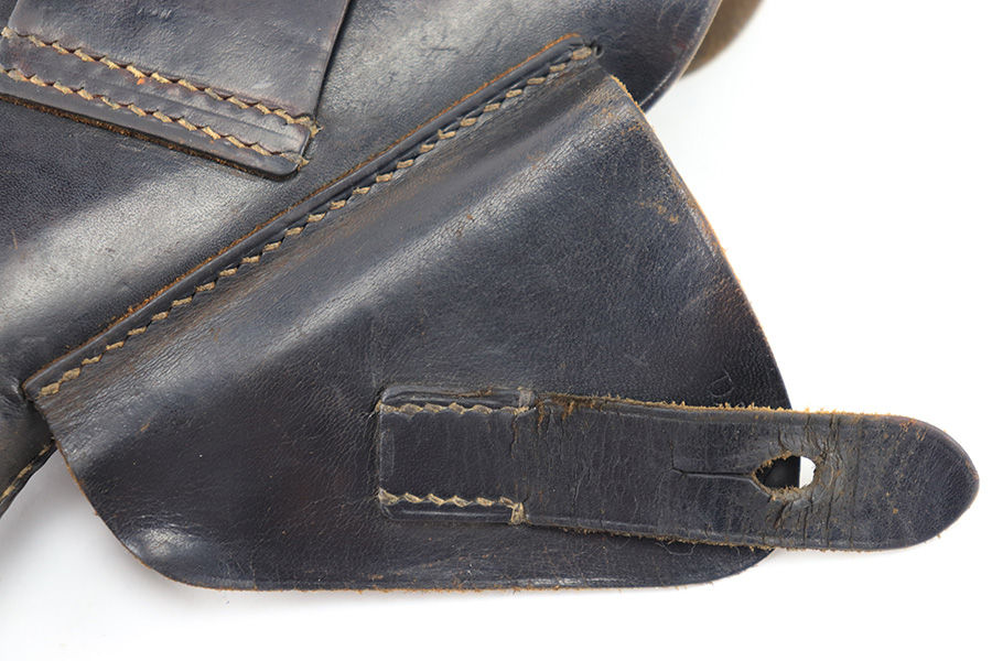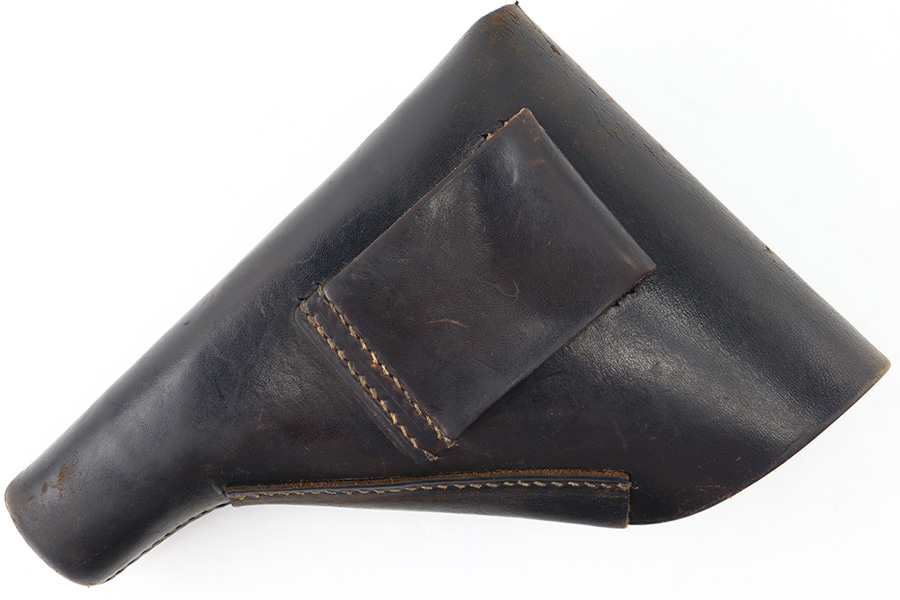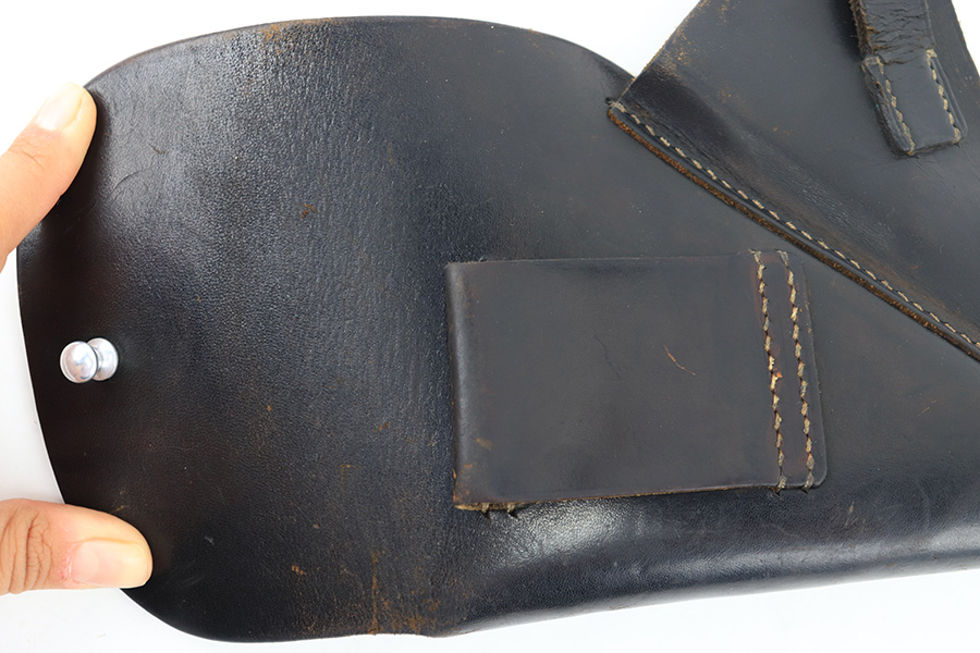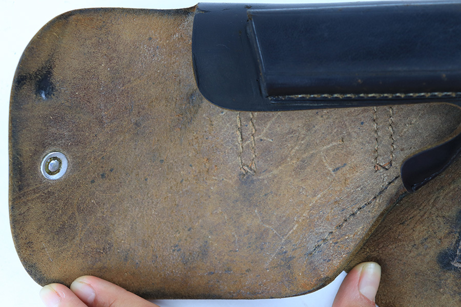 8/14/23 – This is an original WW2 production Walther PP holster made by AKAH. The holster is maker stamped under the closure strap, and there are no other visible markings or stamps. A straight forward example with some minor use wear and light surface scuffs in the exterior leather near the magazine pouch corners, toe, and rounded edge. No major issues and all original leather and stitching intact.