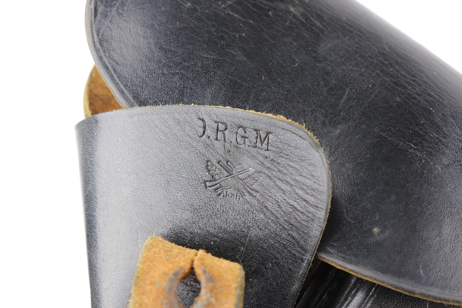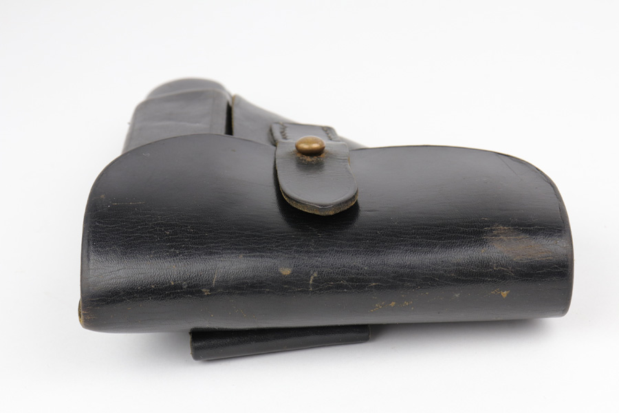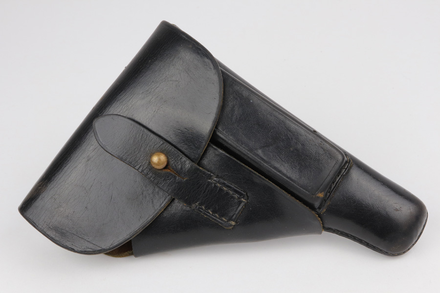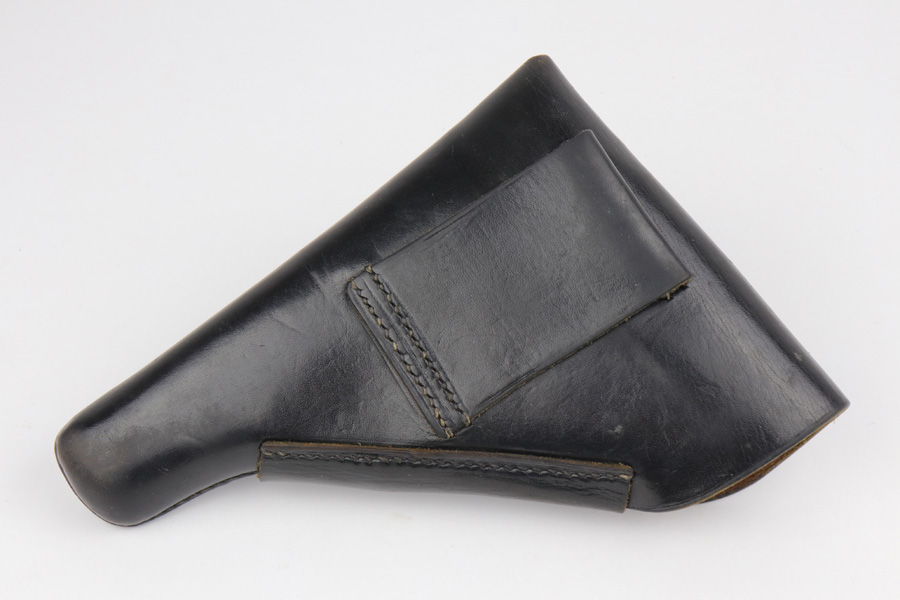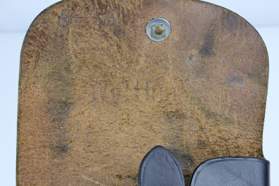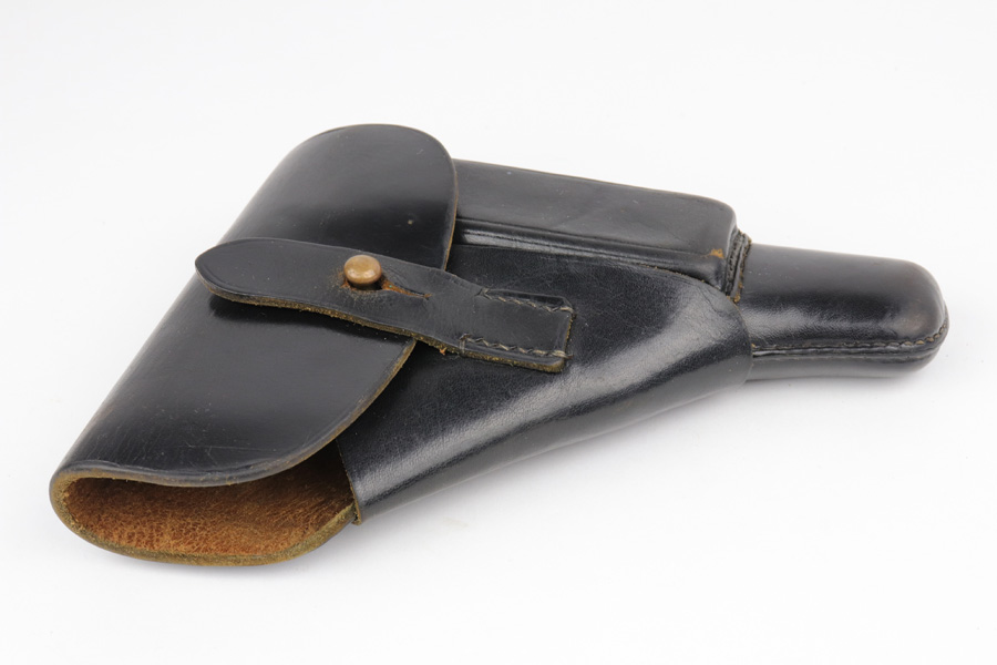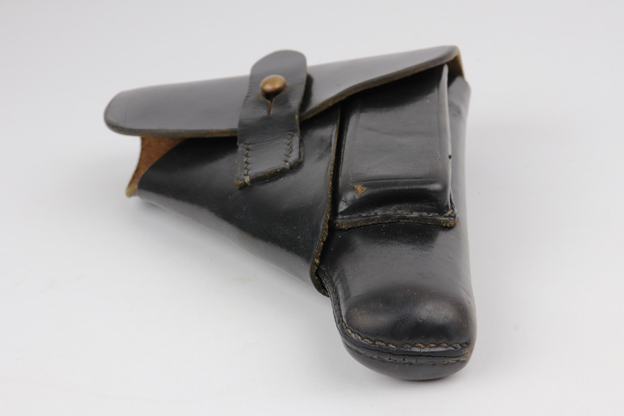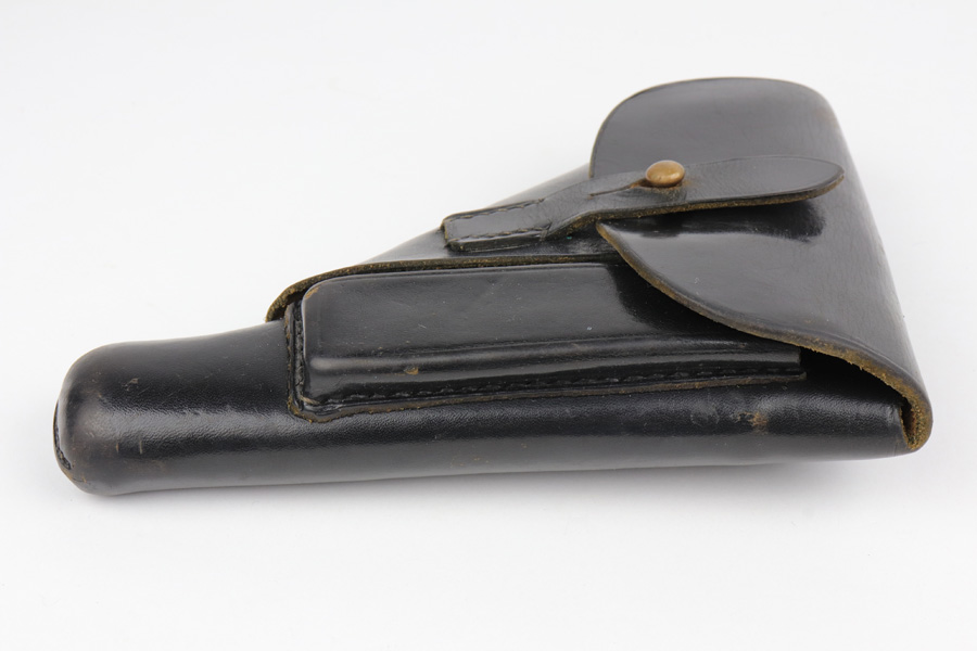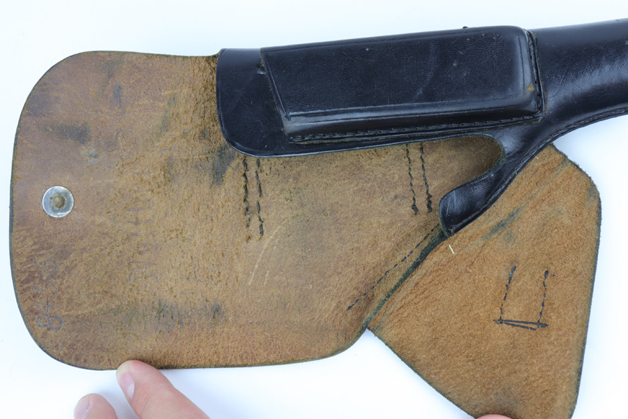 7/10/19 – This is an early AKAH production Walther PP holster. Likely made in the early 1930s / mid 1930s. Note the early brass closure knob. The leather is black and in excellent condition overall. There’s faint remnant of the interior ink stamp “Walther P.P.”. Stitching is all original and in tact.