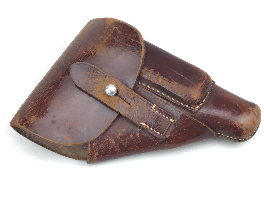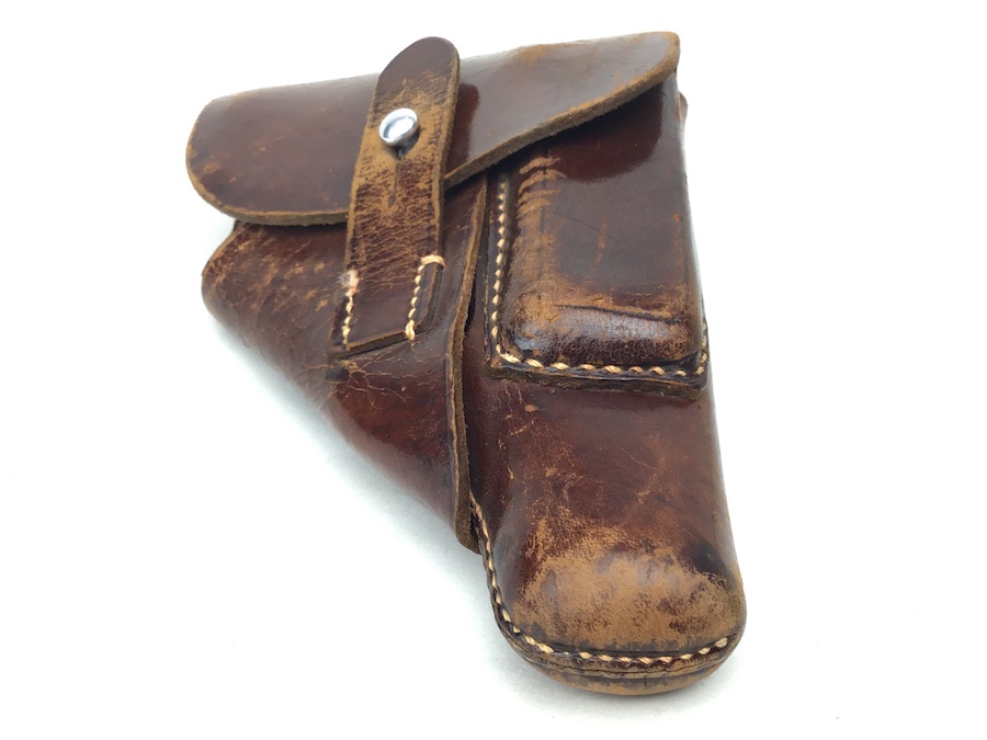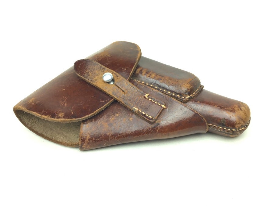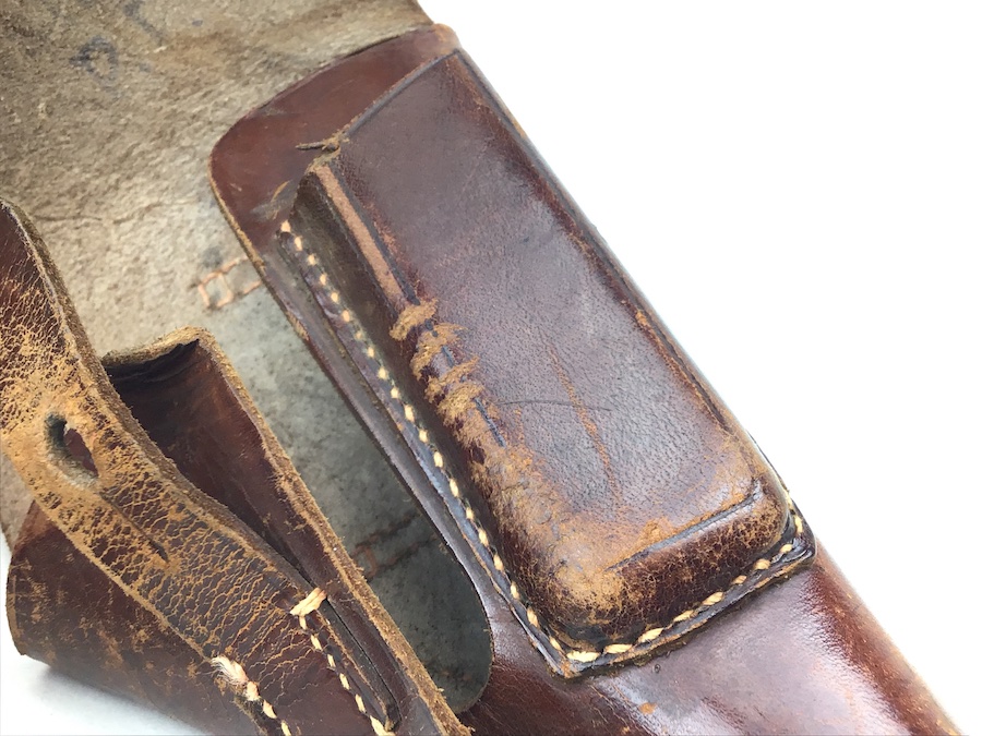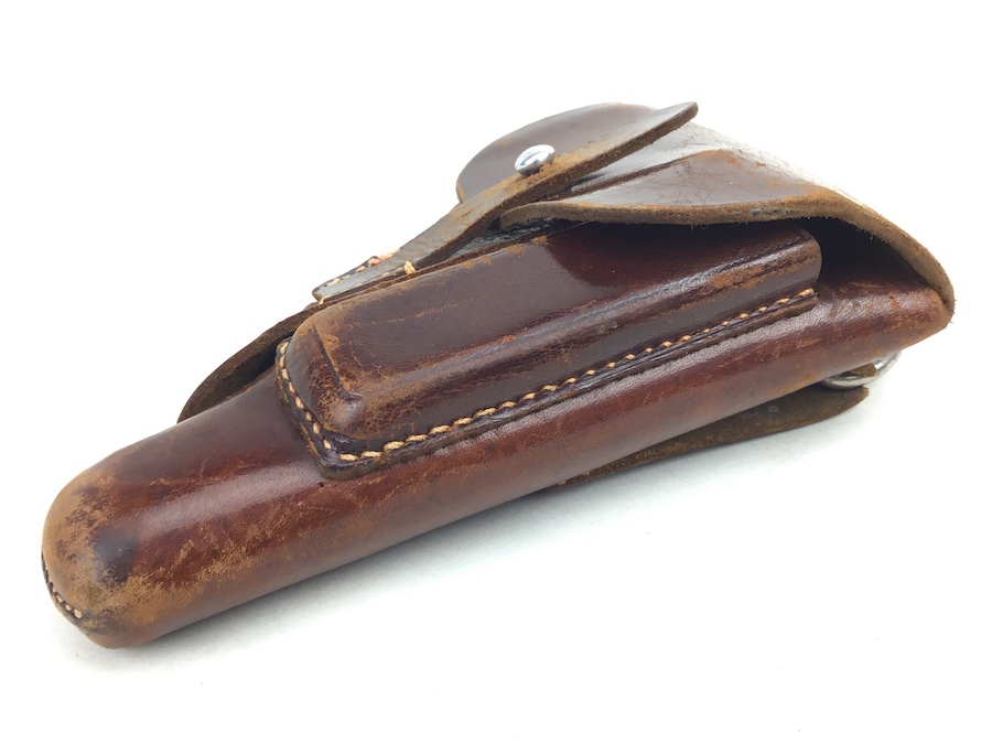 2/25/20 – This is an original AKAH Walther PPK holster from WW2. This is a later WWII production holster with a steel closure strap button. The holster is AKAH DRGM maker stamped under the closure strap. The brown leather is strong and fairly firm with some surface wear and scuffs. Some minor cracking on the mag pouch and the closure flap. The stitching is all tight and original with minor looseness on the closure strap, however, it is secure.  Overall a nice holster. The interior leather is fairly clean with faint “PPK” ink stamp. Includes a “D” ring attachment on the belt loop for a shoulder holster. Quite possibly used by the German police.