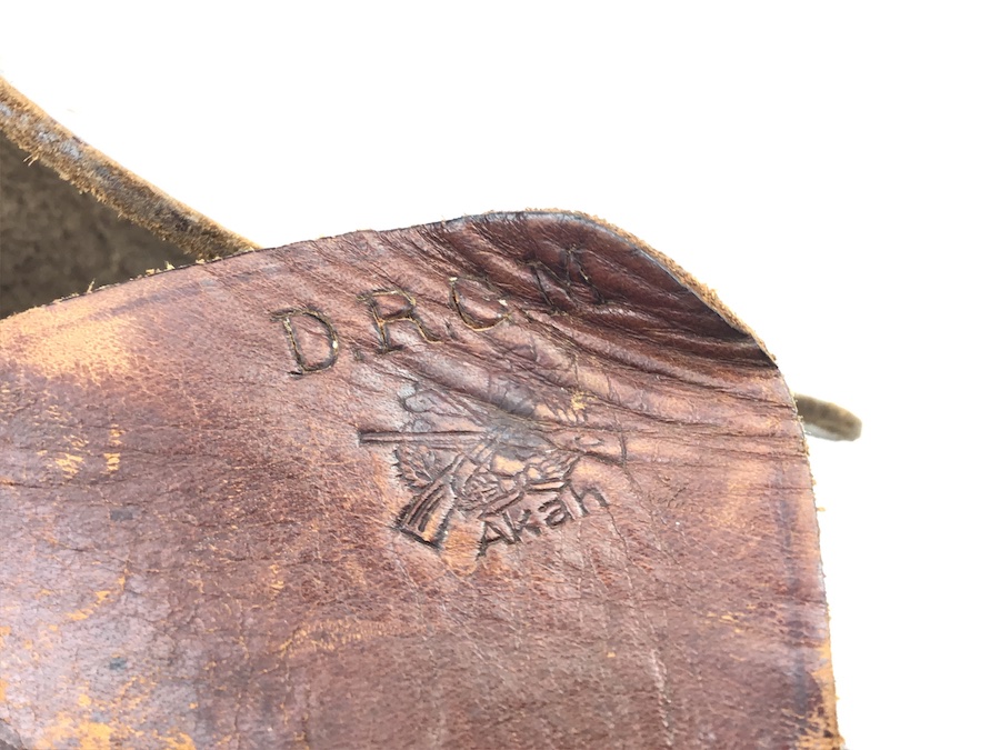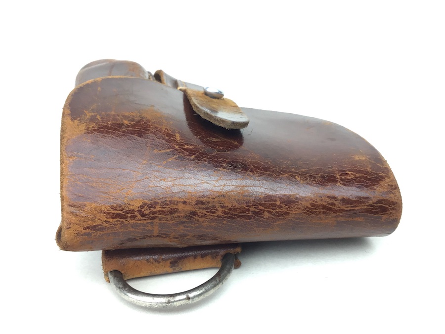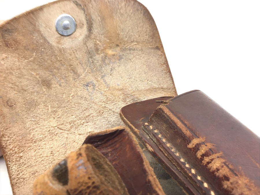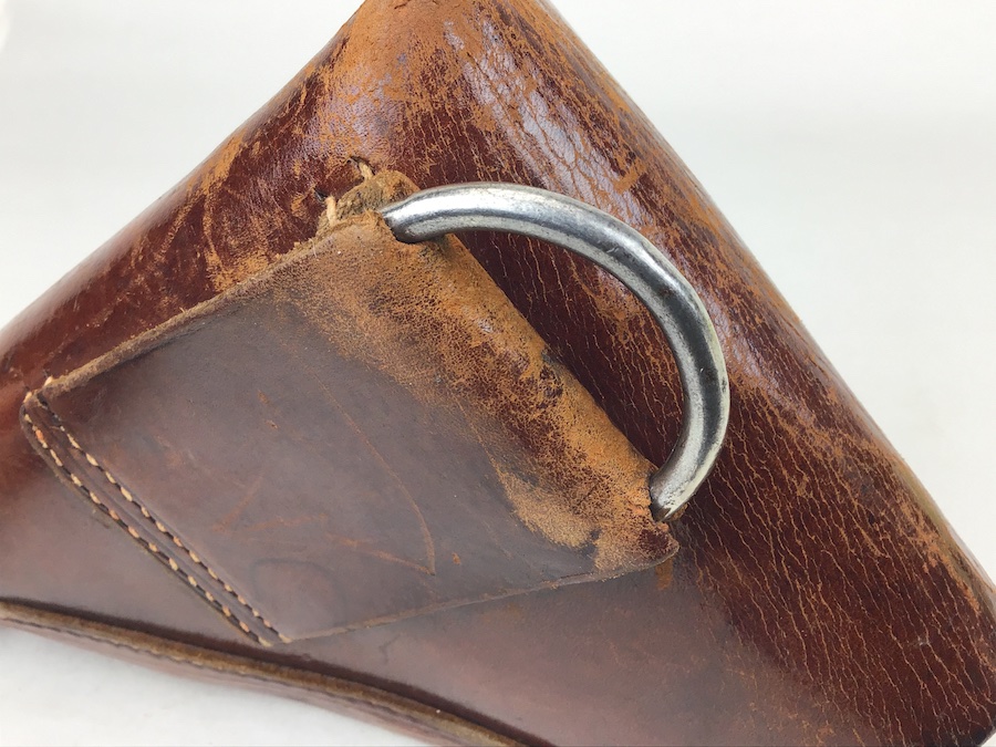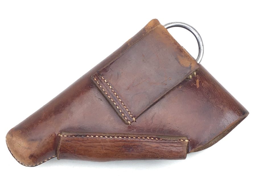 2/25/20 – This is an original AKAH Walther PPK holster from WW2. This is a later WWII production holster with a steel closure strap button. The holster is AKAH DRGM maker stamped under the closure strap. The brown leather is strong and fairly firm with some surface wear and scuffs. Some minor cracking on the mag pouch and the closure flap. The stitching is all tight and original with minor looseness on the closure strap, however, it is secure.  Overall a nice holster. The interior leather is fairly clean with faint “PPK” ink stamp. Includes a “D” ring attachment on the belt loop for a shoulder holster. Quite possibly used by the German police.
