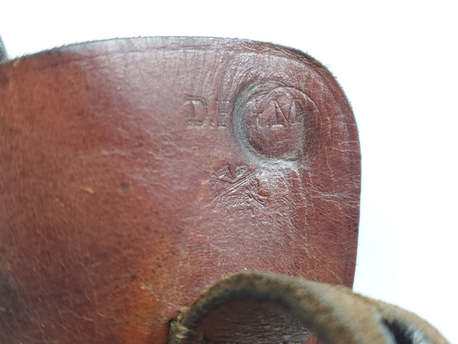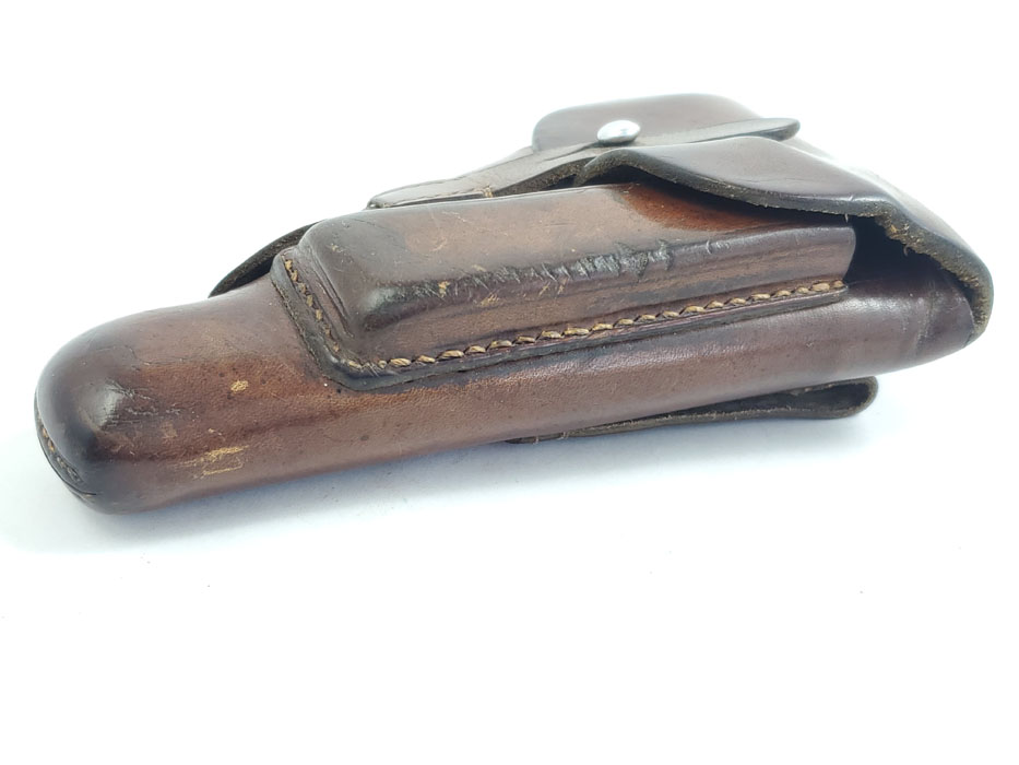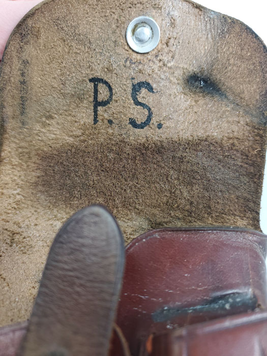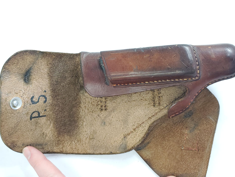 5/22/20 – This is a nice wartime production AKAH Walther PPK holster. The holster is AKAH D.R.G.M. stamped under the closure flap. The brown leather has no major issues, and shows typical signs of use and aging. The original stitching is completely in tact. The interior leather has the initials P.S. written in ink. Otherwise clean interior leather.