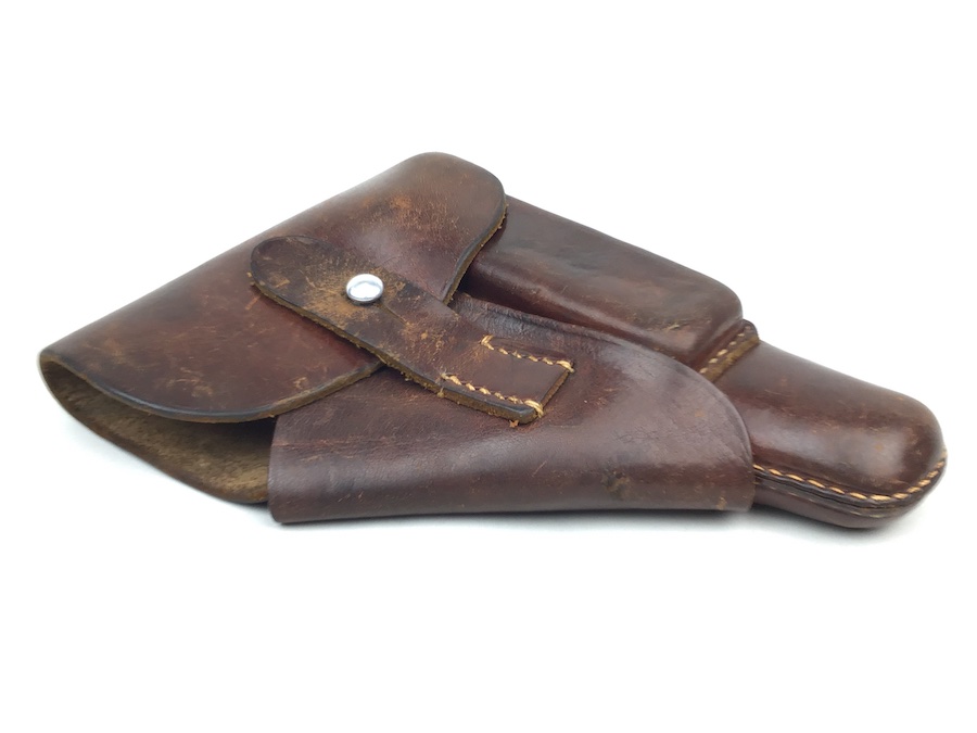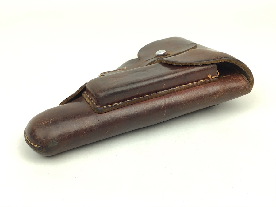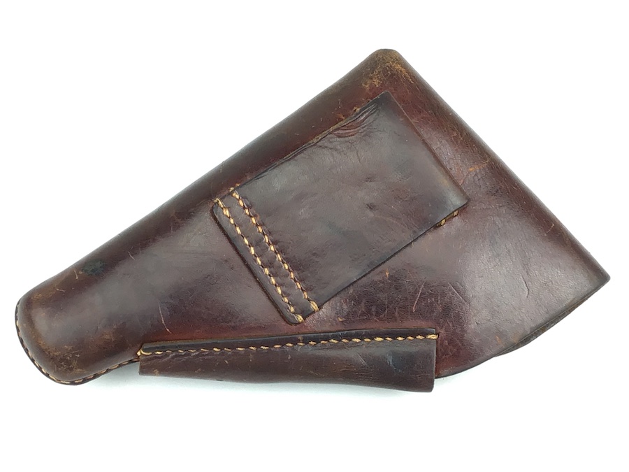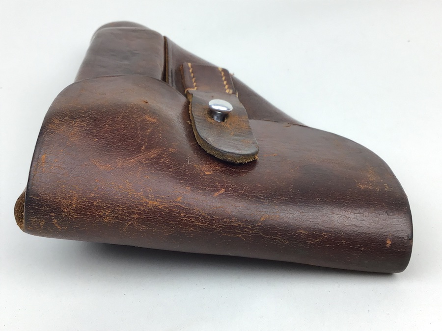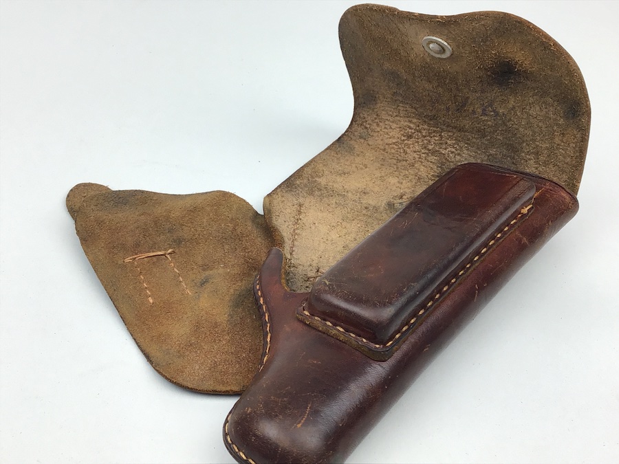 6/23/20 – This is an original AKAH Walther PPK holster from WW2. This is a later WWII production holster with a steel closure strap button. The holster is AKAH DRGM maker stamped under the closure strap. The brown leather is strong and fairly firm with minimal surface wear and scuffs. Ink stamped under the flap “WALTHER PPK”. The stitching is all tight and original. Overall a nice holster.