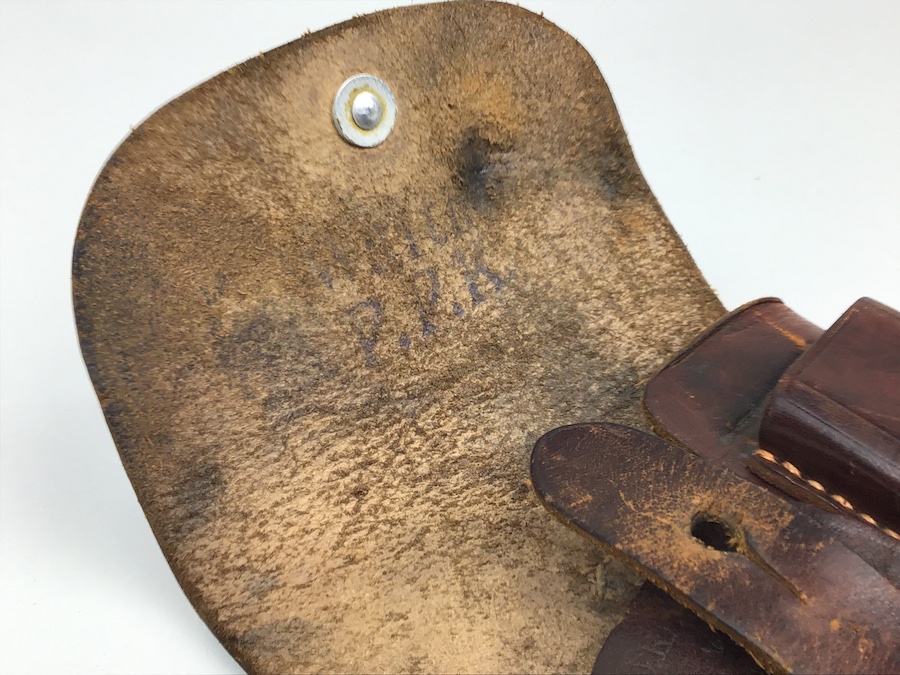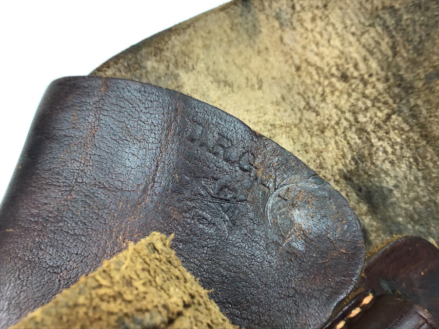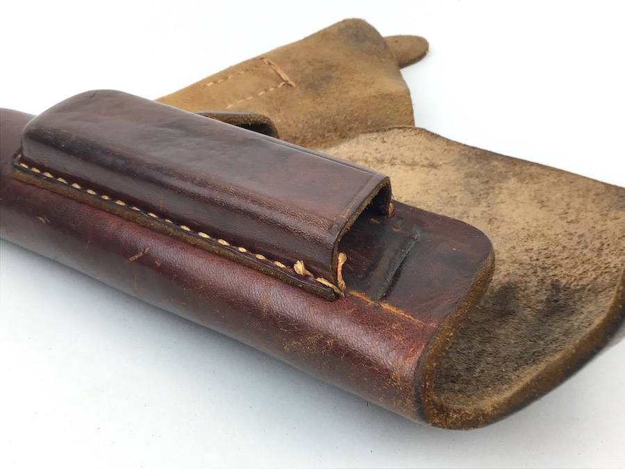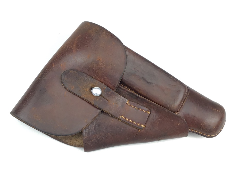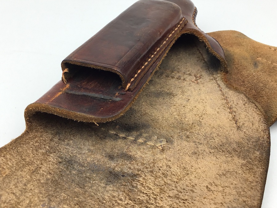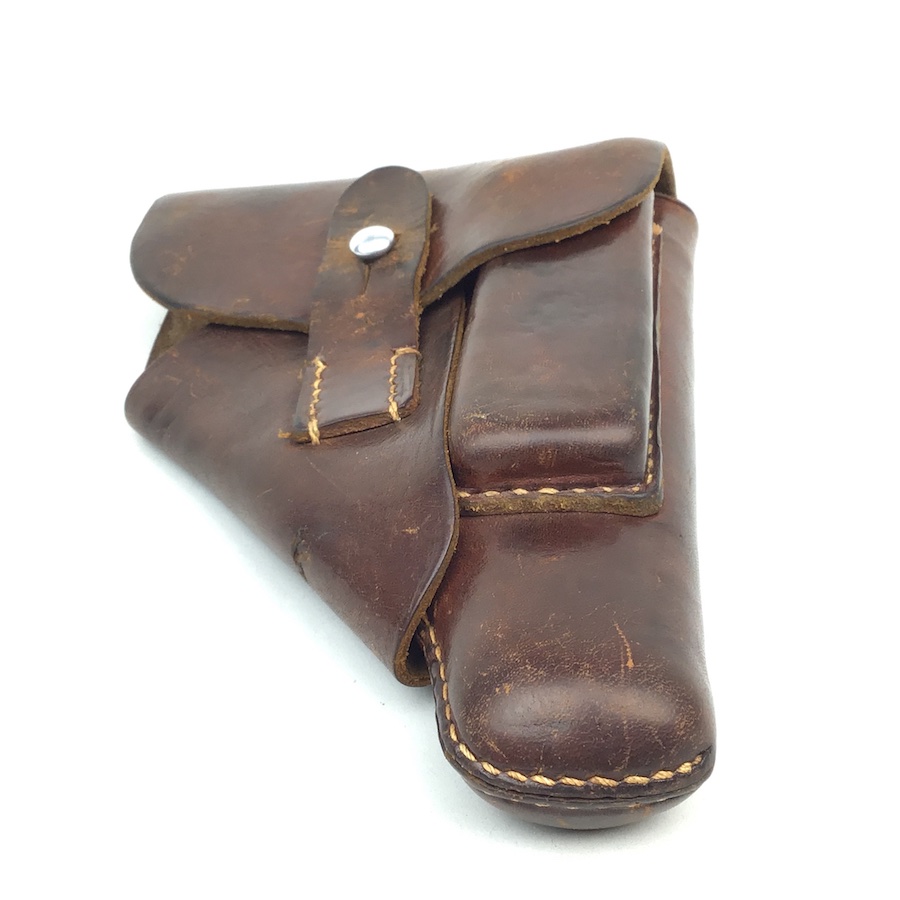 6/23/20 – This is an original AKAH Walther PPK holster from WW2. This is a later WWII production holster with a steel closure strap button. The holster is AKAH DRGM maker stamped under the closure strap. The brown leather is strong and fairly firm with minimal surface wear and scuffs. Ink stamped under the flap “WALTHER PPK”. The stitching is all tight and original. Overall a nice holster.
