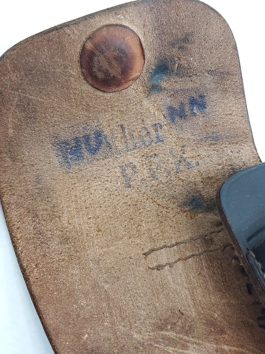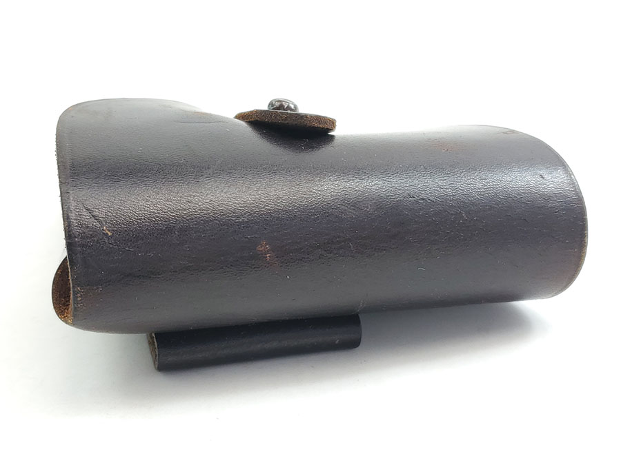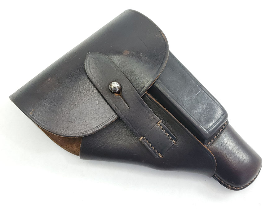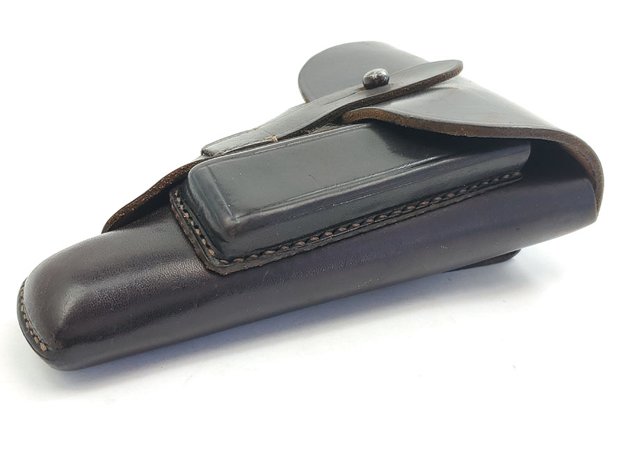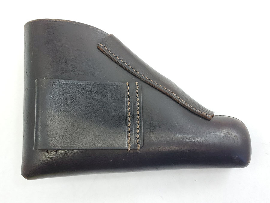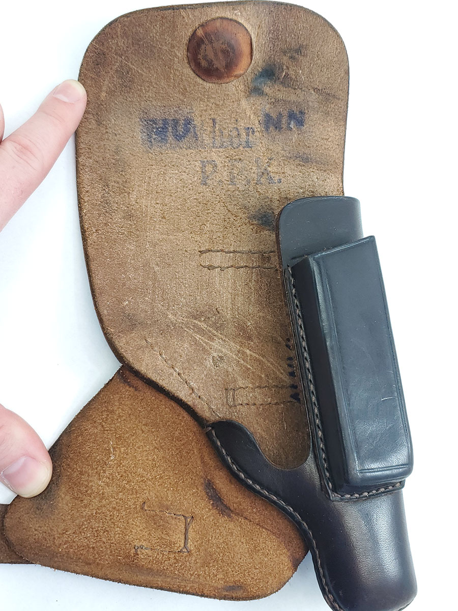 7/17/20 – This is an original AKAH DRGM Walther PPk holster. The holster has very nice dark brown leather that is strong and has normal pliability. The stitching is all original and excellent. The interior Walther PPK ink stamp is still somewhat visible as well. Strong AKAH DRGM maker stamp under the closure strap. Overall the holster is in excellent condition except for a name written in the interior leather. This is a very minor issue on an excellent holster.