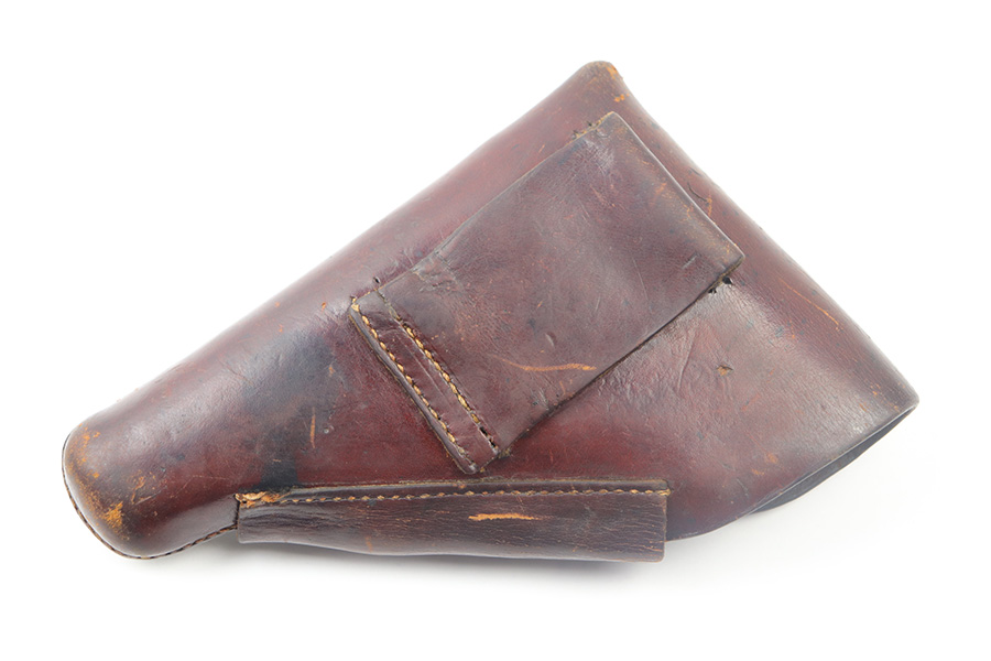 5/24/21 – This an original WW2 AKAH holster for a Walther PPK. The holster has an AKAH DRGM stamp under the closure strap. The brown leather shows signs of wear and scuffing but is function and firm leather. The closure strap has some curling at the end but is in okay condition otherwise. All original stitching intact.