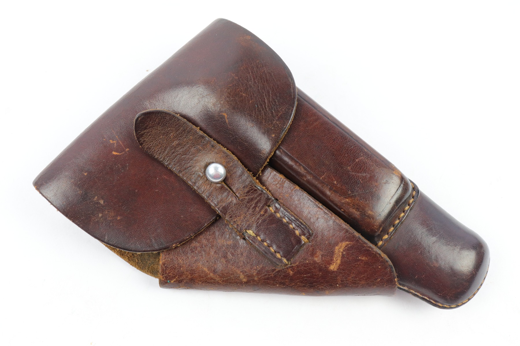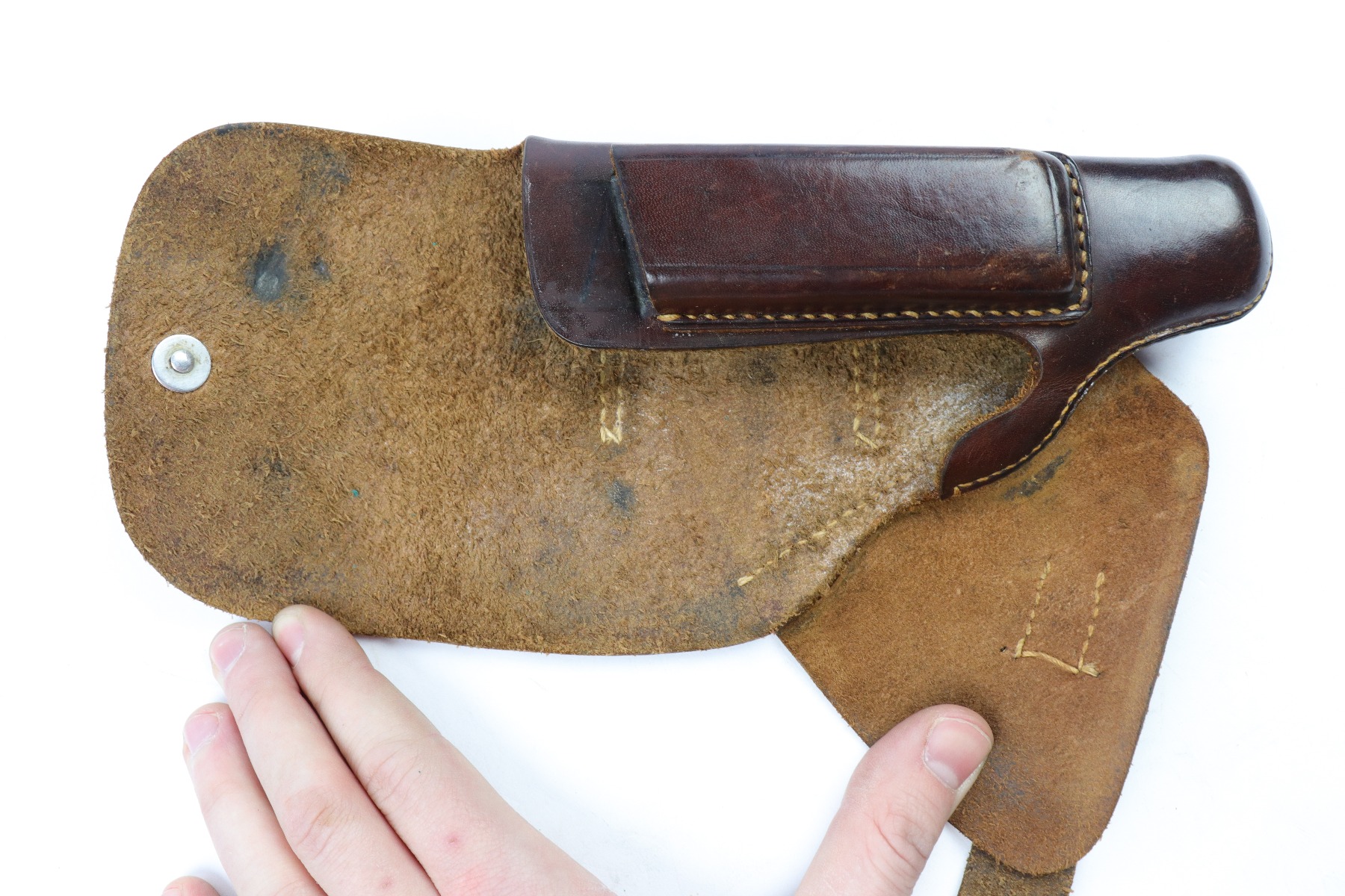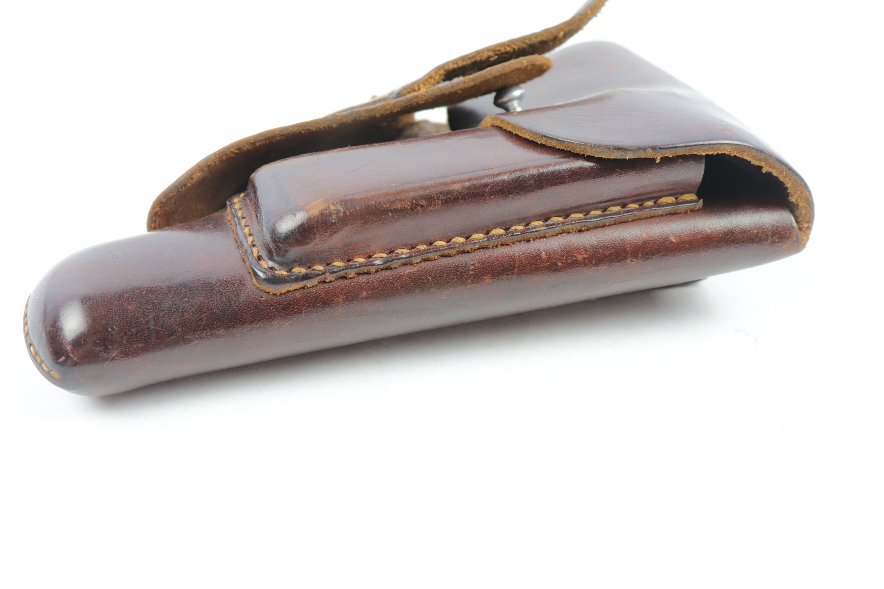 4/10/18 – This is a typical WW2 military production Walther PPK holster made by AKAH. The holster is stamped under the closure strap with an AKAH DRGM maker stamp. The leather has normal use and aging wear, leaving the leather pliable and soft. There’s some minor exterior scuffs and interior raggedness, but this is all honest wear. The stitching is all original and in tact.