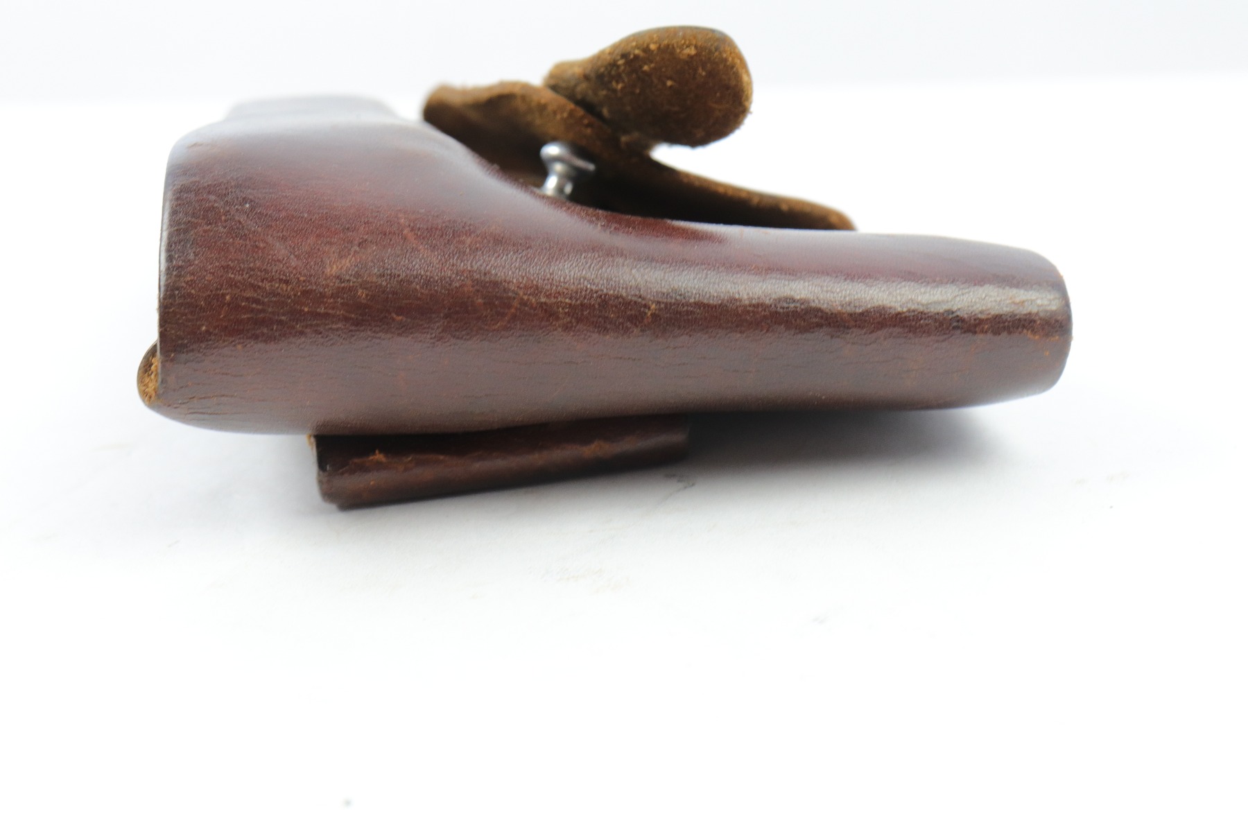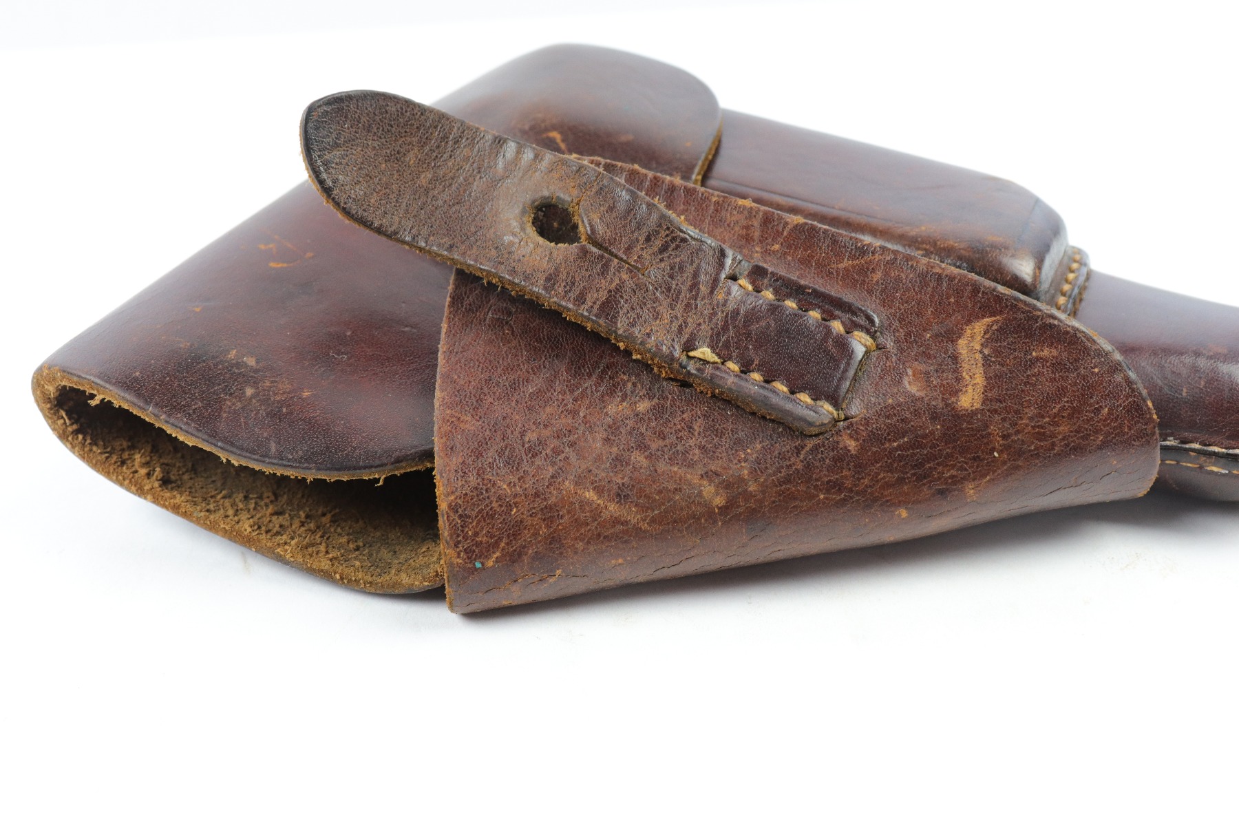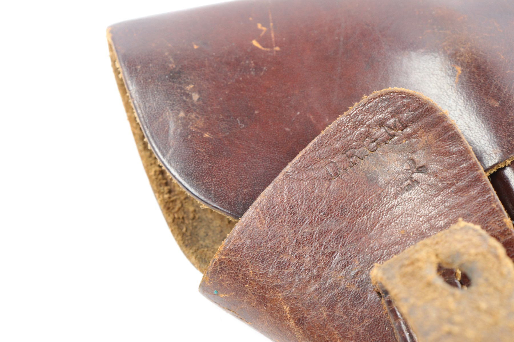 4/10/18 – This is a typical WW2 military production Walther PPK holster made by AKAH. The holster is stamped under the closure strap with an AKAH DRGM maker stamp. The leather has normal use and aging wear, leaving the leather pliable and soft. There’s some minor exterior scuffs and interior raggedness, but this is all honest wear. The stitching is all original and in tact.