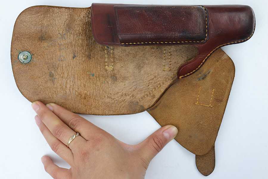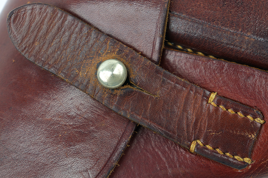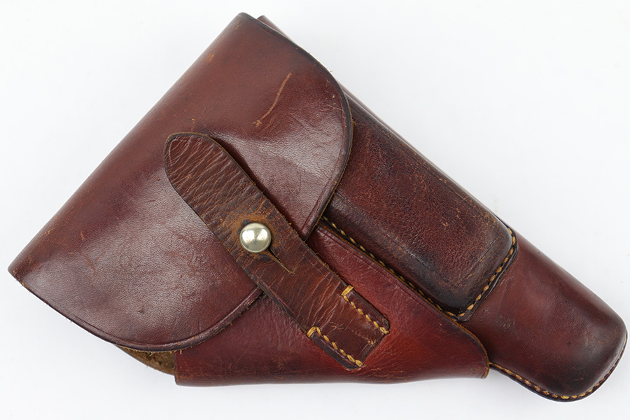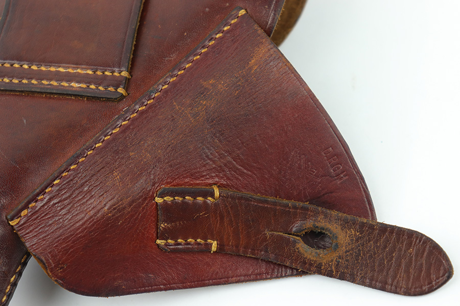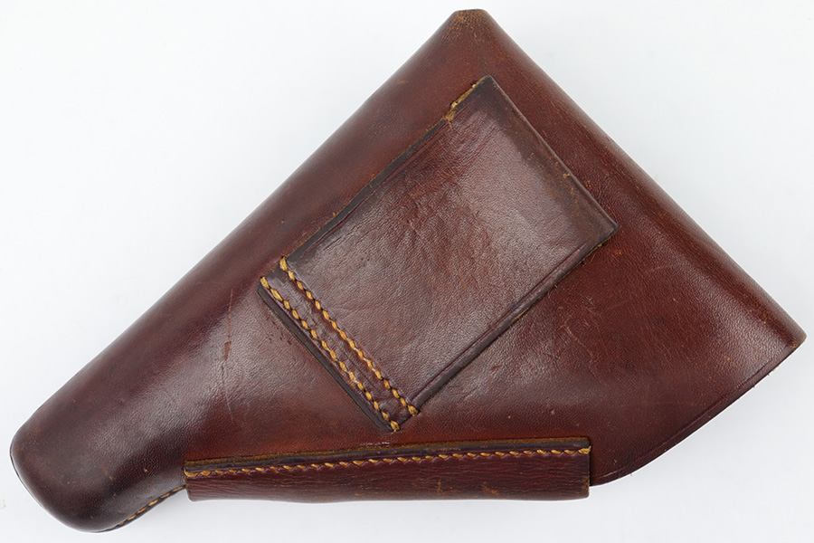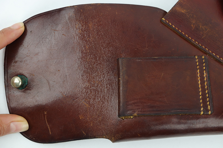 4/27/23 – This is an original WW2 Walther PPK holster made by AKAH. The holster is in great condition with very nice reddish brown leather and all original stitching intact. Some typical signs of aging and mild use wear, but no major issues. Clean interior leather shows traces of the original Walther PPK ink stamp.