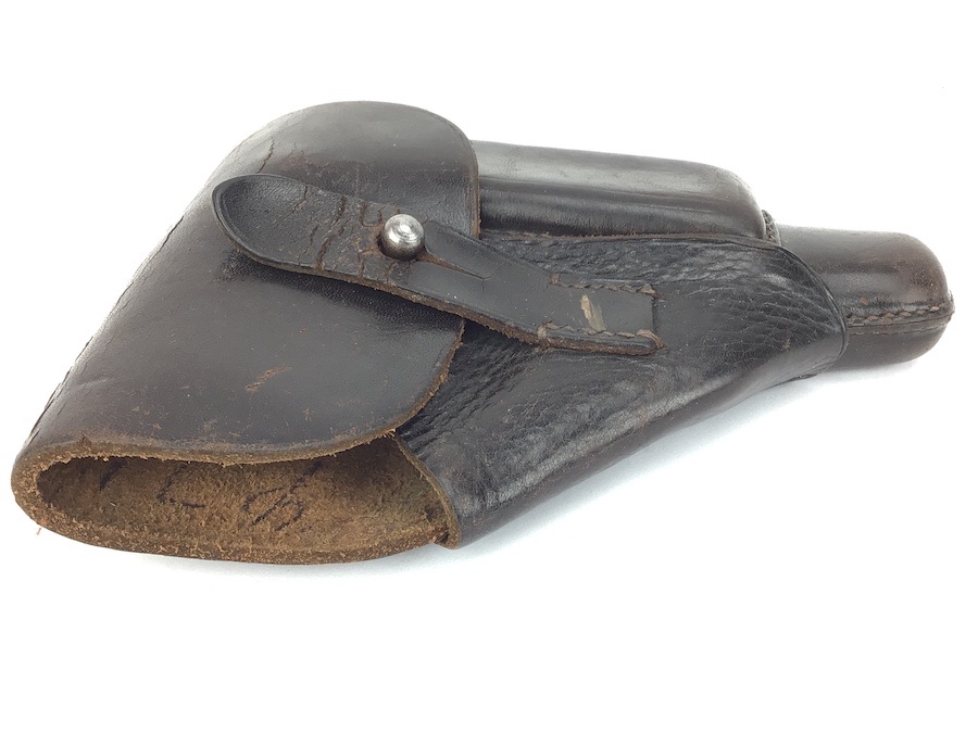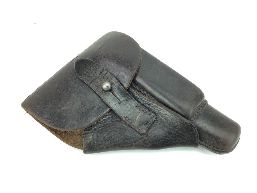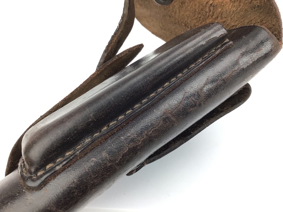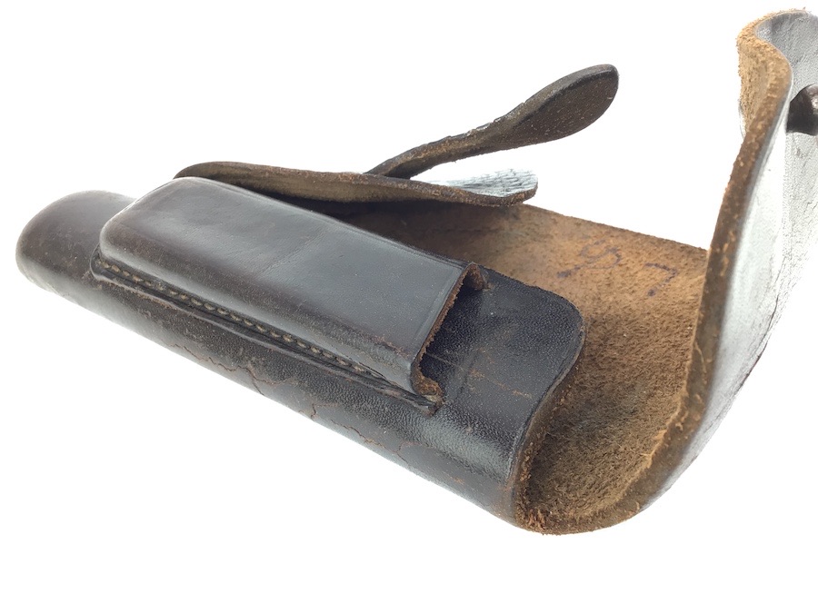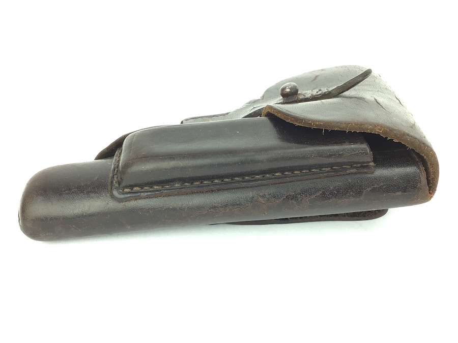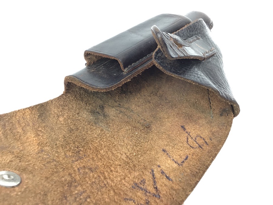 9/24/24 – This is an original AKAH Walther PPK holster from WW2. This is a later WWII production holster with a steel closure strap button. The holster is AKAH DRGM maker stamped under the closure strap. The markings are somewhat worn, but still visible. The black leather is flexible, but shows some age cracking around the folds of the flap the leading edge around the mag pouch. The closure strap shows some cracking as well, however, it is secure. The stitching is all tight and original with no flaws. The interior leather is fairly clean with a faint Walther PPK ink stamp, as well as a hand written name.