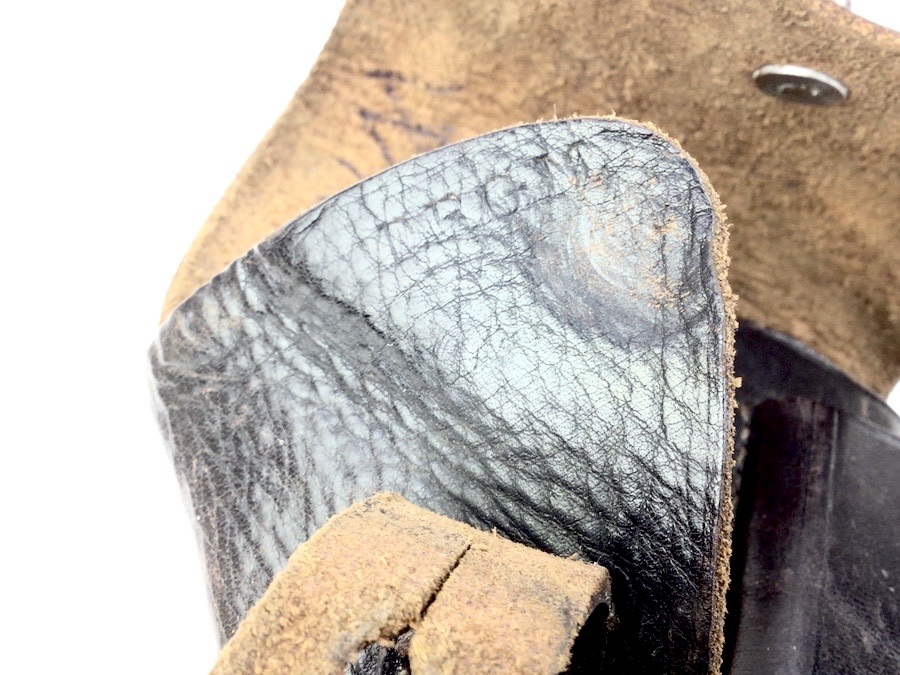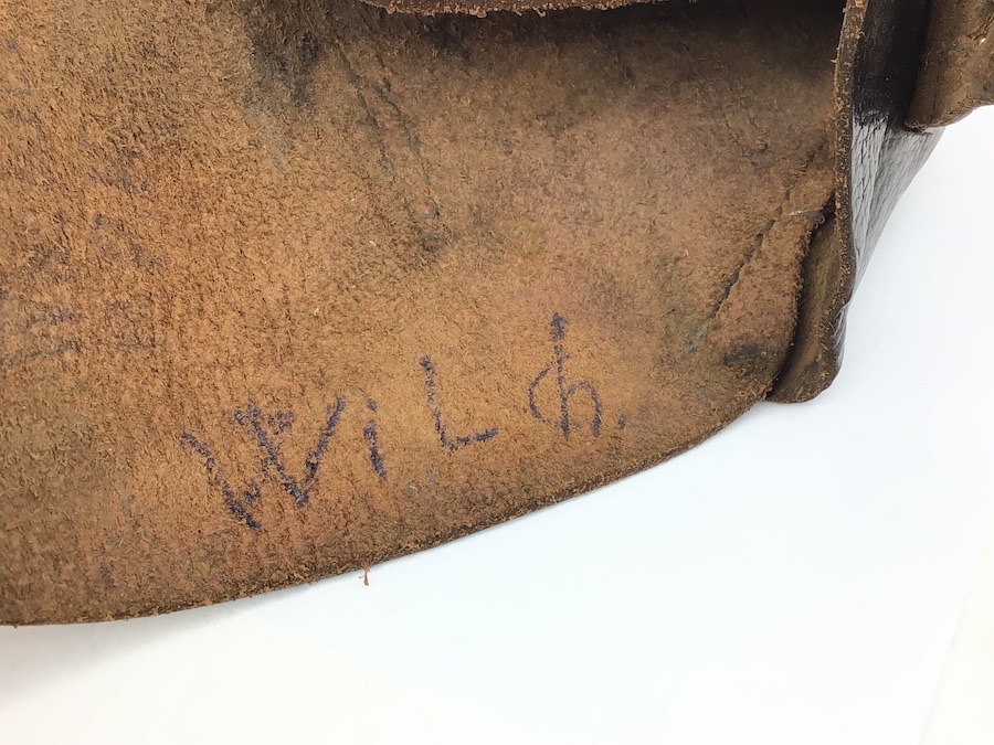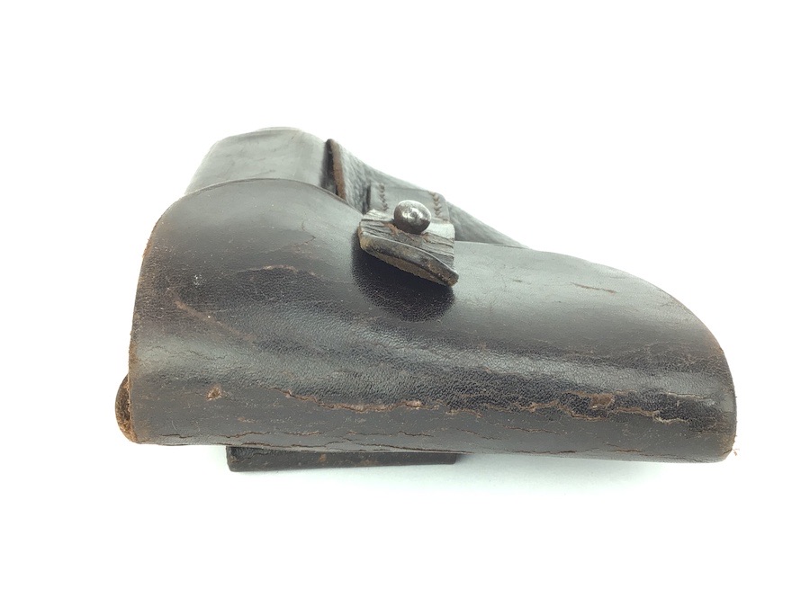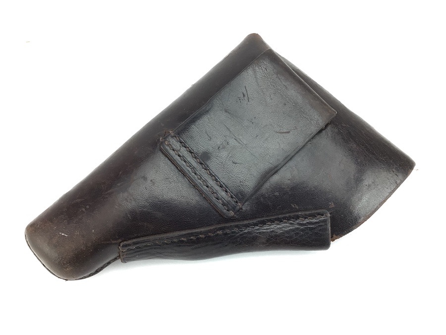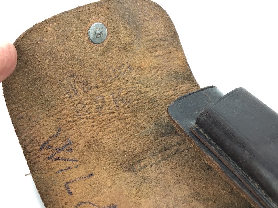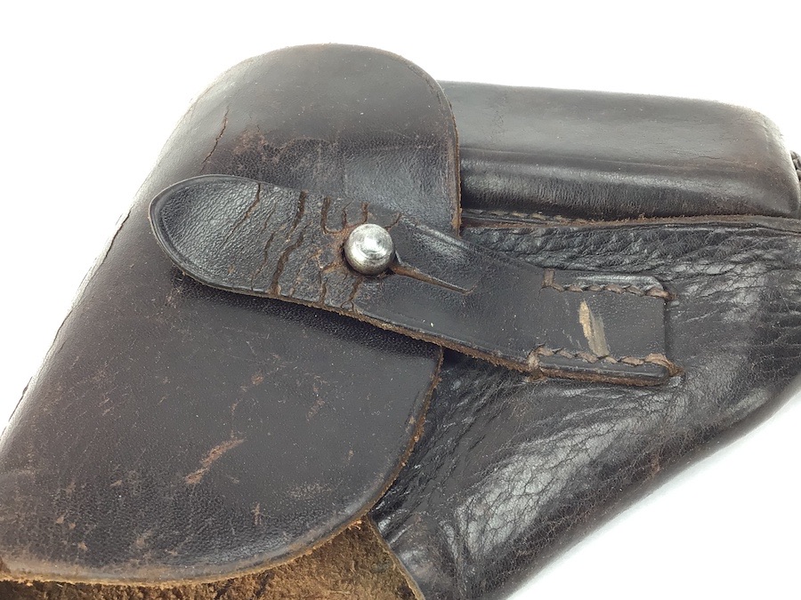 9/24/24 – This is an original AKAH Walther PPK holster from WW2. This is a later WWII production holster with a steel closure strap button. The holster is AKAH DRGM maker stamped under the closure strap. The markings are somewhat worn, but still visible. The black leather is flexible, but shows some age cracking around the folds of the flap the leading edge around the mag pouch. The closure strap shows some cracking as well, however, it is secure. The stitching is all tight and original with no flaws. The interior leather is fairly clean with a faint Walther PPK ink stamp, as well as a hand written name.