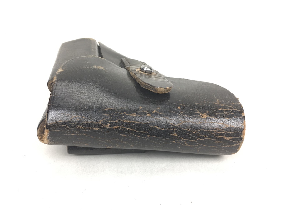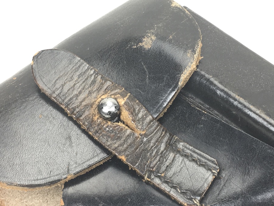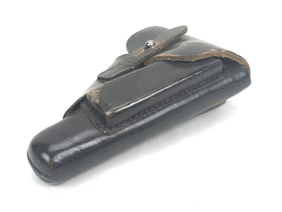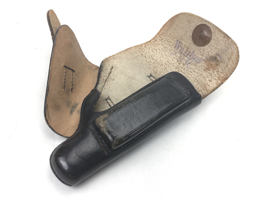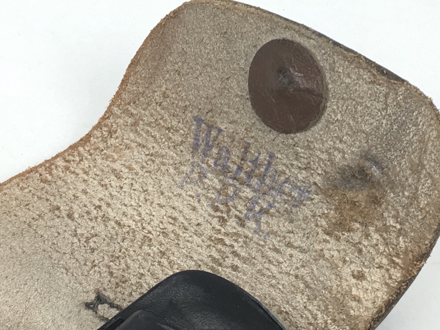 6/26/19 – This is an original AKAH Walther PPK holster. The holster has minimal surface wear on the magazine pouch and the closure flap. A bit of use wear at the stud hole in the strap. The leather and stitching are completely intact. There is an AKAH maker stamp under the closure strap. The Walther PPK ink stamp is clearly visible on the interior leather. Guaranteed original and authentic.