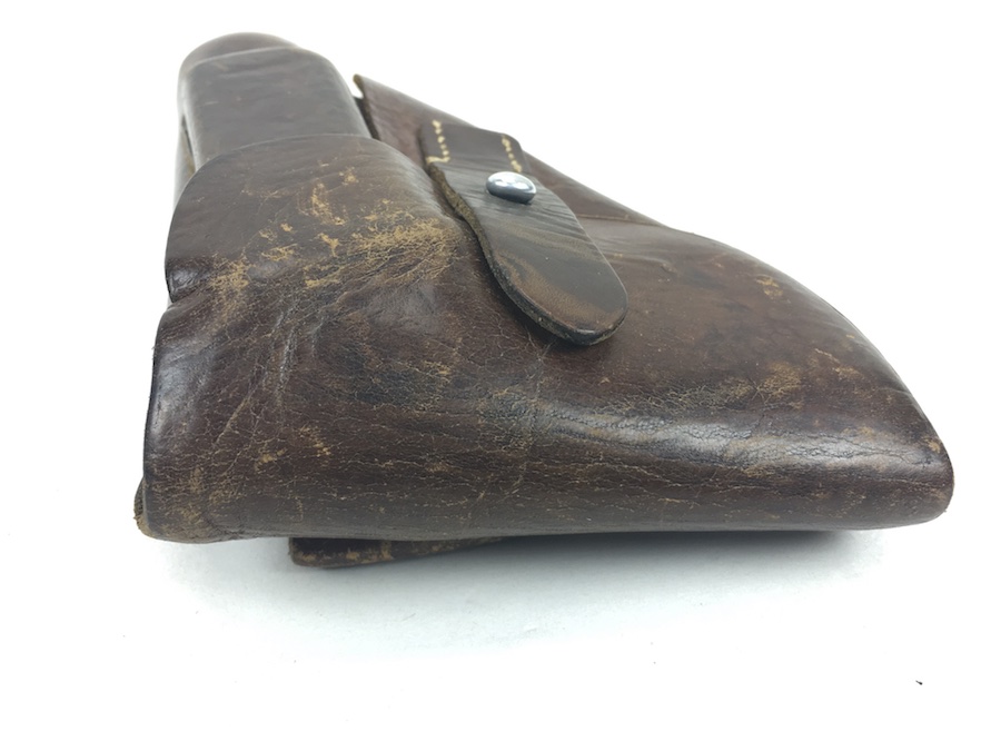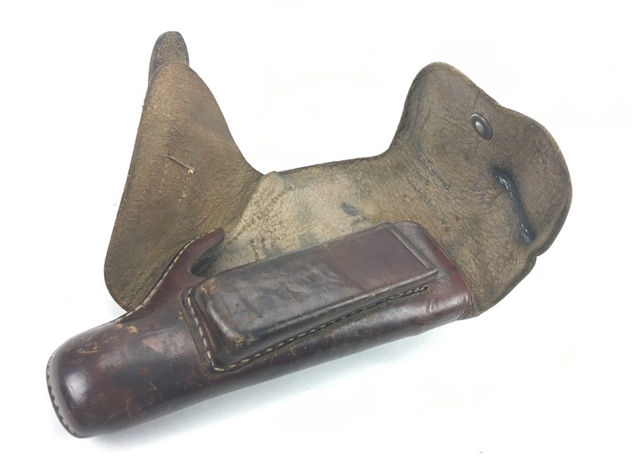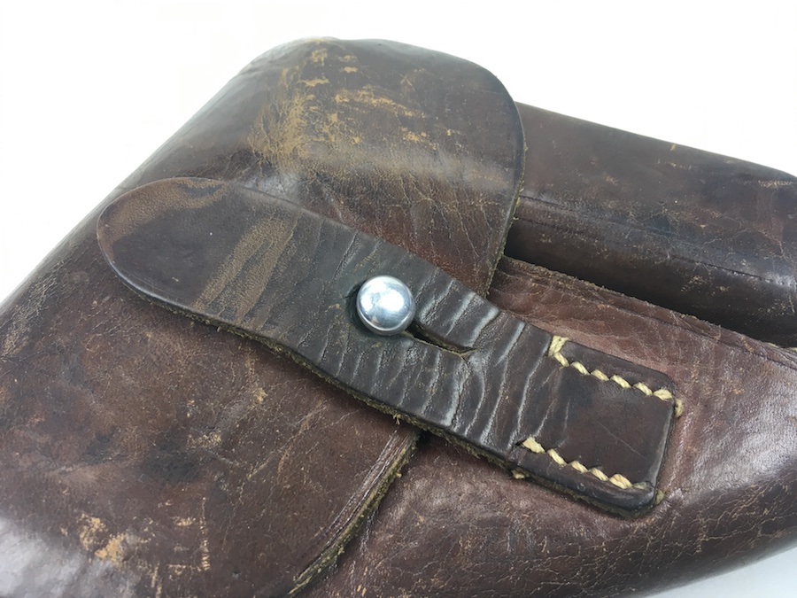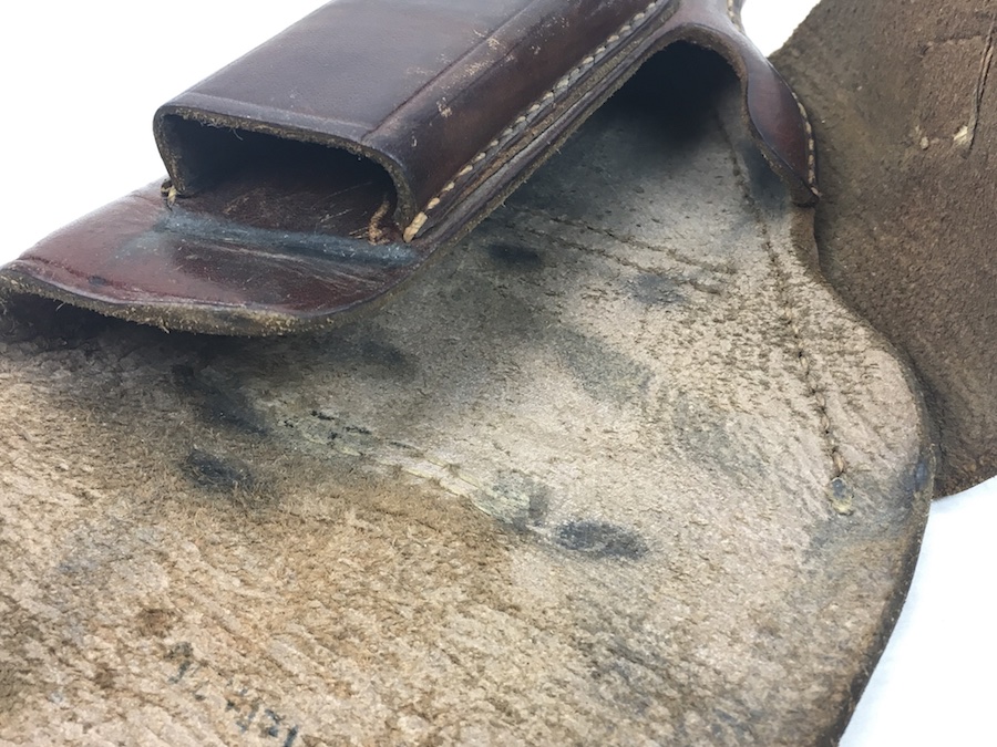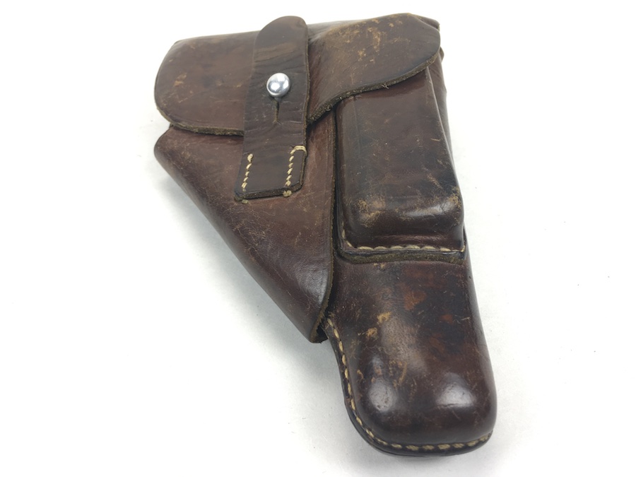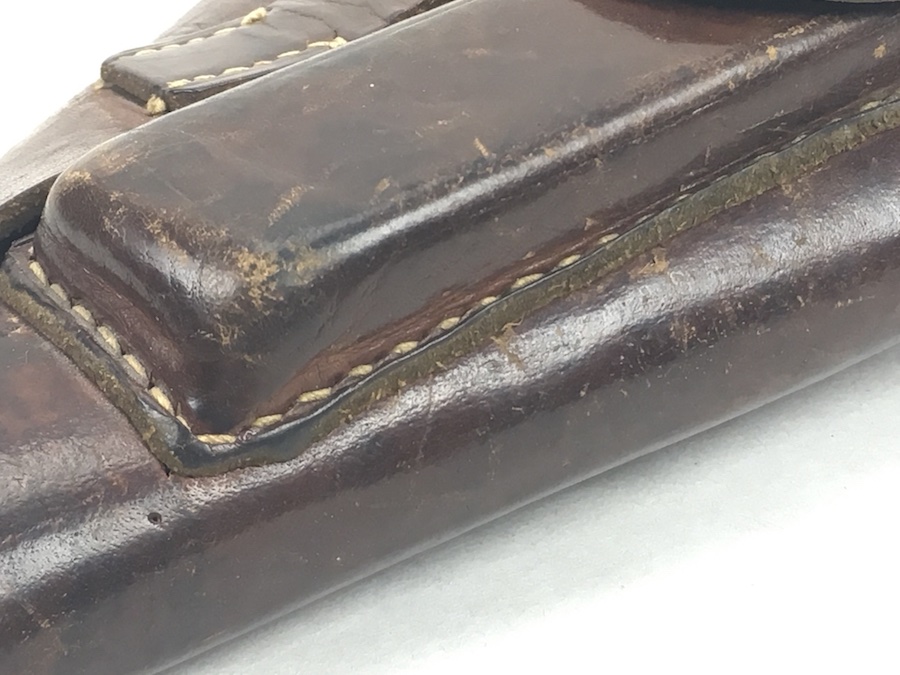 7/17/19 – This is an original AKAH Walther PPK holster from WW2. This is a later WWII production holster with a steel closure strap button. The holster is AKAH DRGM maker stamped under the closure strap. The brown leather is strong and fairly firm with no notable flaws, except for slight wear and surface scuffs. The stitching is all tight and original with no flaws. Overall a great holster. The interior leather is fairly clean with a faint Walther PPK ink stamp.