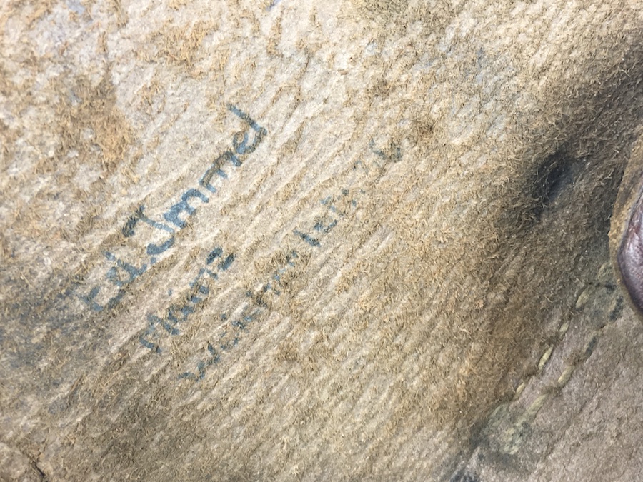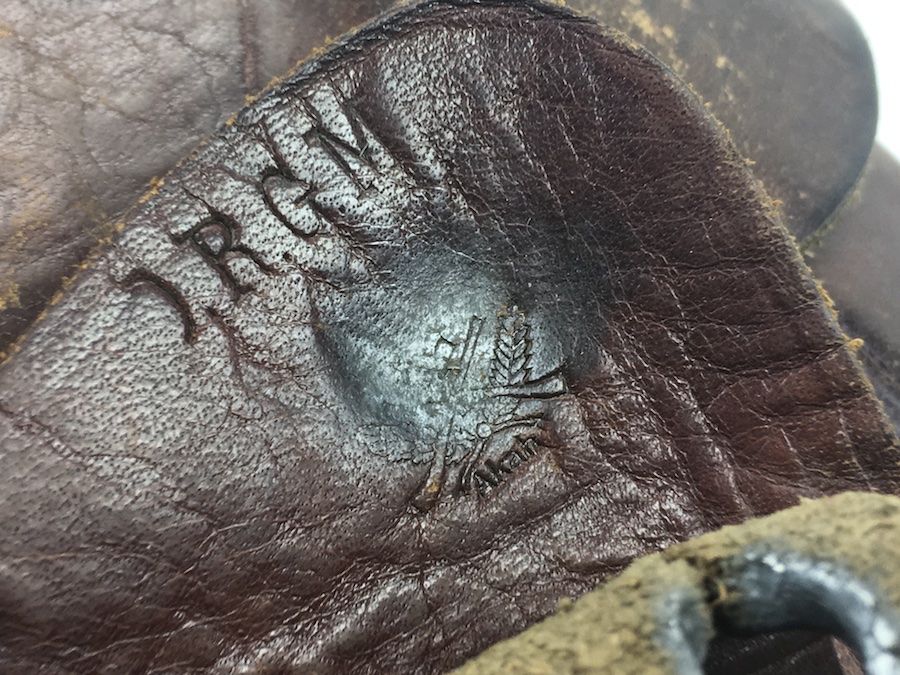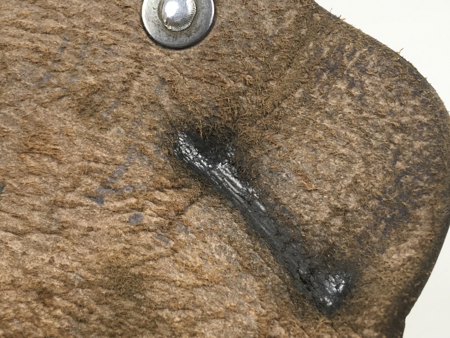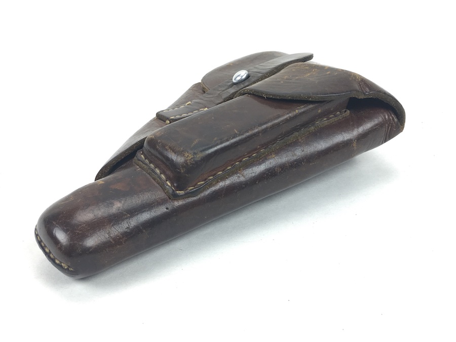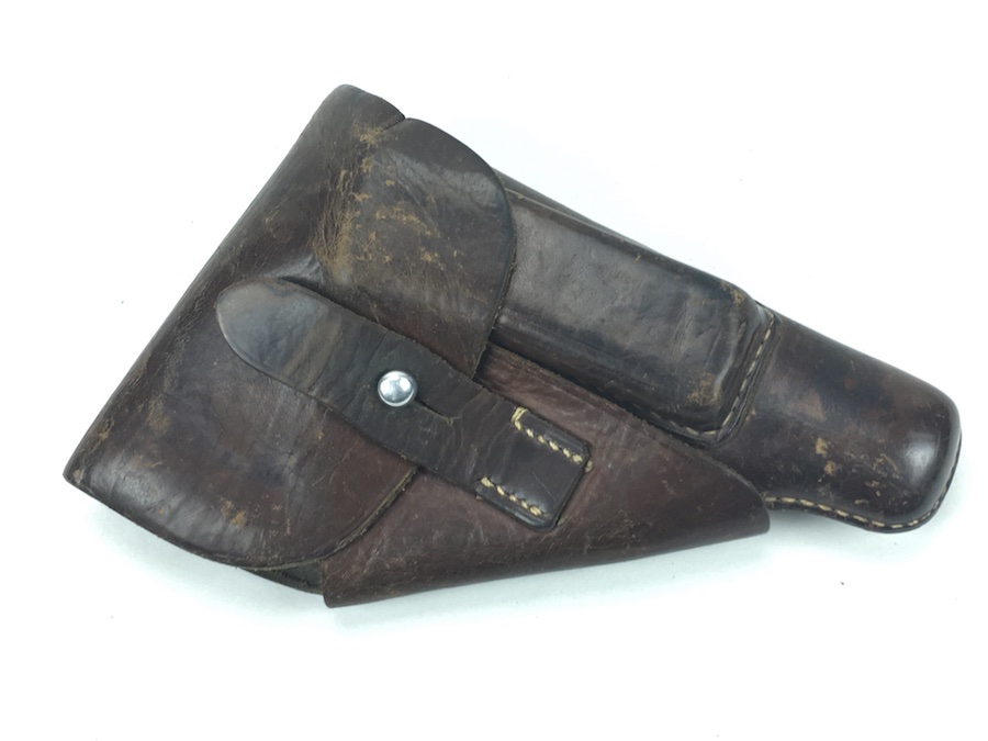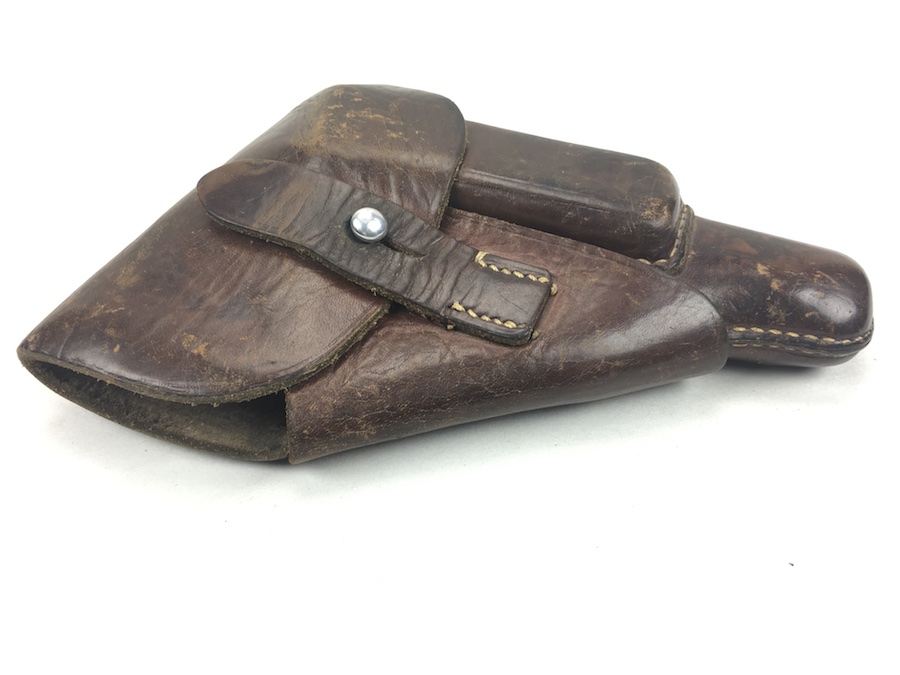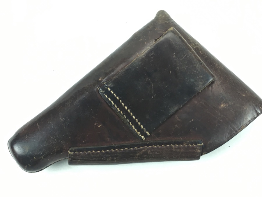 7/17/19 – This is an original AKAH Walther PPK holster from WW2. This is a later WWII production holster with a steel closure strap button. The holster is AKAH DRGM maker stamped under the closure strap. The brown leather is strong and fairly firm with no notable flaws, except for slight wear and surface scuffs. The stitching is all tight and original with no flaws. Overall a great holster. The interior leather is fairly clean with a faint Walther PPK ink stamp.