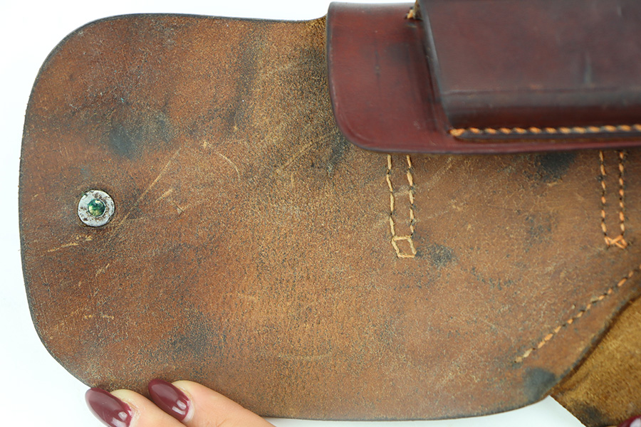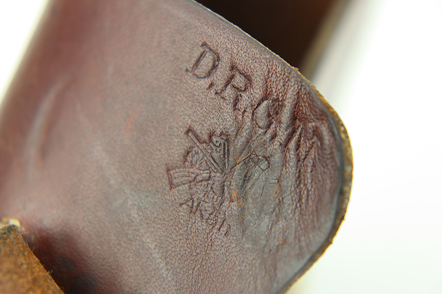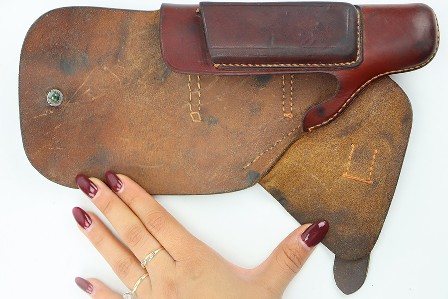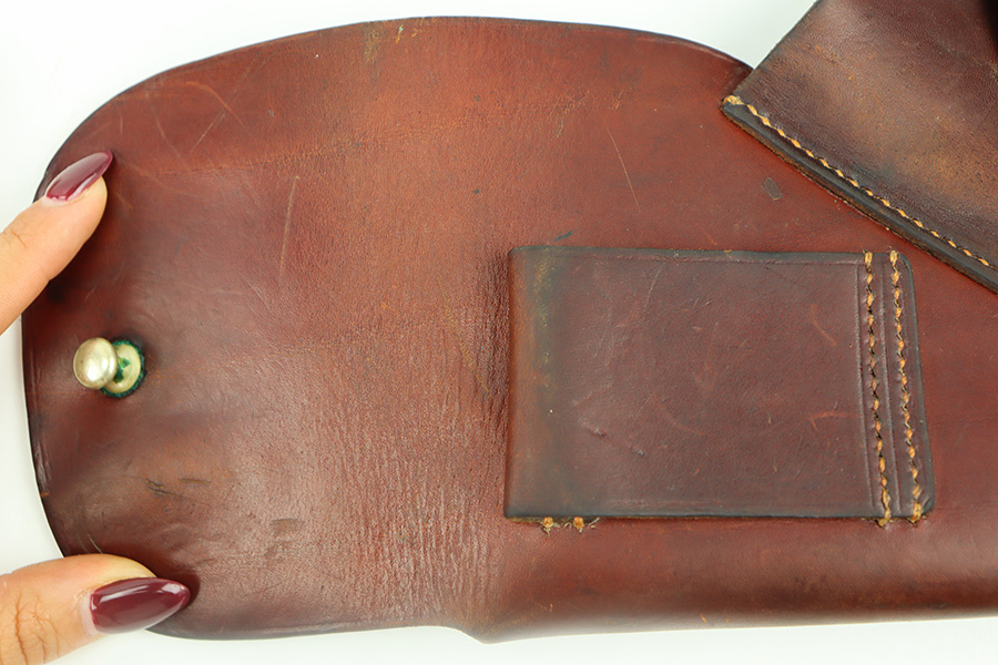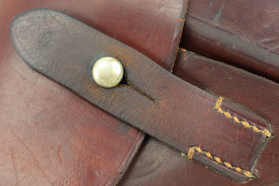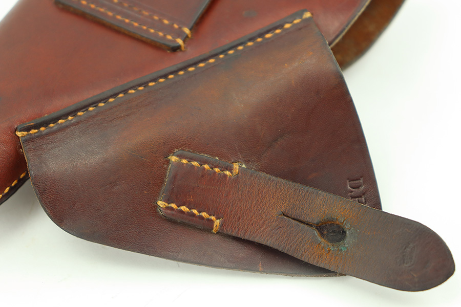 11/28/23 – This is an original WW2 AKAH Walther PPK holster. The holster is in great overall condition with all original leather and stitching. Very clean overall, and a crisp maker stamp under the closure strap. Unfortunately, someone added a waffen military proof stamp on the end of the closure strap. This is not an original stamp, and the price is reduced accordingly. Otherwise a very nice example!