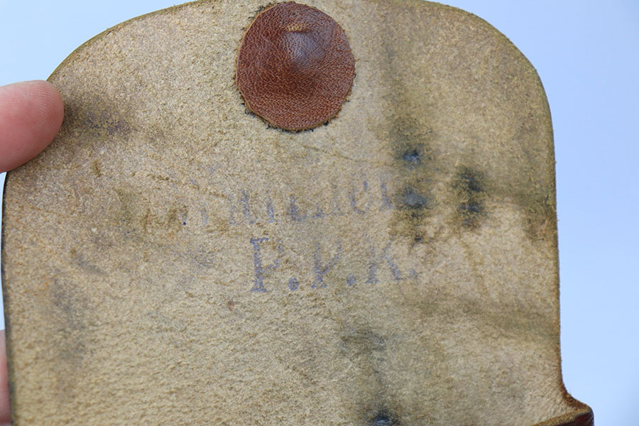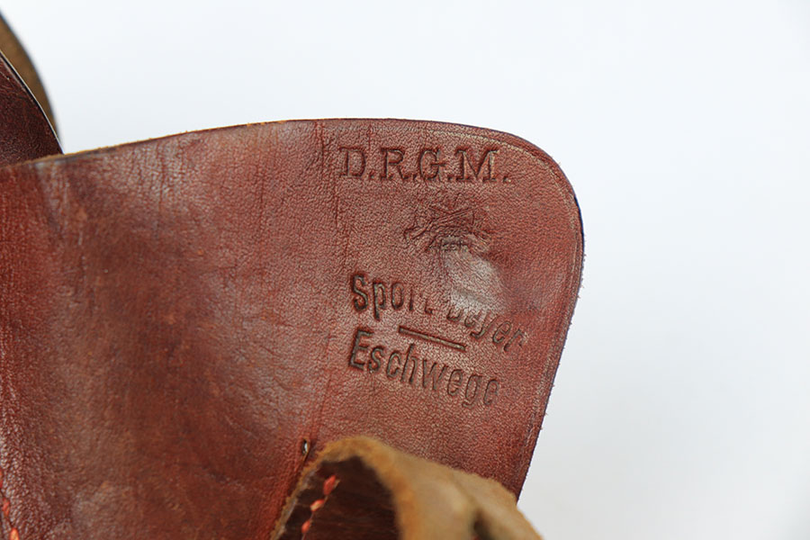 6/25/21 – This is an original, somewhat unique AKAH Walther PPK Holster. The holster is not only maker stamped under the closure strap, but there’s a stamp that appears to read “Sport Beyer, Eschwege”. We’re not sure of the significance of this marking and had a hard time finding another example. The holster has clean leather and excellent stitching. Also has a faint Walther P.P.K. ink stamp on the interior leather.
