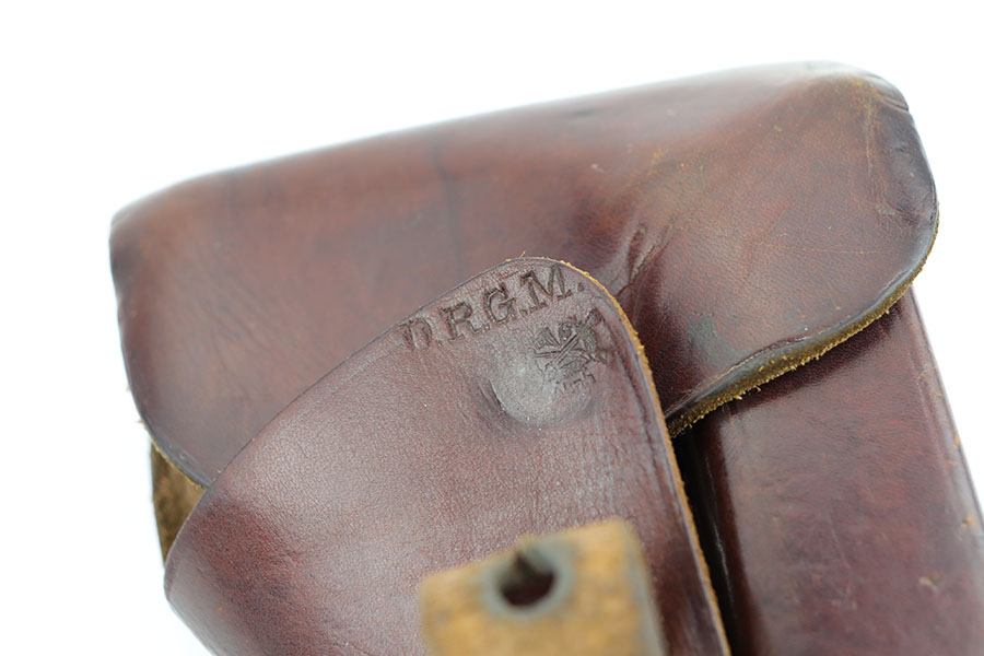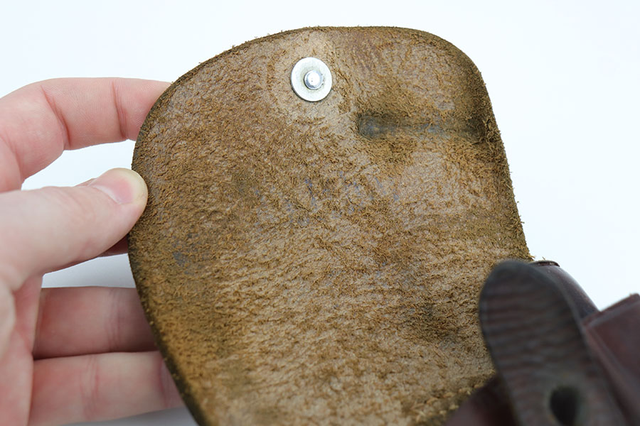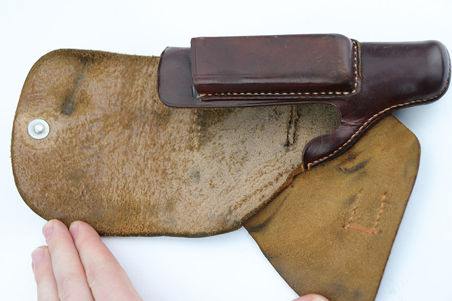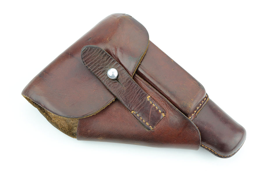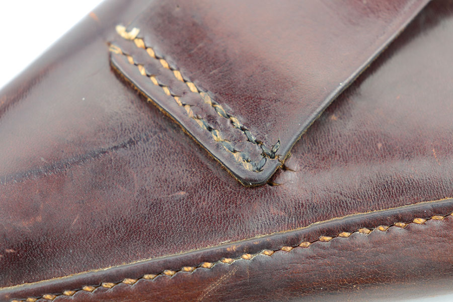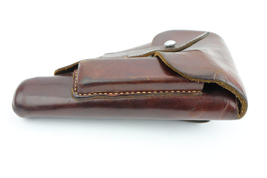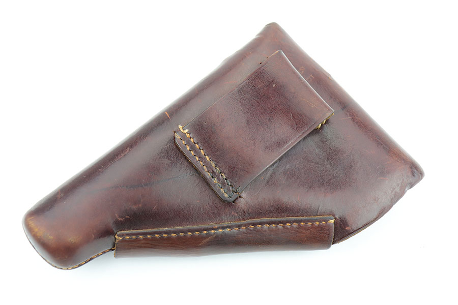 10/16/19 – This is an original AKAH Walther PPK holster from WW2. This is a straight-forward wartime example with a crisp AKAH stamp under the closure strap, and a faint remnant of the original Walther PPK ink stamp on the interior leather. All original leather and stitching in tact.