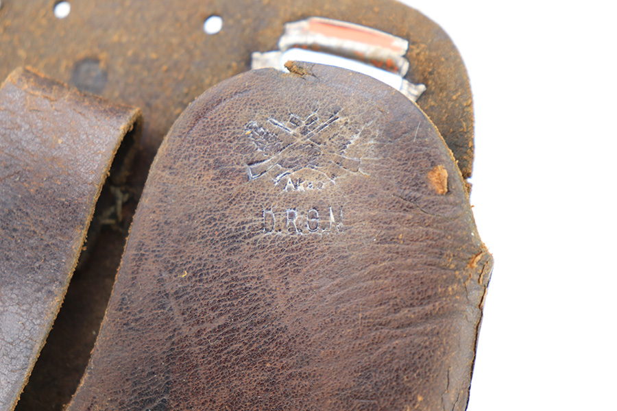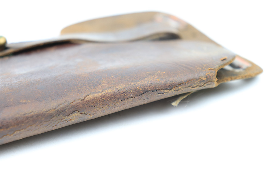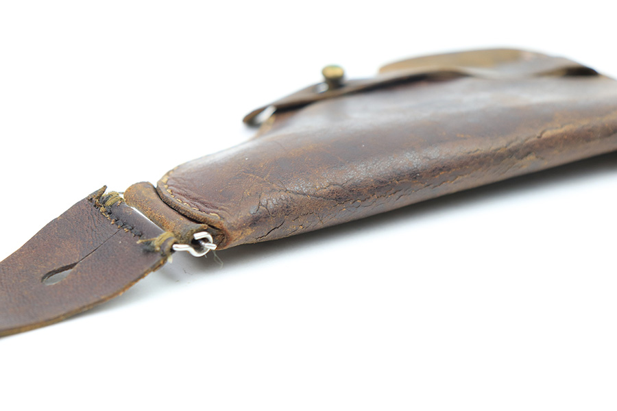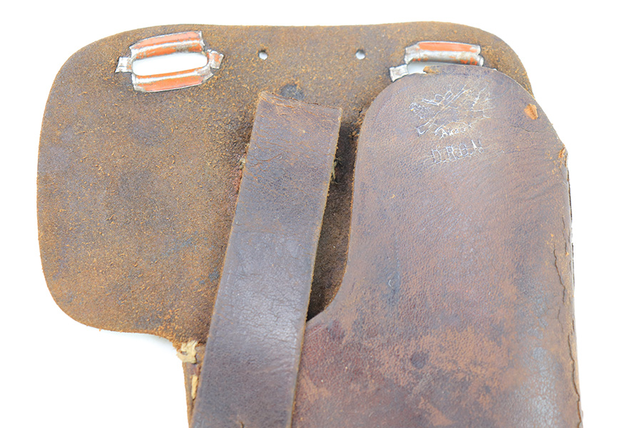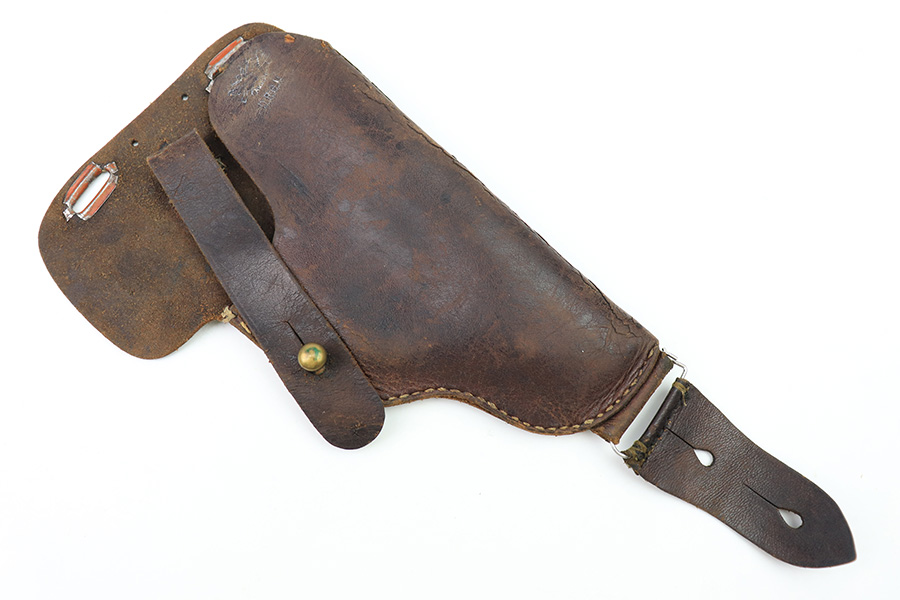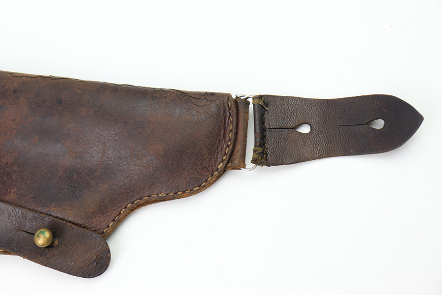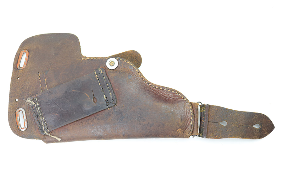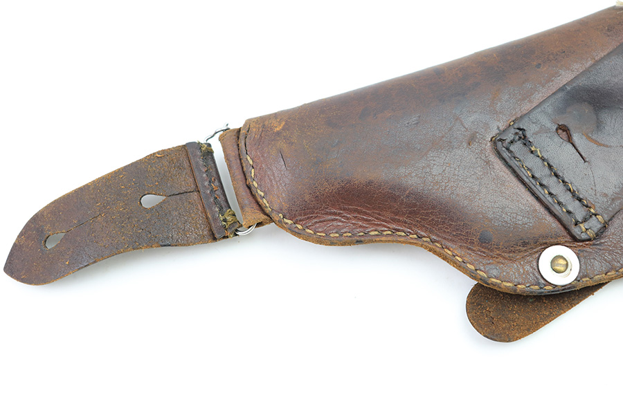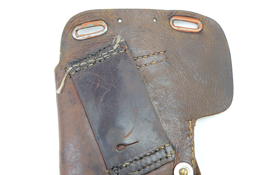 1/4/23 – This is an original WW2 production shoulder holster for a Walther PPK or similar sized 7.65mm pistol. The holster is stamped with an AKAH DRGM maker stamp on the top right corner of the front leather. There are no other markings or stamps. The holster also features an early brass closure knob. The leather is worn with some surface wrinkling and aging throughout. The stitching is original except for on the back belt loop, which has replacement stitching as shown.