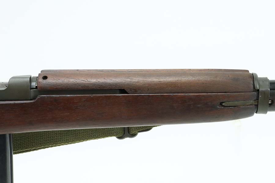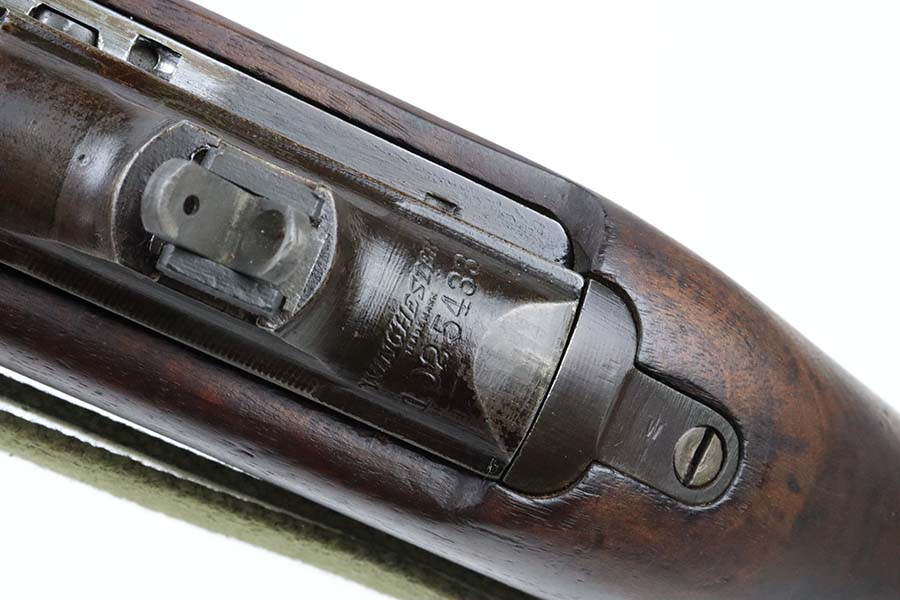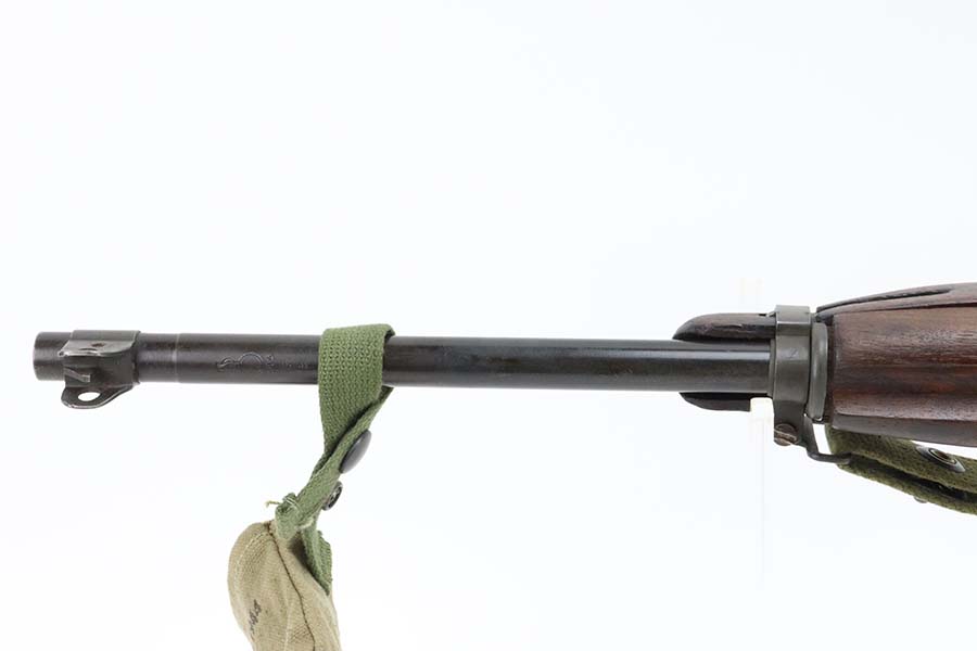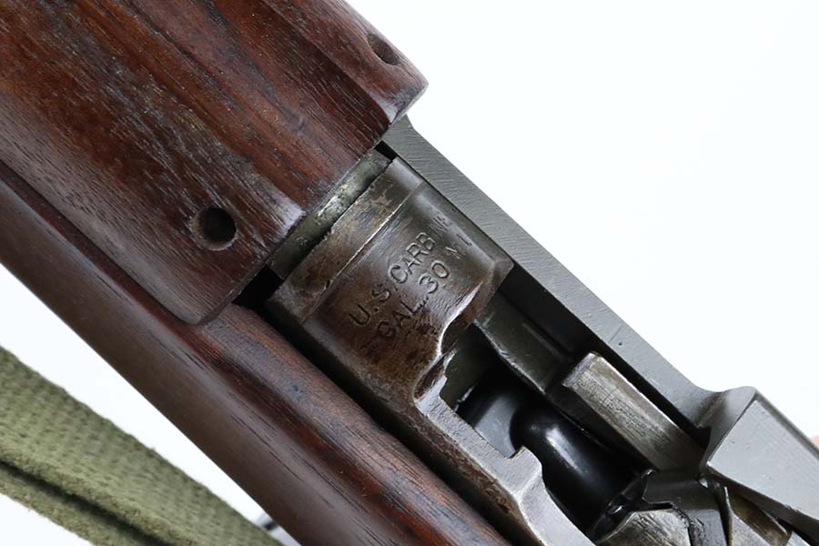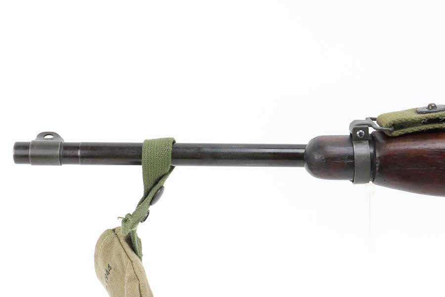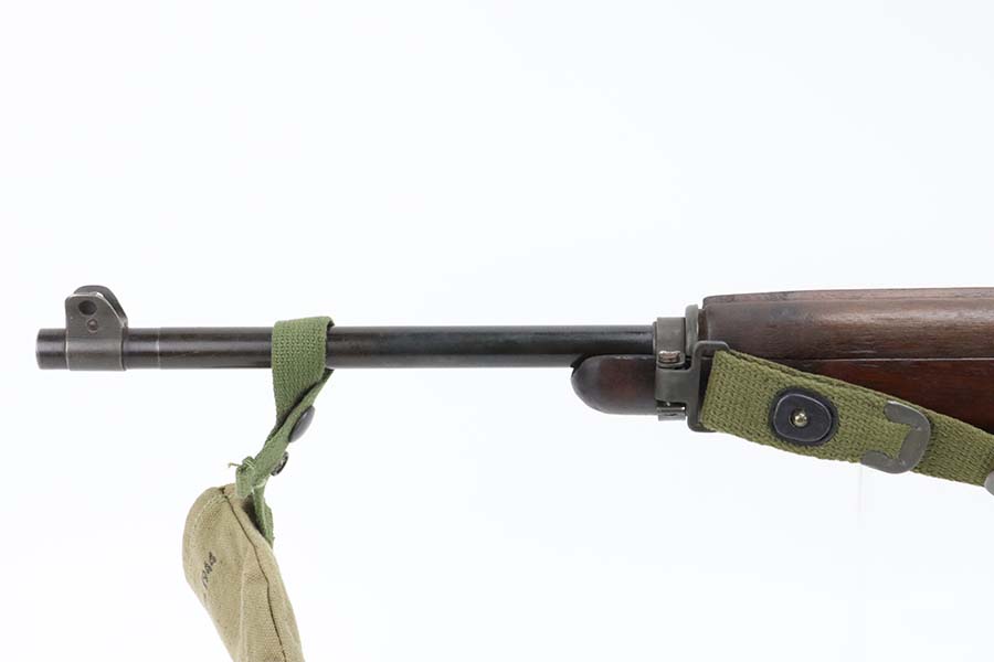 3/20/24 – This is an excellent example of an all-correct Winchester M1 Carbine issued to the US military in 1942. All correct Winchester-marked parts, including the stock and handguard. Barrel is dated 12-42. It comes with one magazine, a 1944-dated muzzle cover, oiler, and canvas sling. The metal parts have retained about 90% of their original finish with general high edge wear and some discoloration on the receiver. Excellent wood furniture. Mint bore.