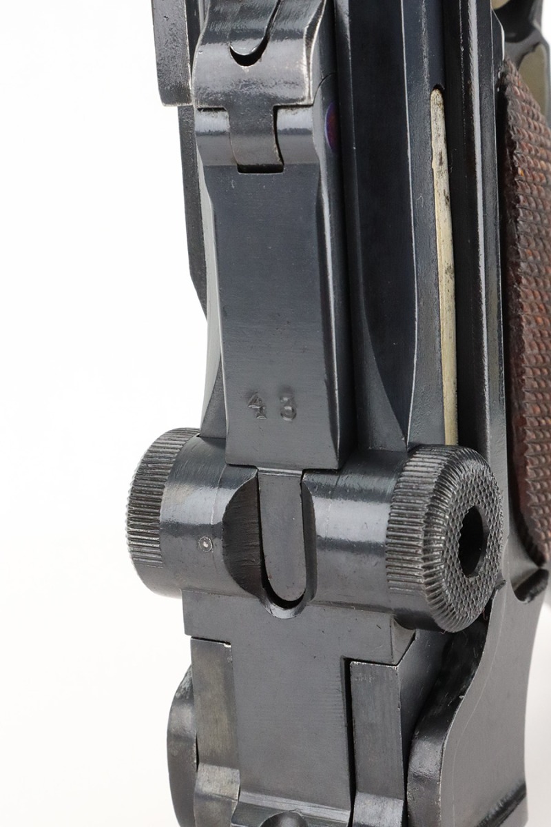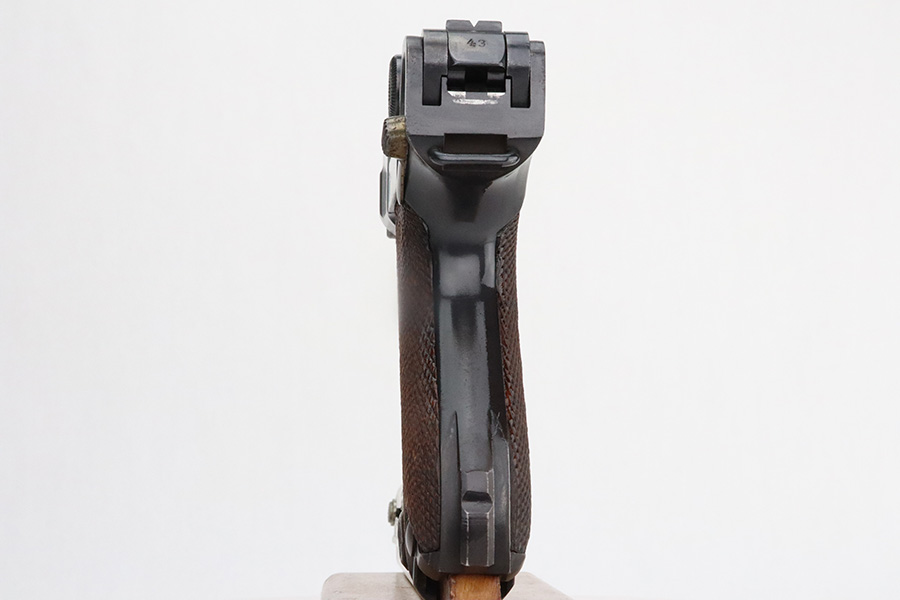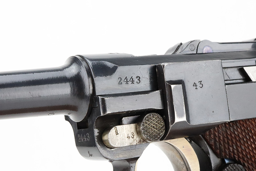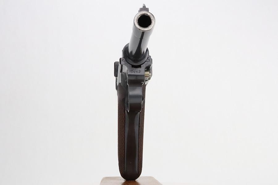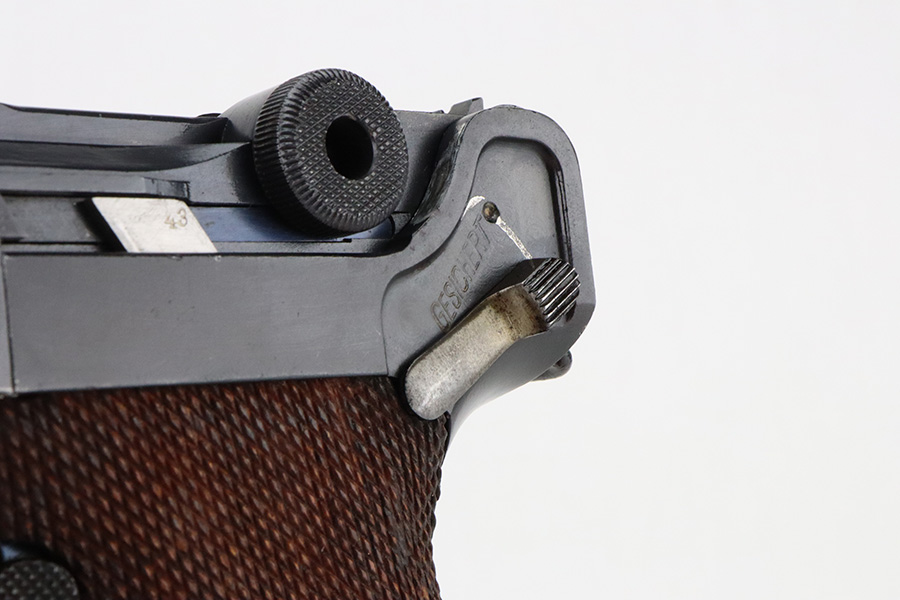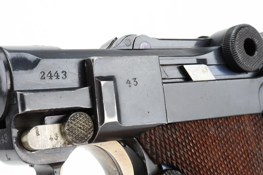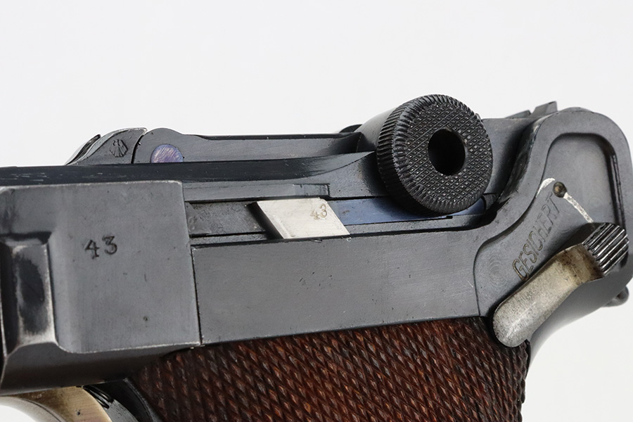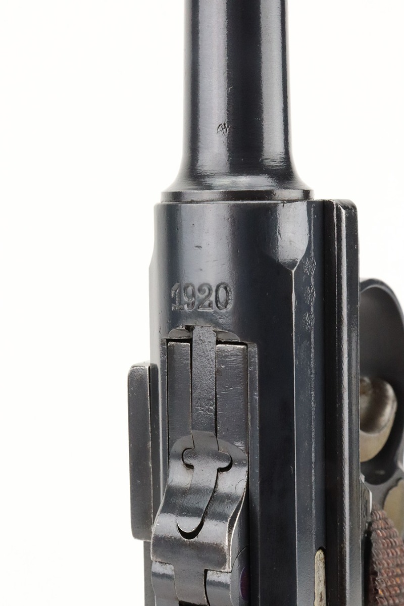 3/21/24 – This gun was put together between the wars and even though it is dated 1920 it could have been made a bit after that – called an “alphabet gun”. It consists of DWM parts and at least one Erfurt part but most likely assembled in a munitions arsenal between the wars. Part of the mystery is the blank toggle. Weimar-era Eagle proofs on the slide. All parts are matching including the hold open and firing pin, as well as the grips. Only the wood bottom magazine is mismatched. The gun was most likely refinished when it was reworked after WW1.