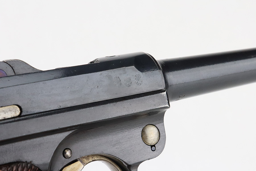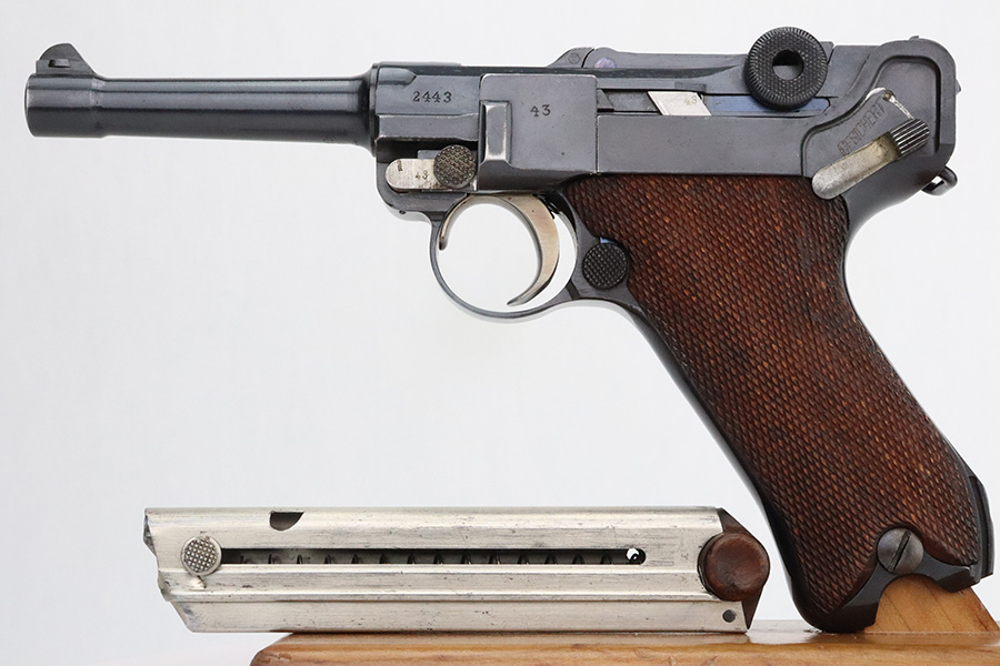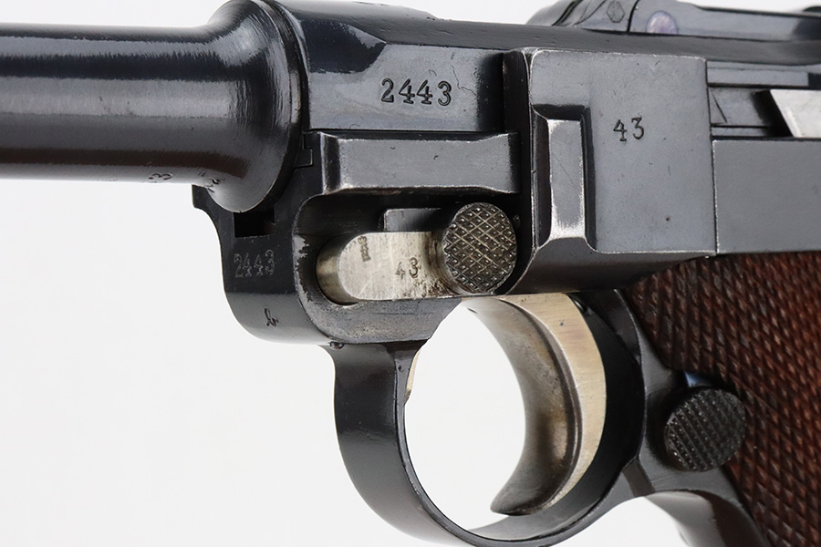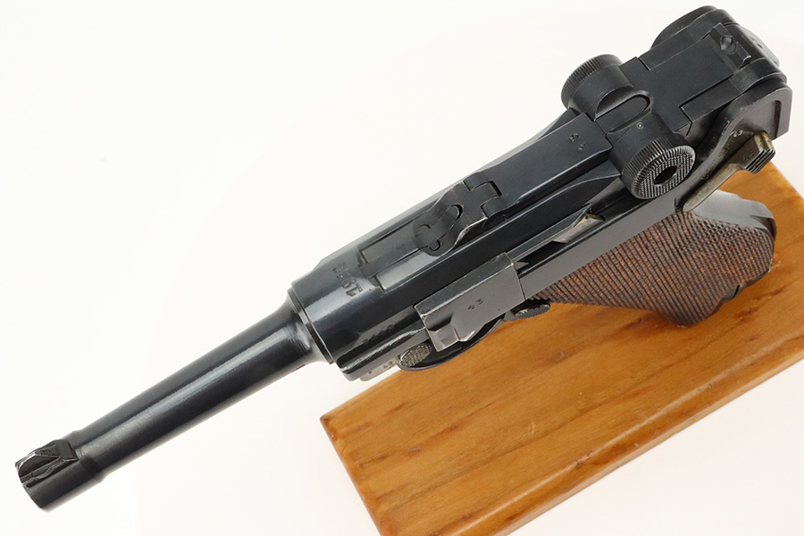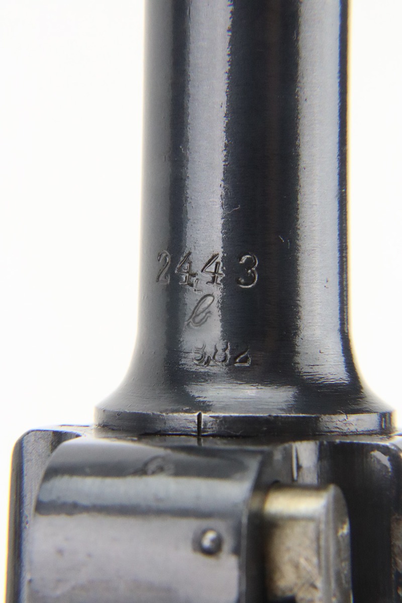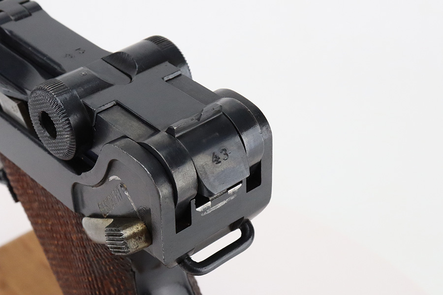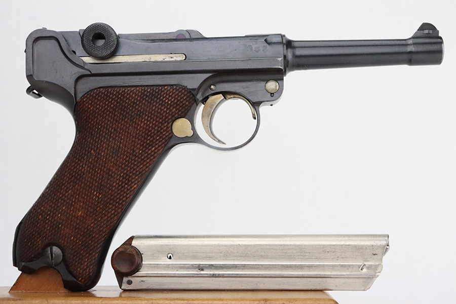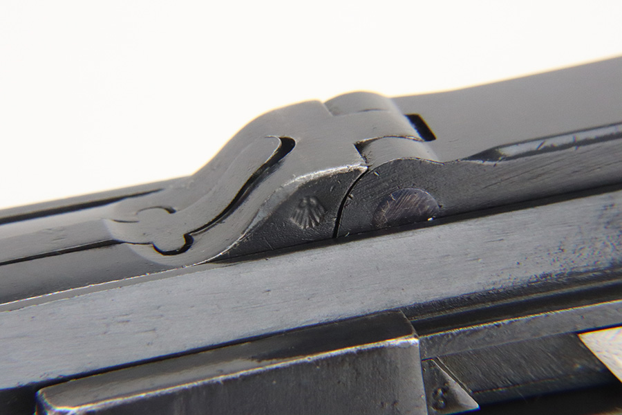 3/21/24 – This gun was put together between the wars and even though it is dated 1920 it could have been made a bit after that – called an “alphabet gun”. It consists of DWM parts and at least one Erfurt part but most likely assembled in a munitions arsenal between the wars. Part of the mystery is the blank toggle. Weimar-era Eagle proofs on the slide. All parts are matching including the hold open and firing pin, as well as the grips. Only the wood bottom magazine is mismatched. The gun was most likely refinished when it was reworked after WW1.