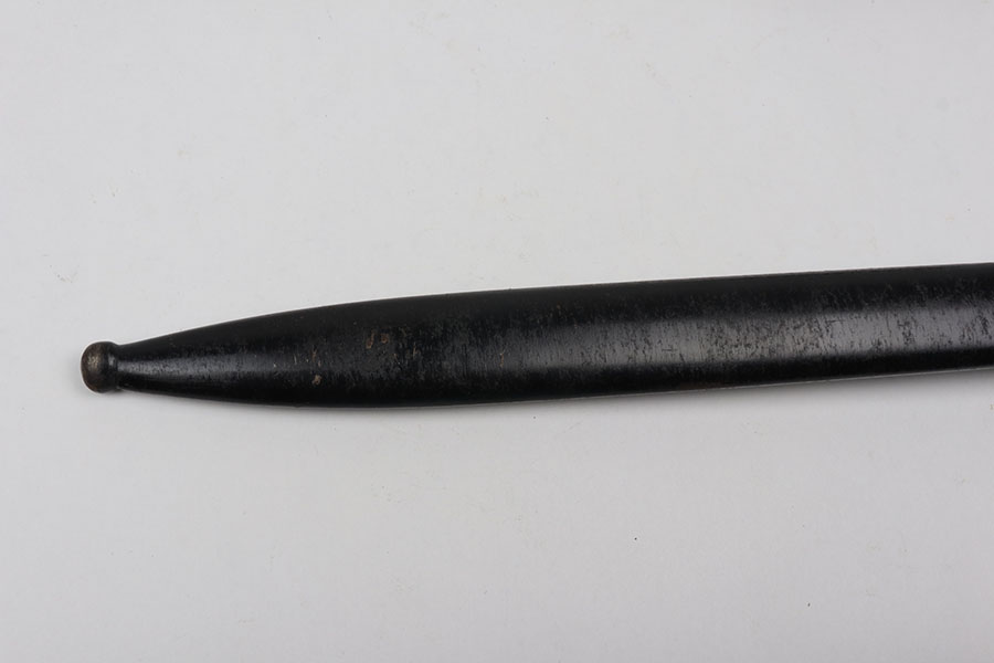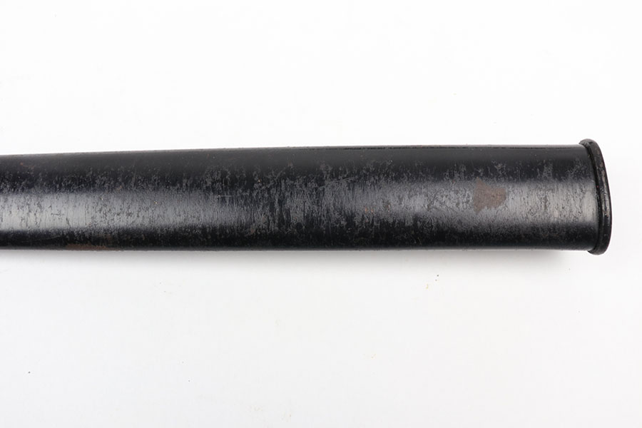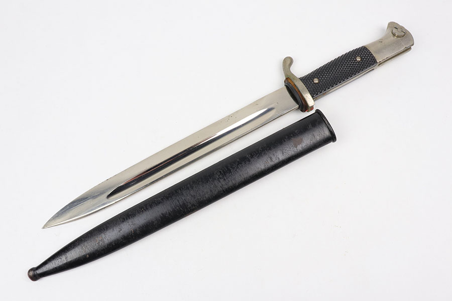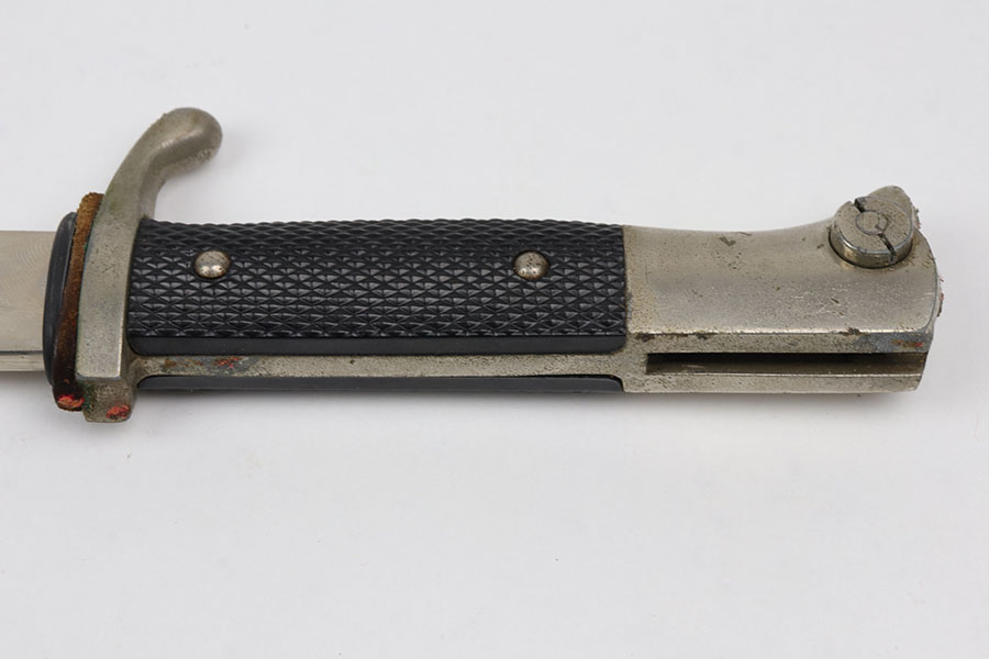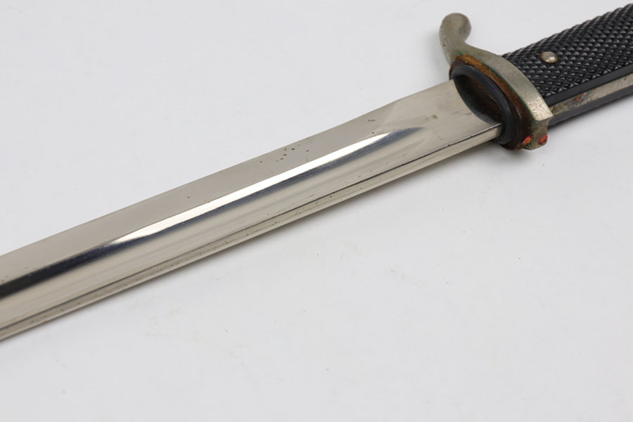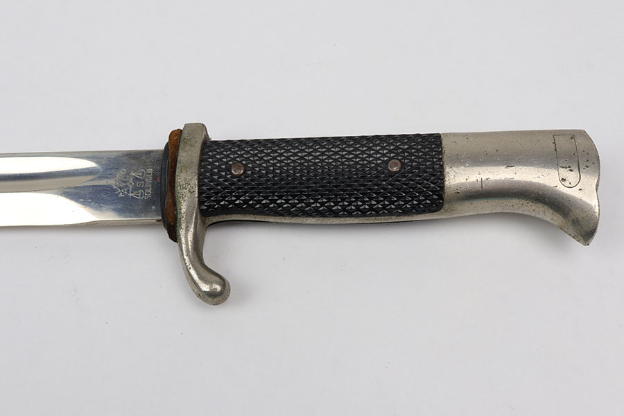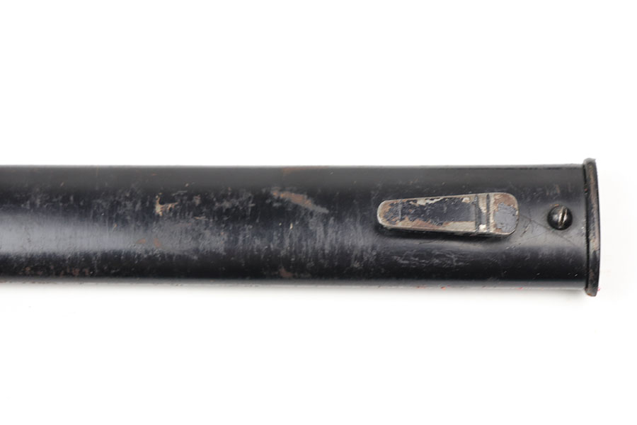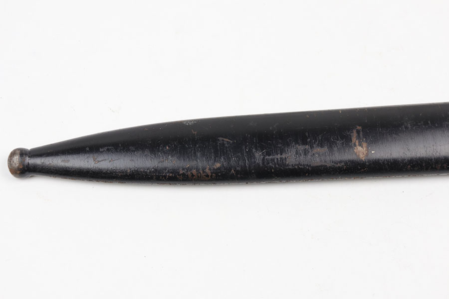 10/21/20 – This is an original WW2 nazi dress / parade bayonet made by Alsco. The bayonet comes with the original scabbard. There is some light wear near the tip of the blade, as shown. The blade has a maker stamp and no other markings. Excellent black grips have no cracks or chips. There is some light freckling on the metal areas of the handle but no major wear. The scabbard has no dents but there is some light paint loss. Original leather stopper still in tact.