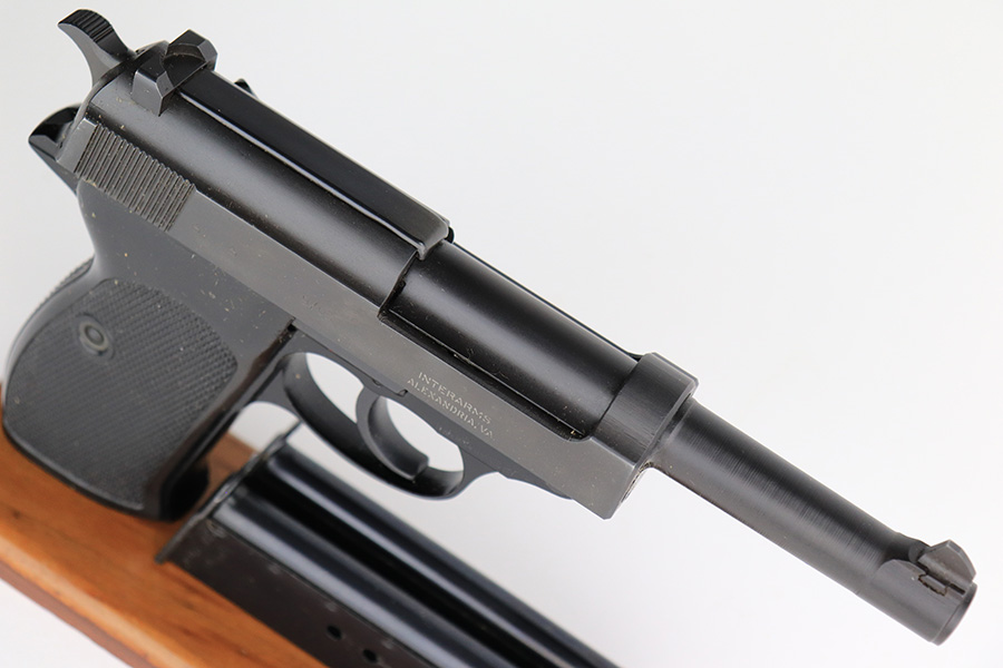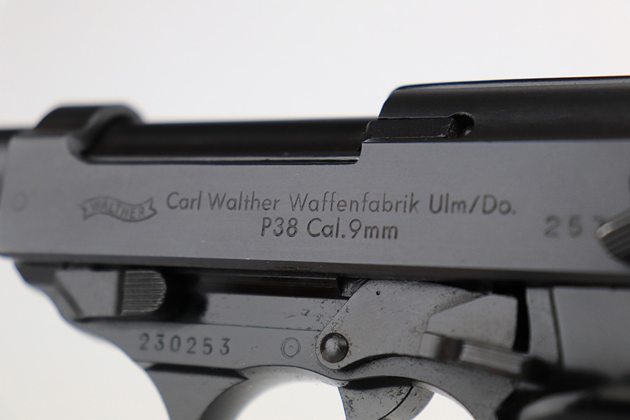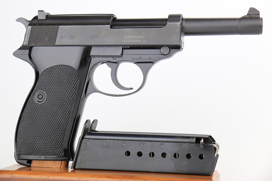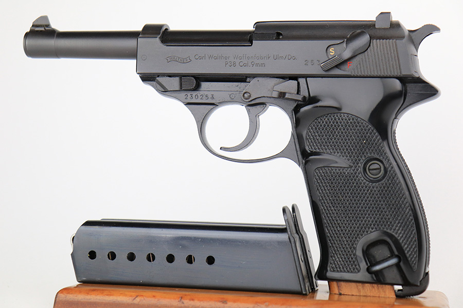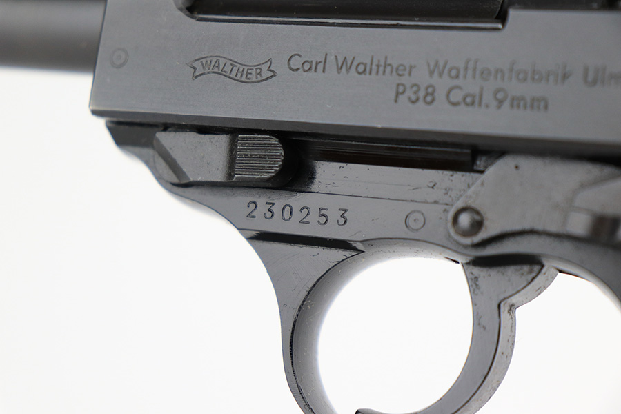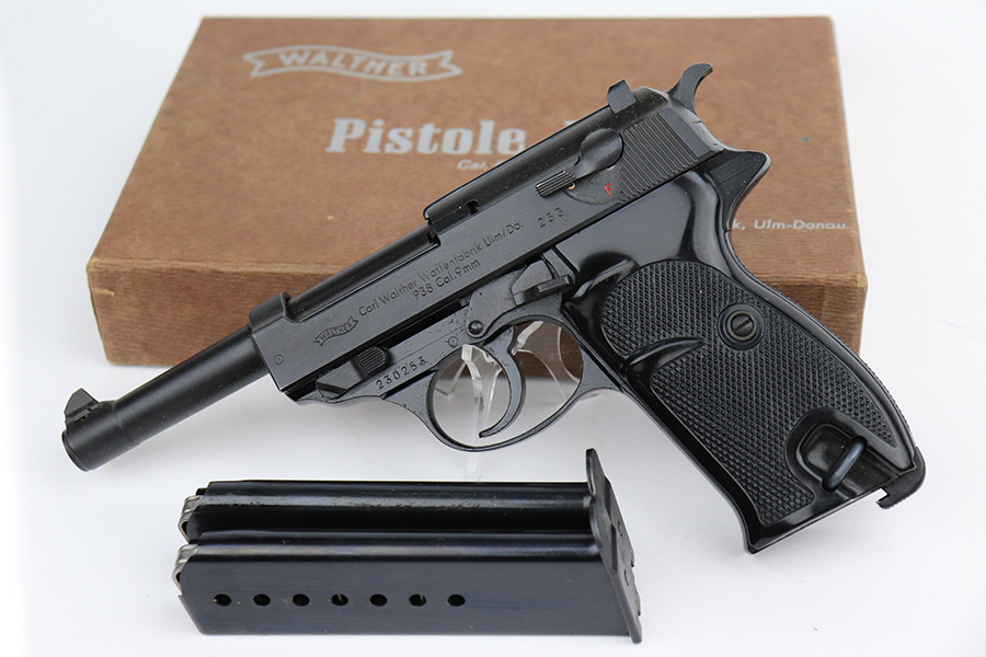 5/22/23 – This is a like-new example of a Walther P.38 manufactured in September of 1963. All matching with the proper West German proofs throughout. Import mark on the right side of the slide and “Made in Germany” marking on the right side of the frame. It comes with its original matching-numbered box, owners manual, cleaning rod, and two magazines (both dated 9/62). The gun is mint with no real signs of wear or use – just a couple of extremely light surface scuffs on the right side of the slide. Fitted with excellent black plastic grips. The bore is factory-new.
