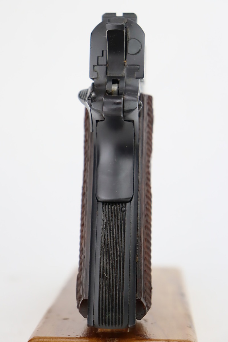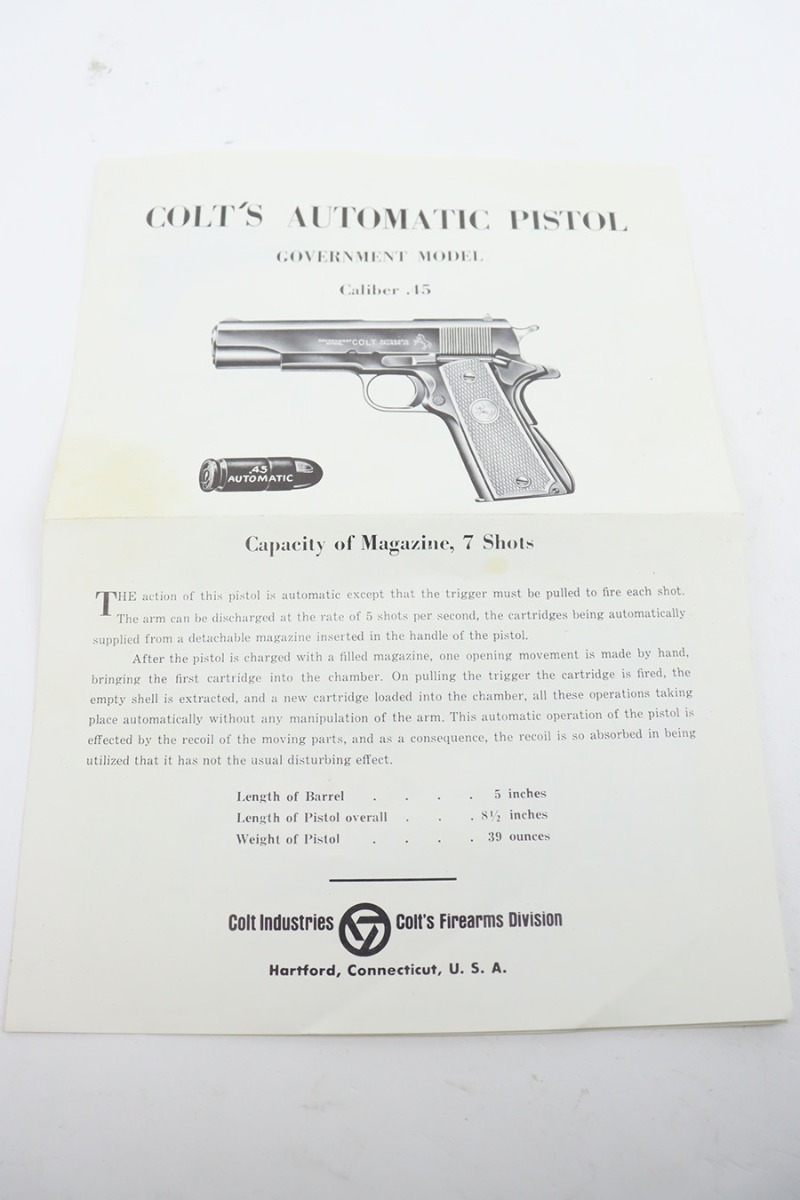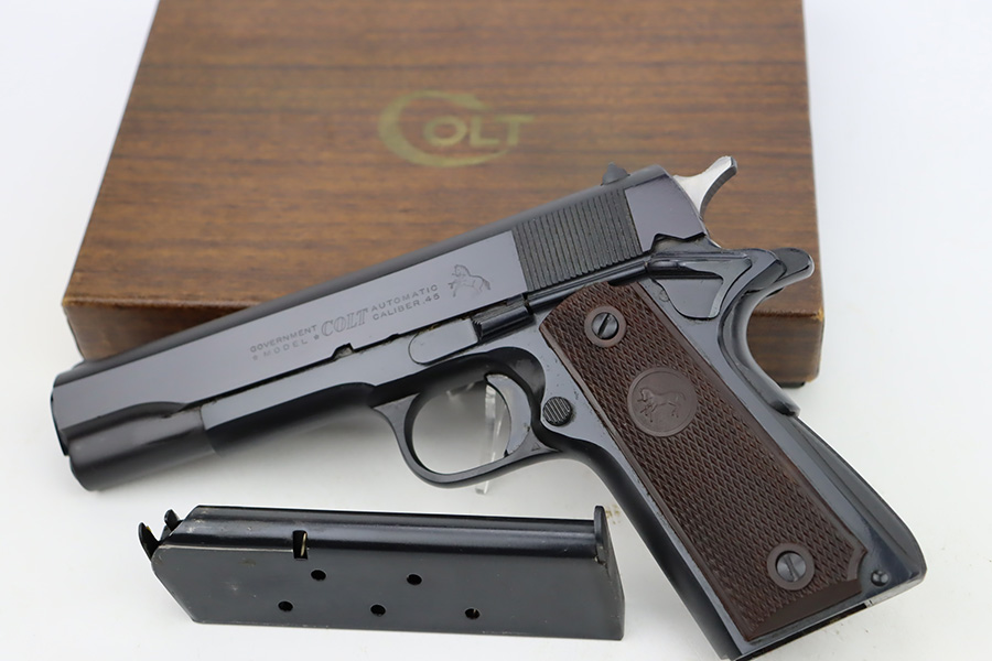 9/27/23 – This is a stunning, like-new example of a Colt Government Model 1911A1, manufactured in 1967. It comes with its original matching box, owners manual, and one magazine. The gun is mint, showing no signs of wear or use. Excellent brownish plastic grips. Mint bore.