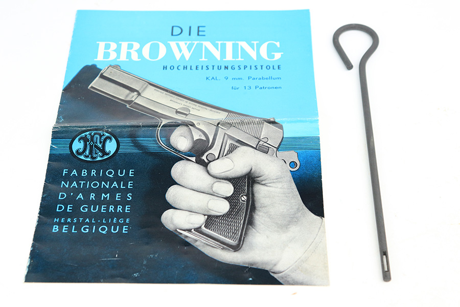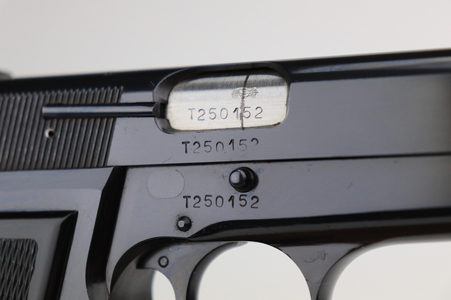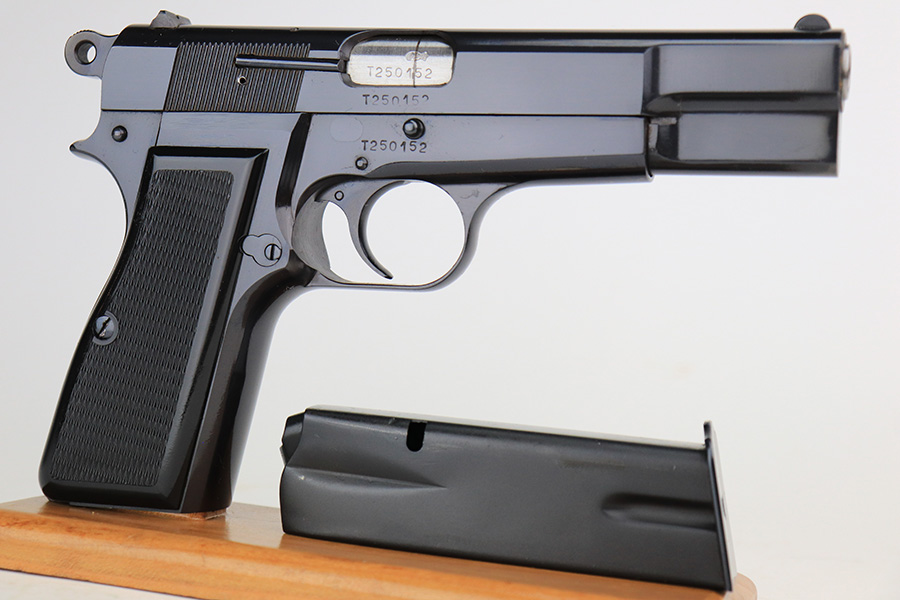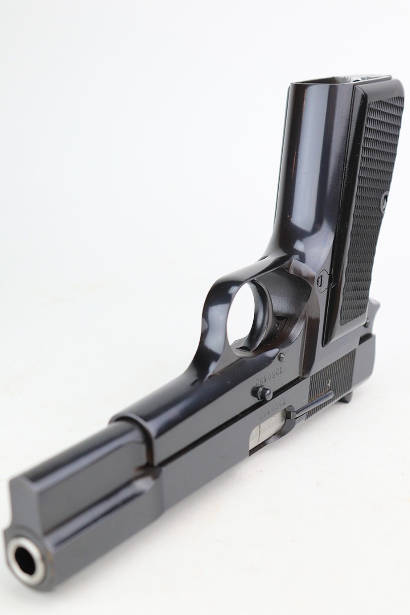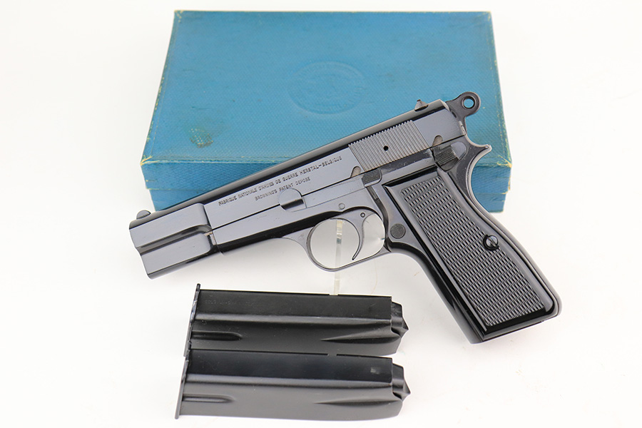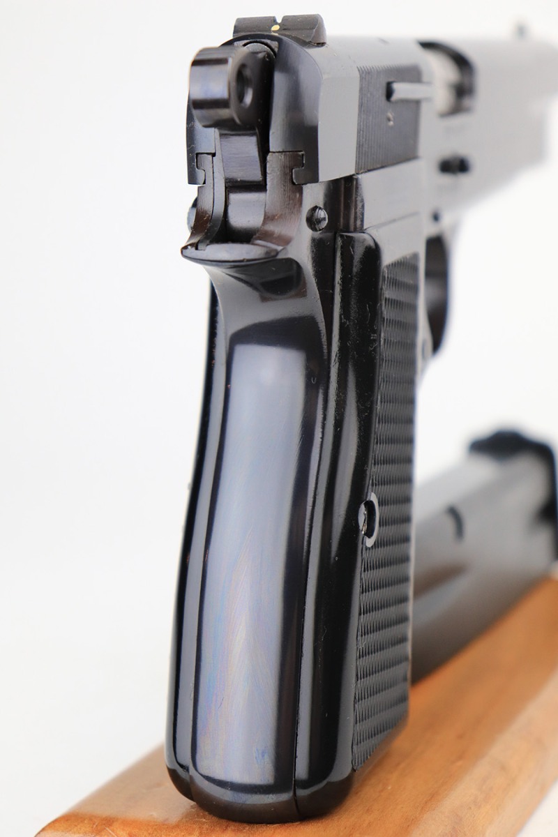 4/27/22 – This is a gorgeous example of a Belgian FN Browning Hi Power manufactured in 1968. The gun is all matching, has the proper Belgian proofs, and has a GECO retailer marking on the left side of the trigger guard. The gun comes with the original matching-numbered box, owners manual, cleaning rod, and two proper magazines. The gun is in like-new condition with no signs of wear. Comes with excellent black plastic grips. Mint bore. Fully functional.