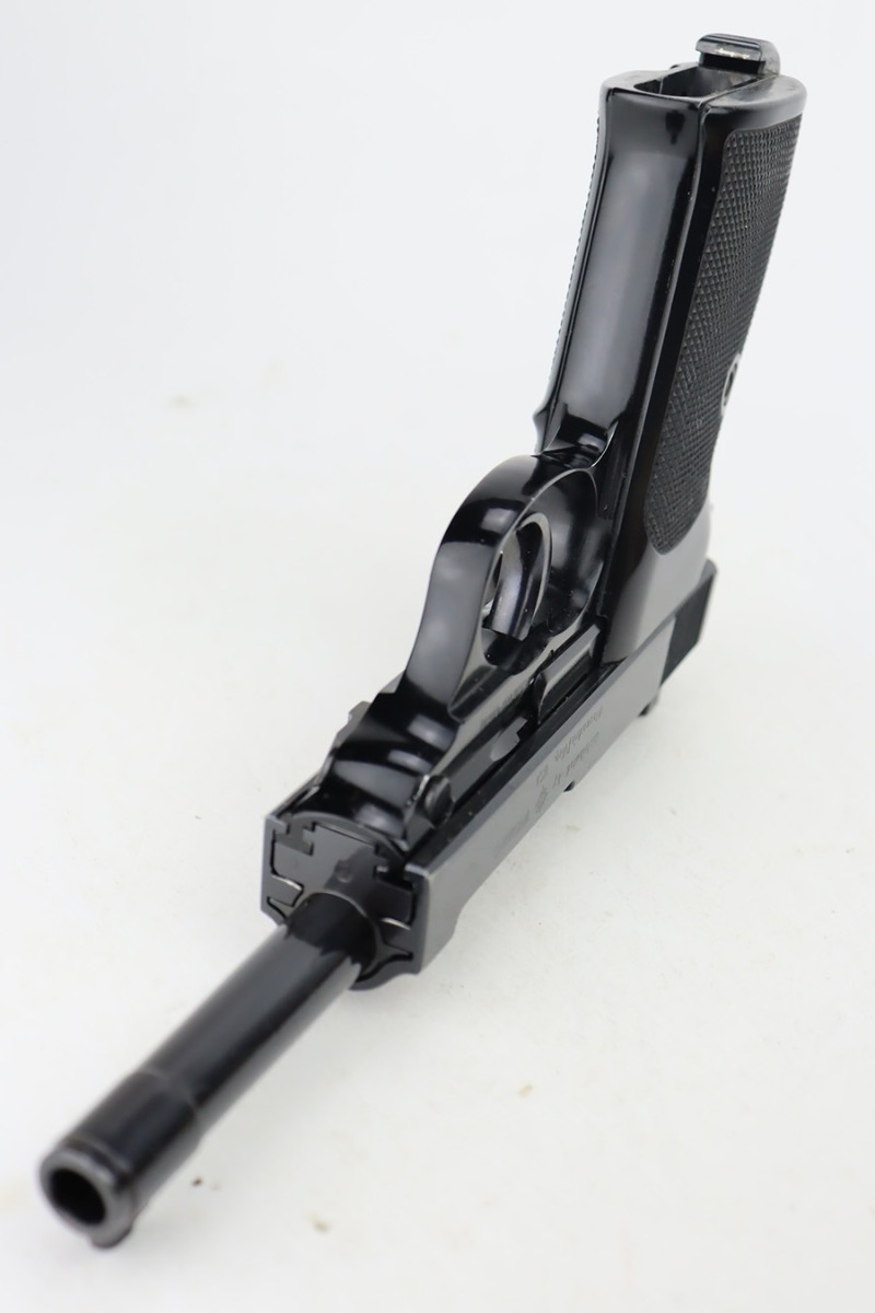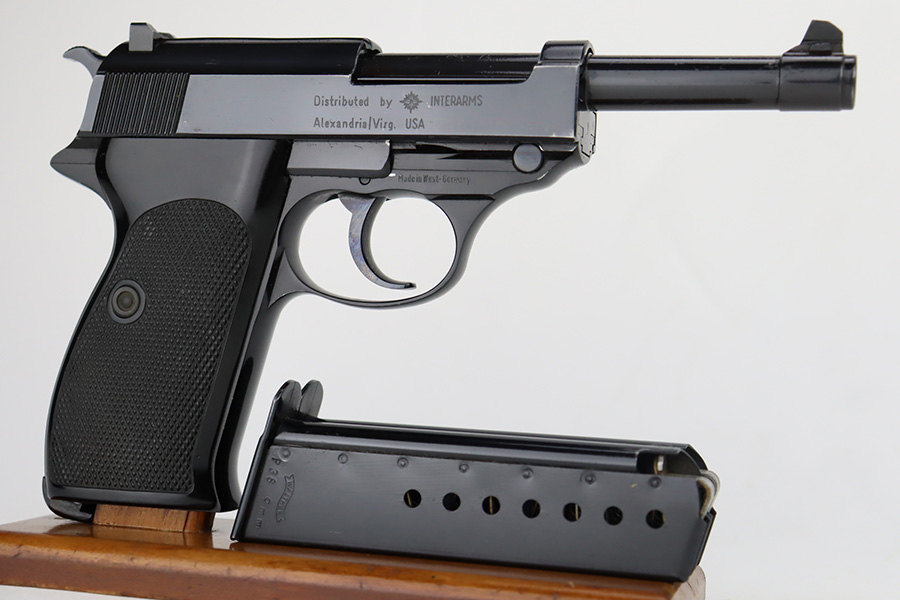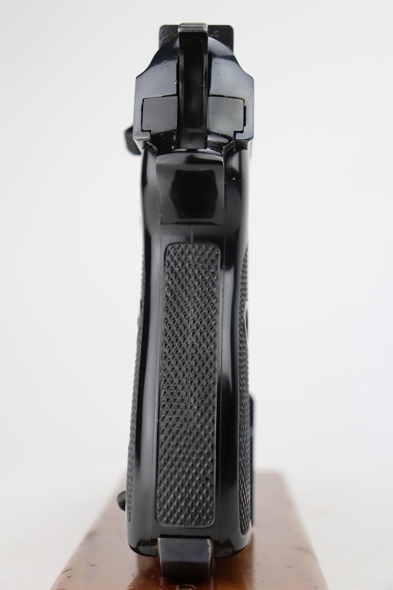 9/27/23 – This is a mint example of a Walther P.38 manufactured in 1968. The gun is all matching and has the proper West German proofs. It comes with its original matching box, owners manual, and two magazines. This one is particularly rare, because it has an original high polish finish and has no import marks. It comes with a very nice Walther factory presentation case and two minty P.38 magazines. The gun has retained nearly all of its finish with just hints of wear around the muzzle and on the very front edges of the slide and a few very light scratches on the right side of the slide. Mint bore.