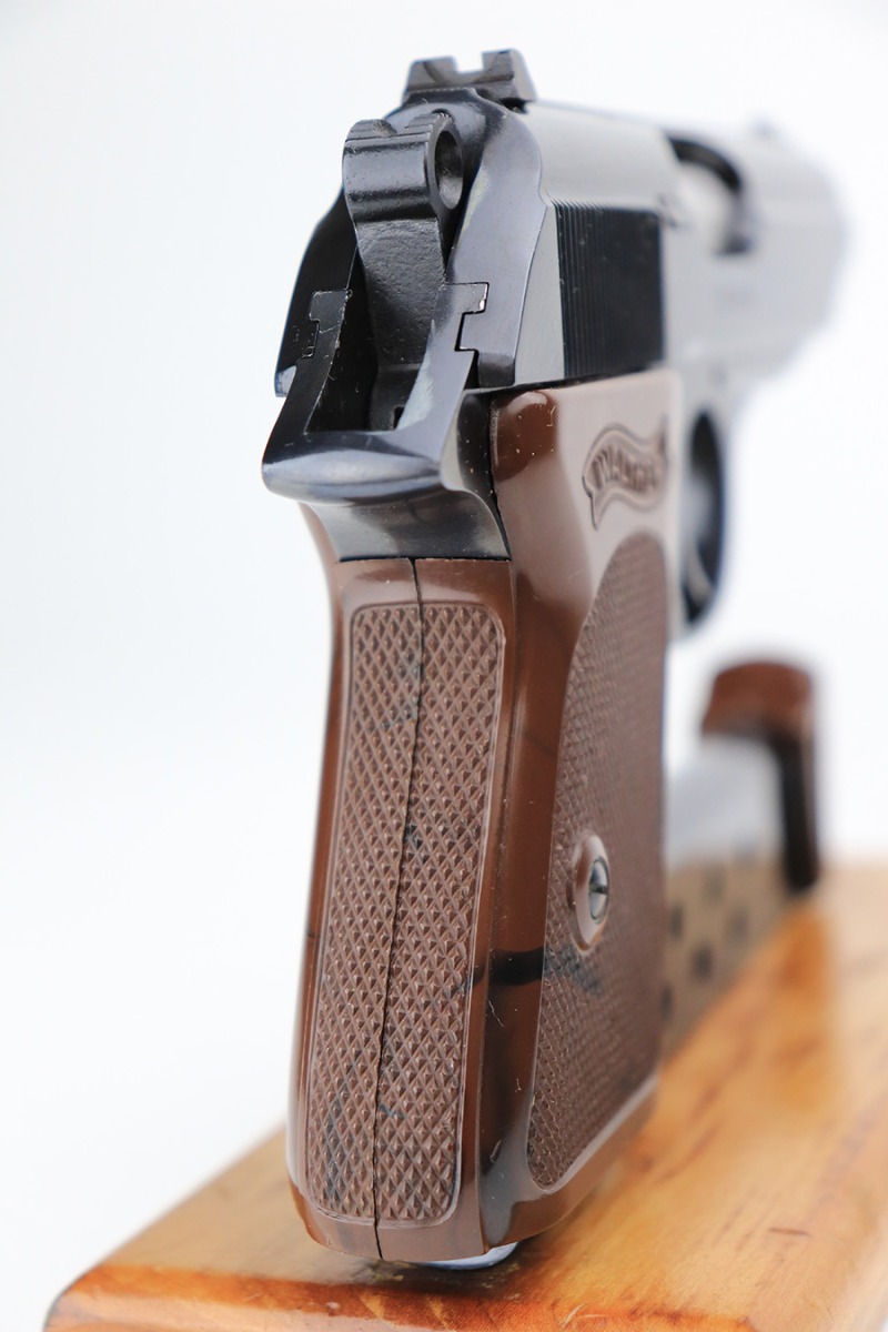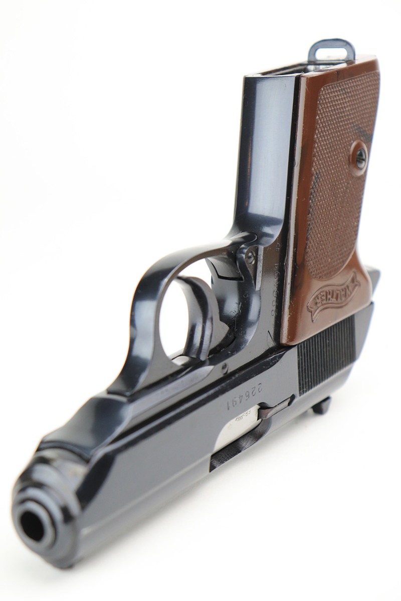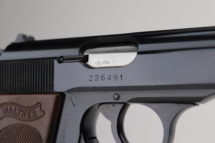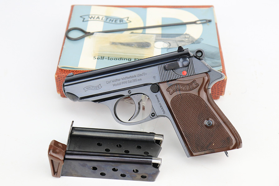 5/10/22 – This is a mint example of a Walther PPK manufactured in 1968. The gun is all matching and has the proper West German proofs. The gun comes with its original matching box, owners manual, cleaning rod, one finger extension magazine, and one flat bottom magazine. The gun is in like-new condition with no signs of wear. No import marks. Comes with mint brown grips. The bore is stone-mint.