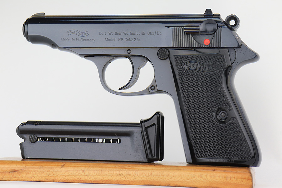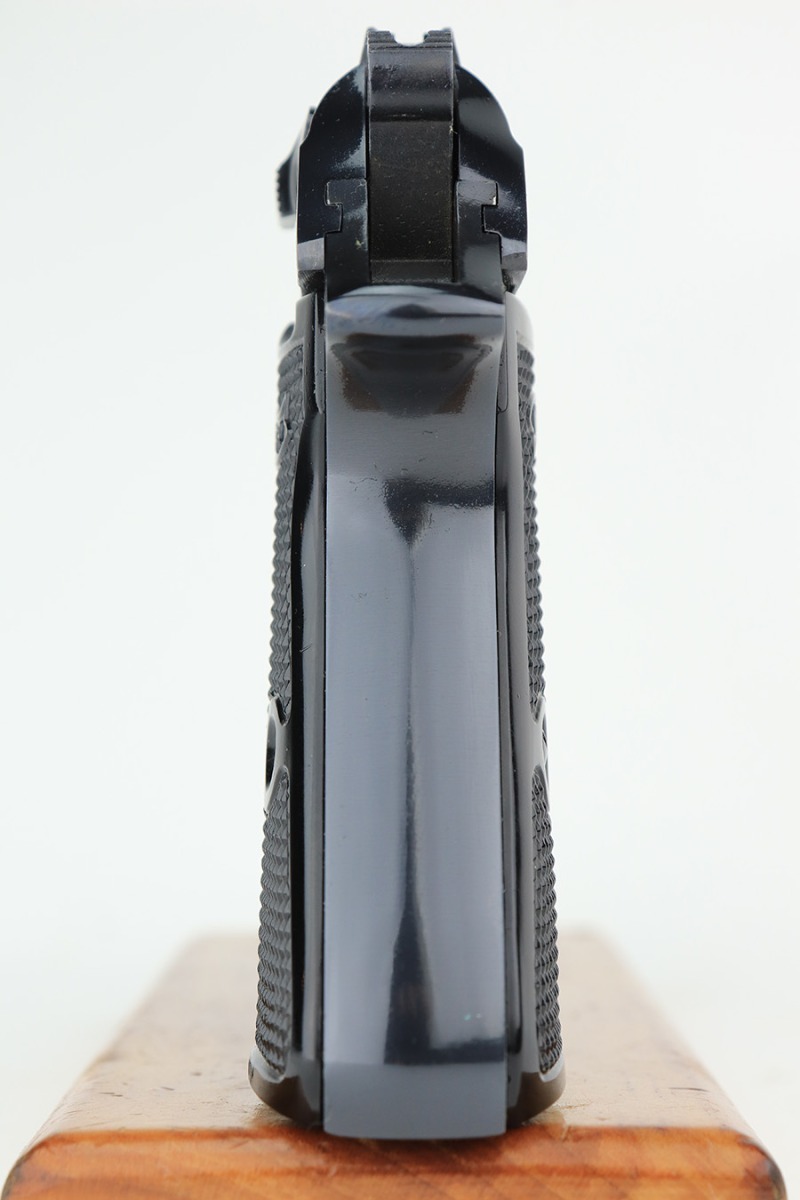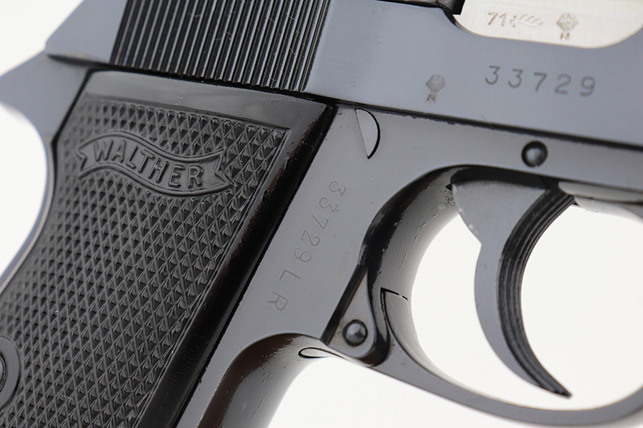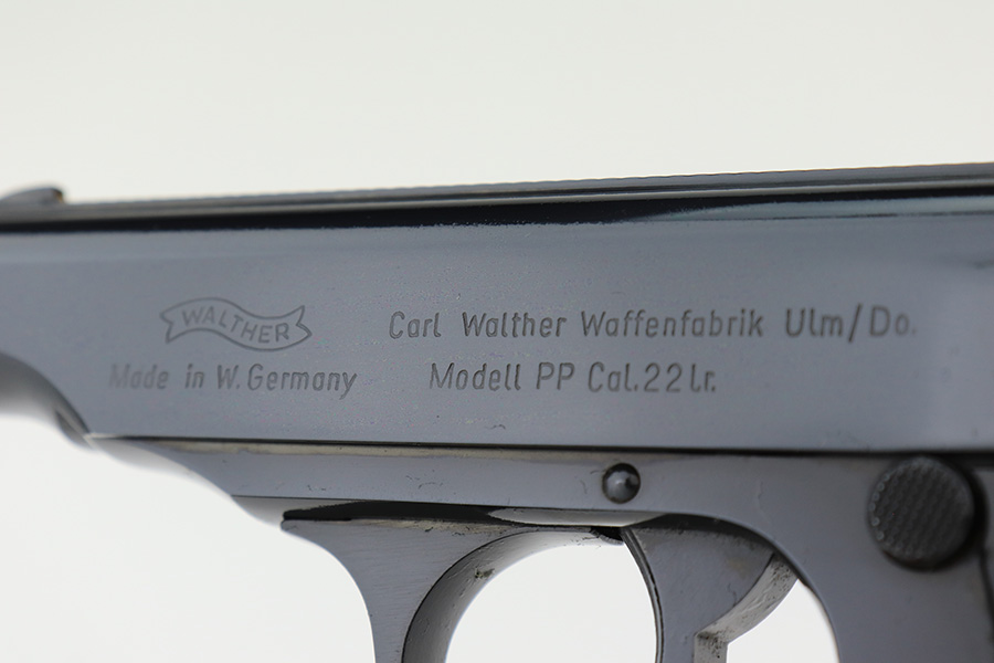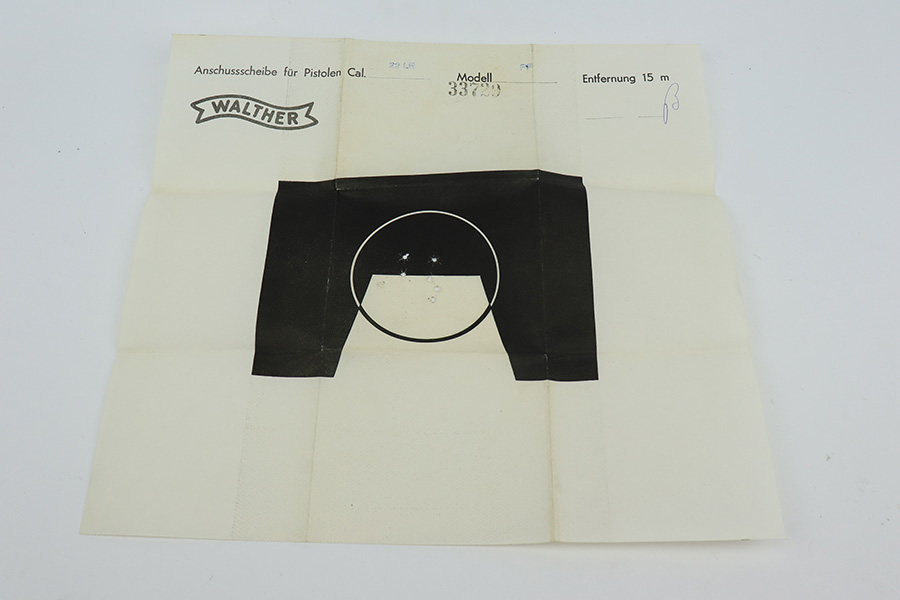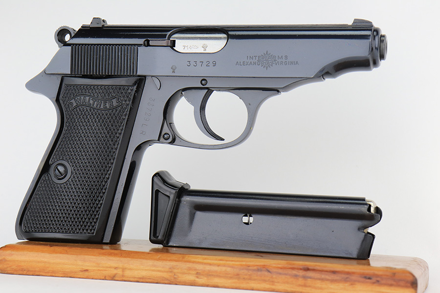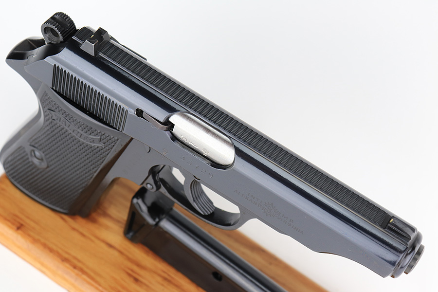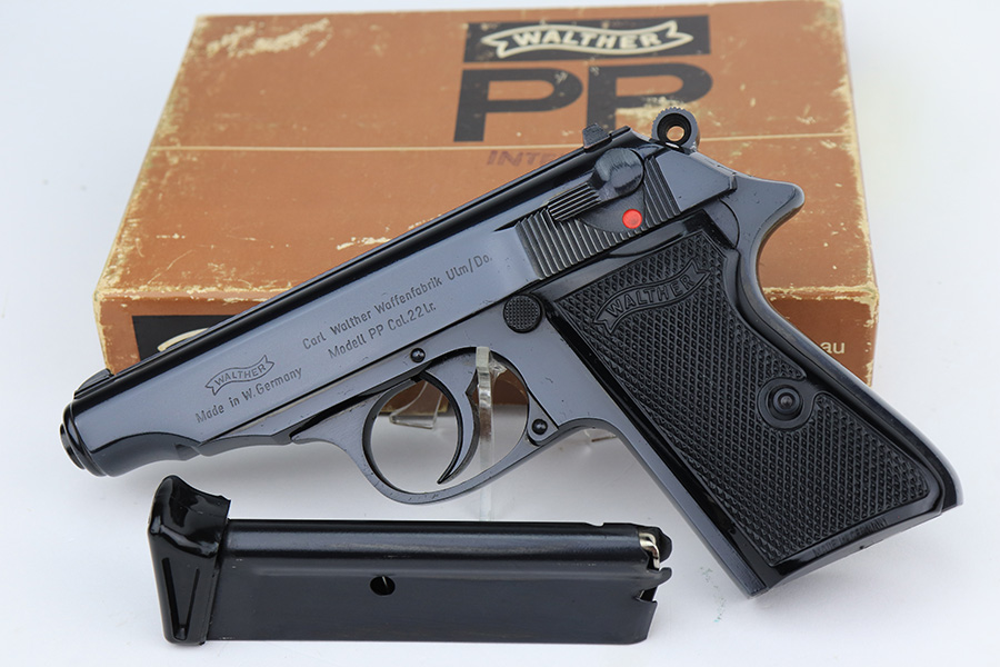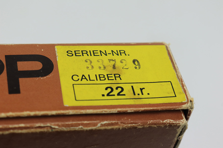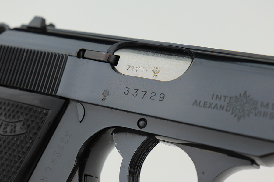 1/23/23 – This is a like-new example of a Walther / Interarms PP manufactured in 1971 and chambered in .22 LR. All matching with the proper West German proofs. Interarms marking on the right side of the slide. It comes with its original matching-numbered box, matching-numbered test target, owners manual, and one finger extension magazine. The gun is in mint condition with no signs of wear to highlight. Fitted with excellent black plastic grips. The bore is like-new.