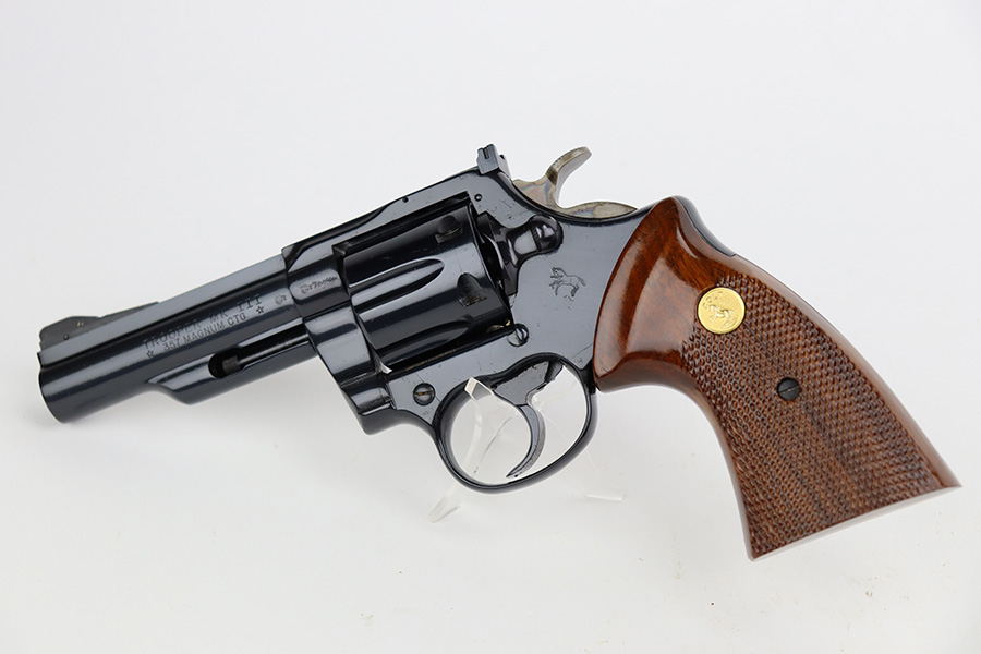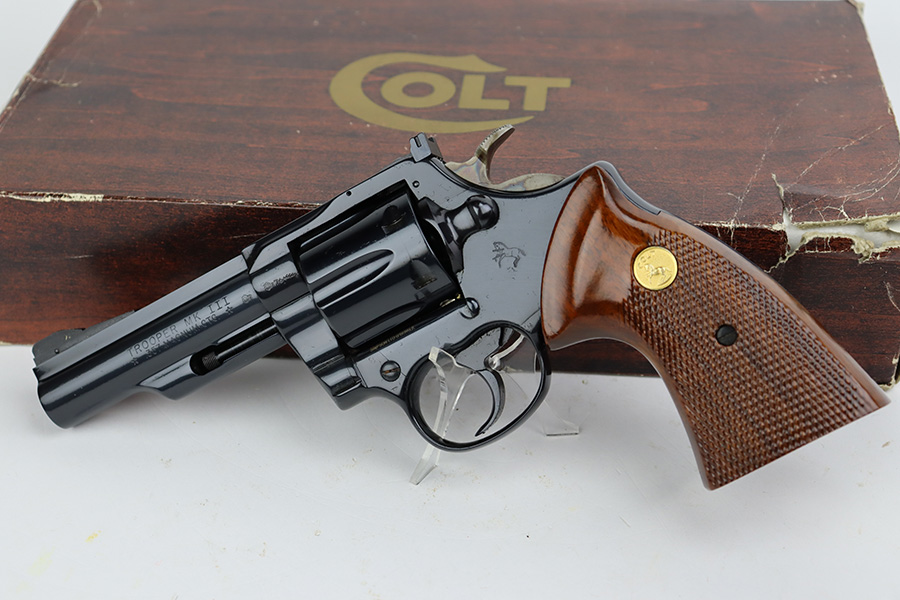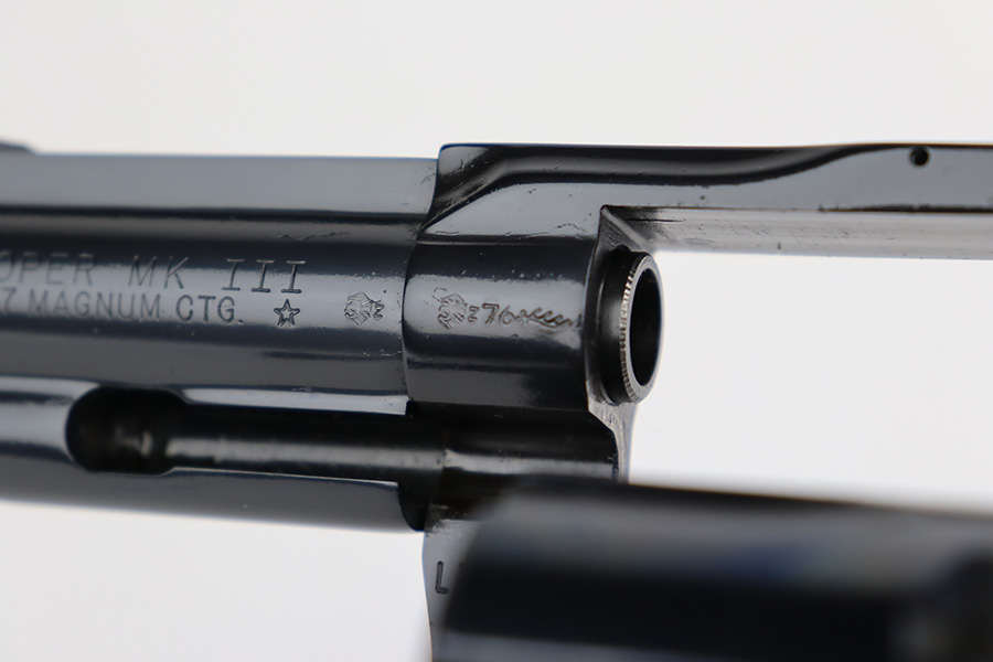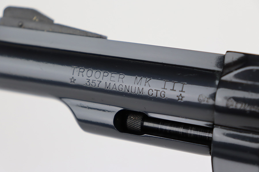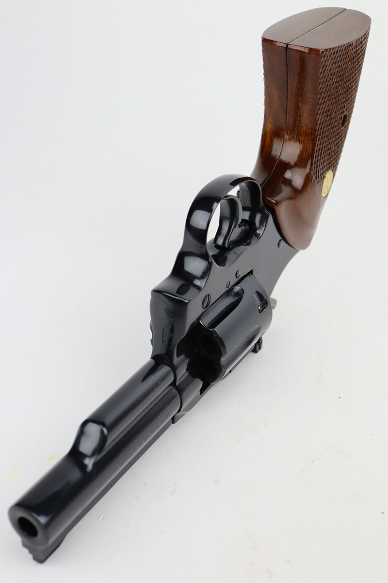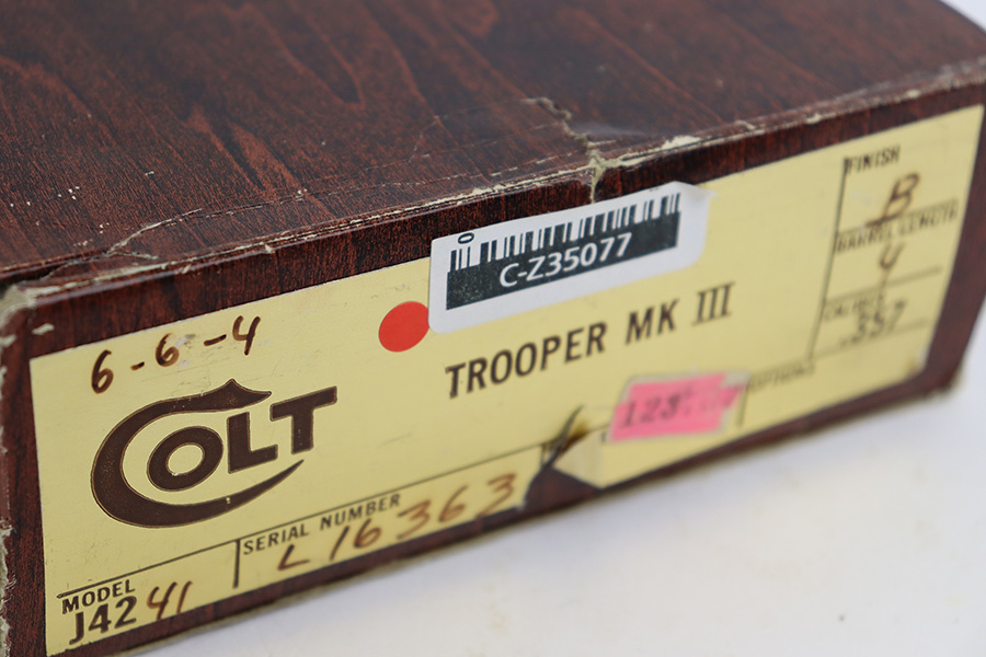 8/8/23 – This is a mint example of a Colt Trooper MK III Revolver, manufactured in 1976 and chambered in .357 Magnum. It is all matching and has West German export markings on the left side of the slide and frame and on the cylinder. Import mark on the left side of the frame, under the cylinder. It comes with its original matching-numbered box and owners manual. The gun is in like-new condition with essentially no signs of wear – barely even a hint of a roll mark on the cylinder. Fitted with excellent hand-checkered wood grips. Mint bore.
