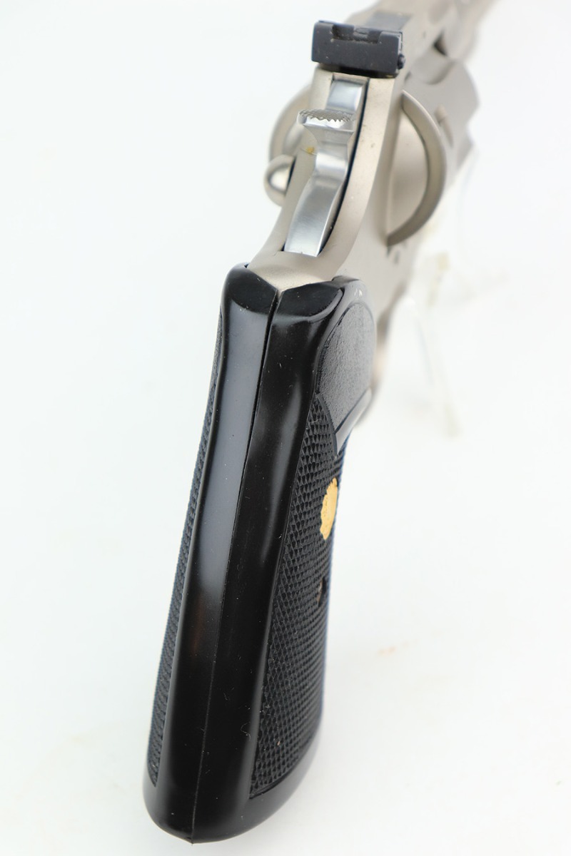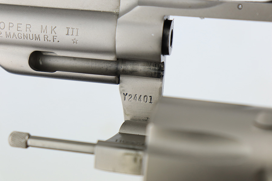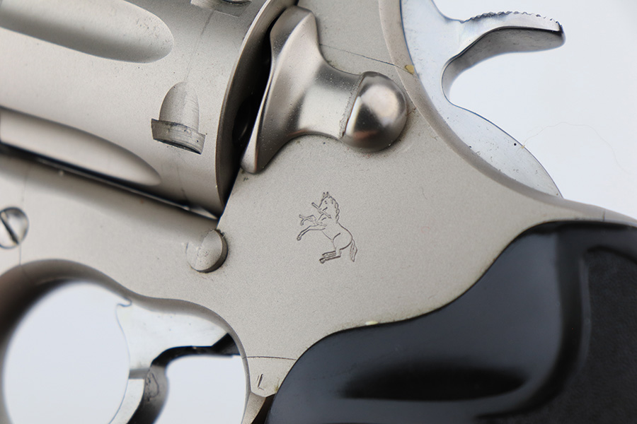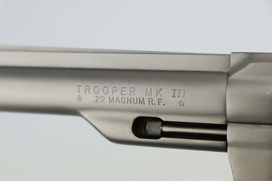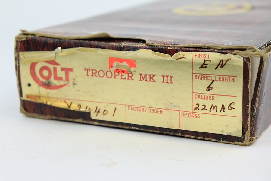 4/20/22 – This is an as-new-in-box example of a Colt Trooper Mk III Revolver, manufactured in 1980 and chambered in .22 Magnum RF. The gun is matching and comes with the original matching box and owners manual. This one has retained nearly all of its original satin nickel finish – there is very little sign of wear except for a light roll mark on the cylinder. The cylinder is tight, and the action is very smooth. Comes with excellent black rubber grips Mint bore.