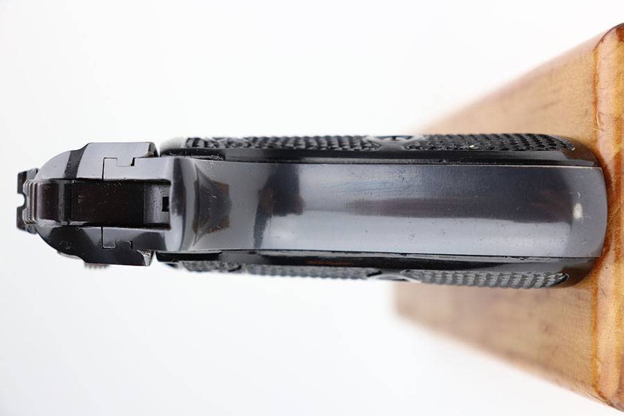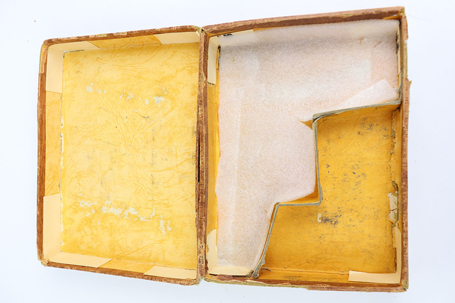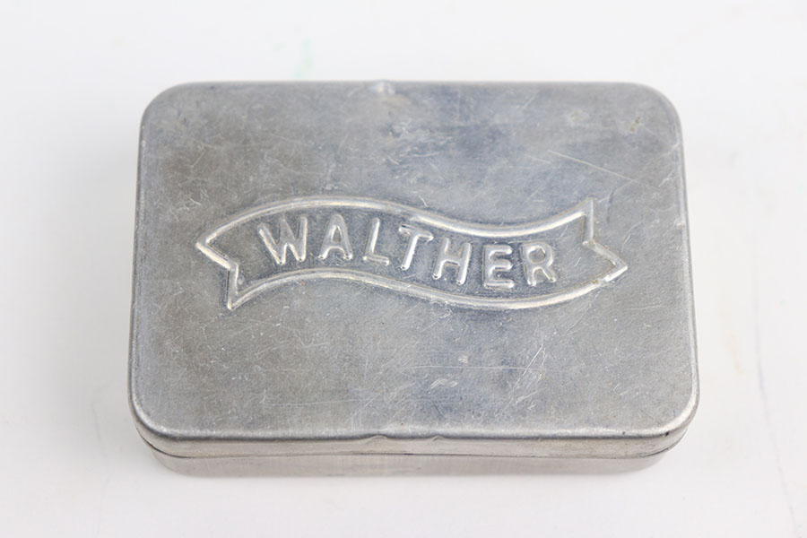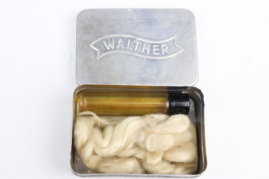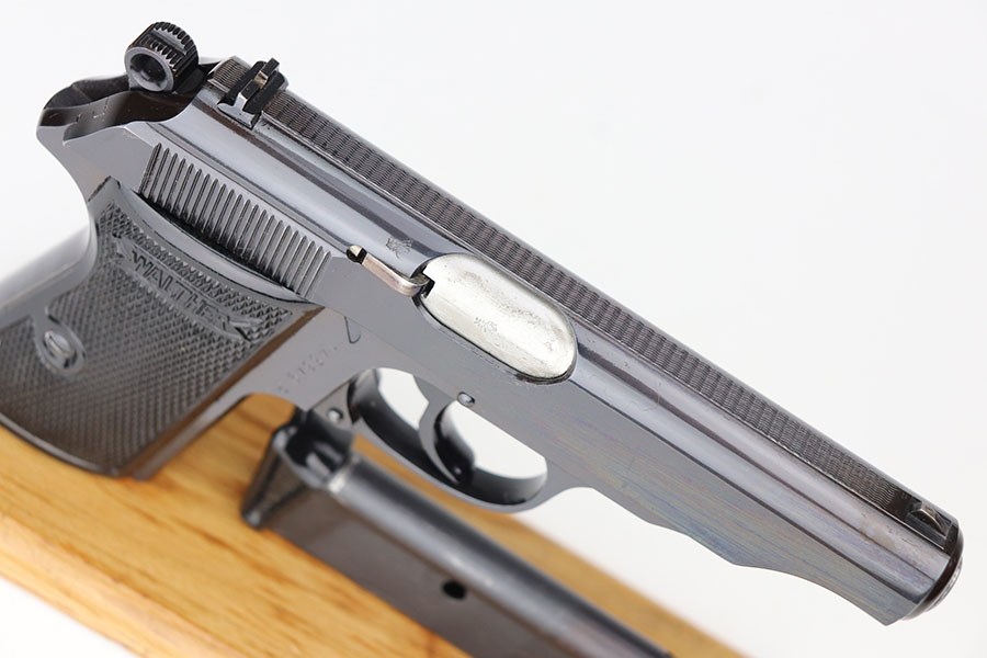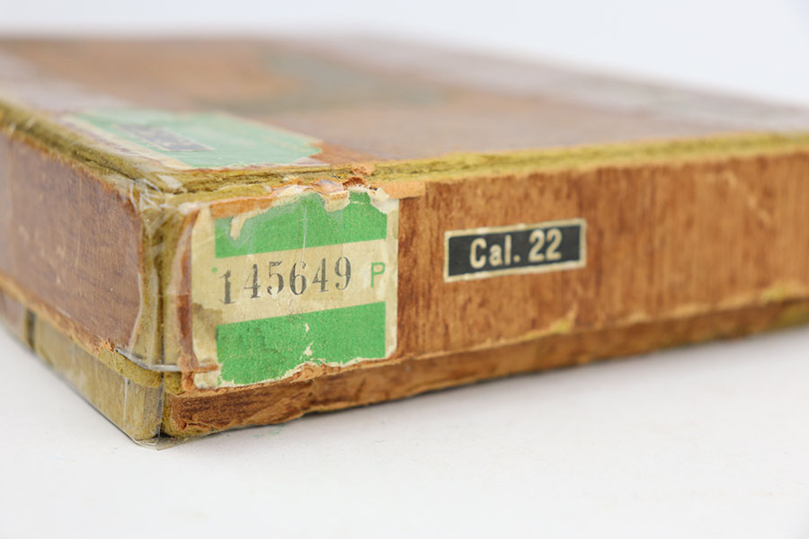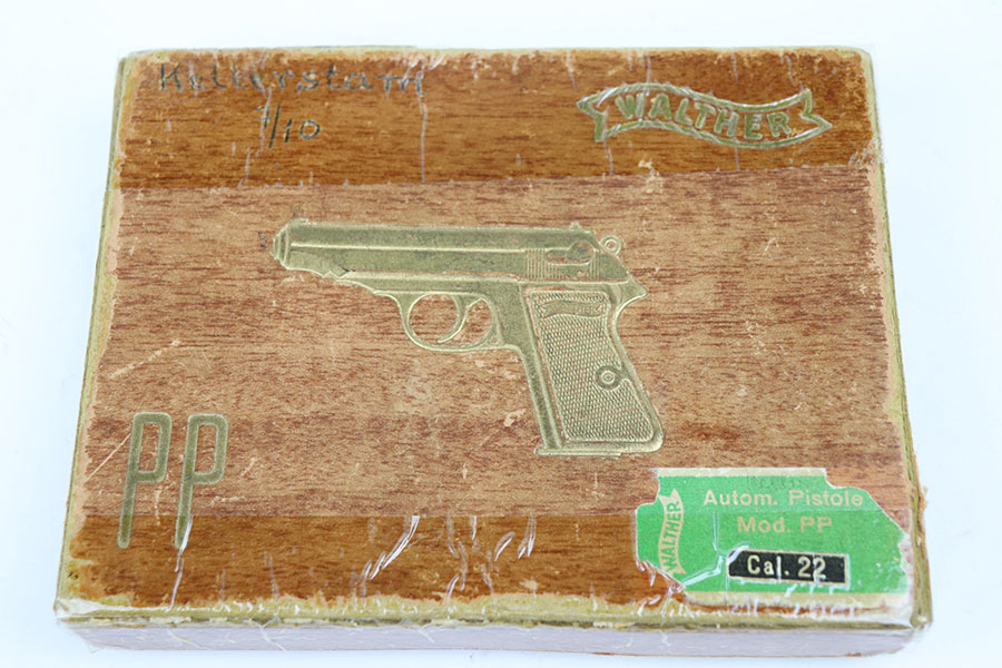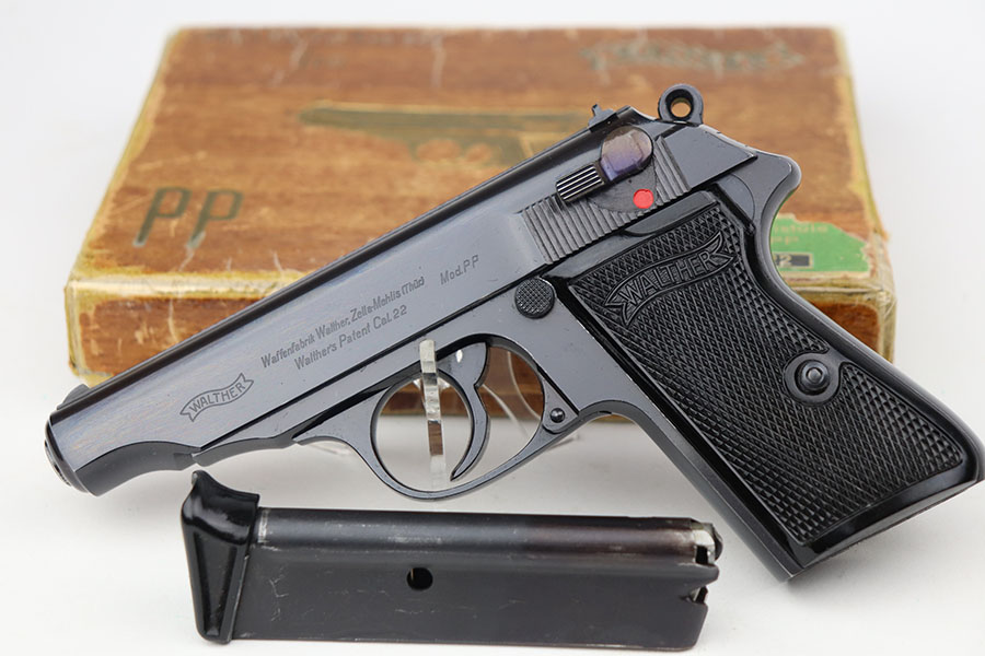 1/28/21 – This is a mint Walther PP from 1940 in the original, matching box. It’s chambered for .22LR, and only about 3.5% of total PP production was manufactured for this caliber. It has over 99% of the original blue, just a tiny spot of finish loss on the back strap. Mint bore and grips. The box is worn and has tape holding it all together, but the original label with the serial of the pistol is still attached. Scarce, early manual is included. Comes with original cleaning rod and cleaning tin, too.