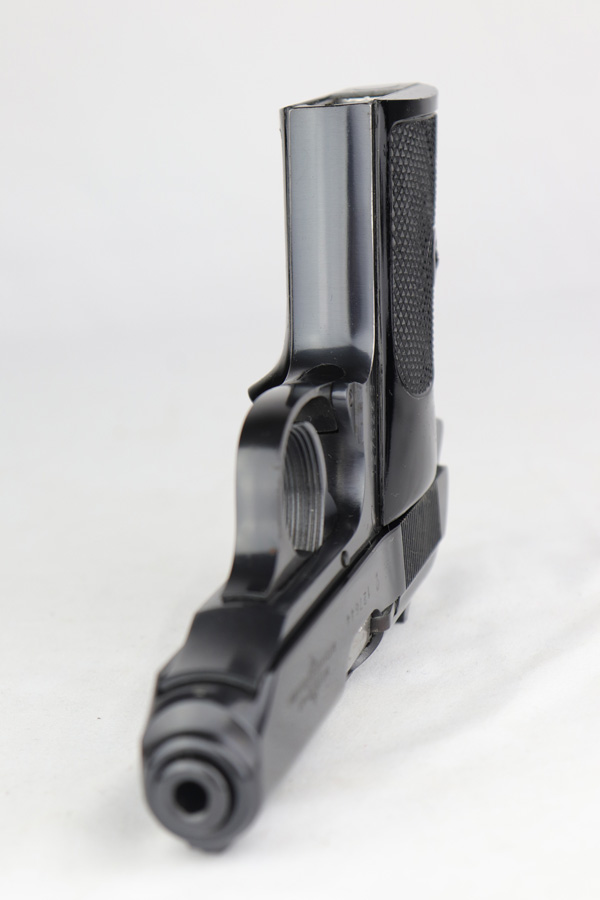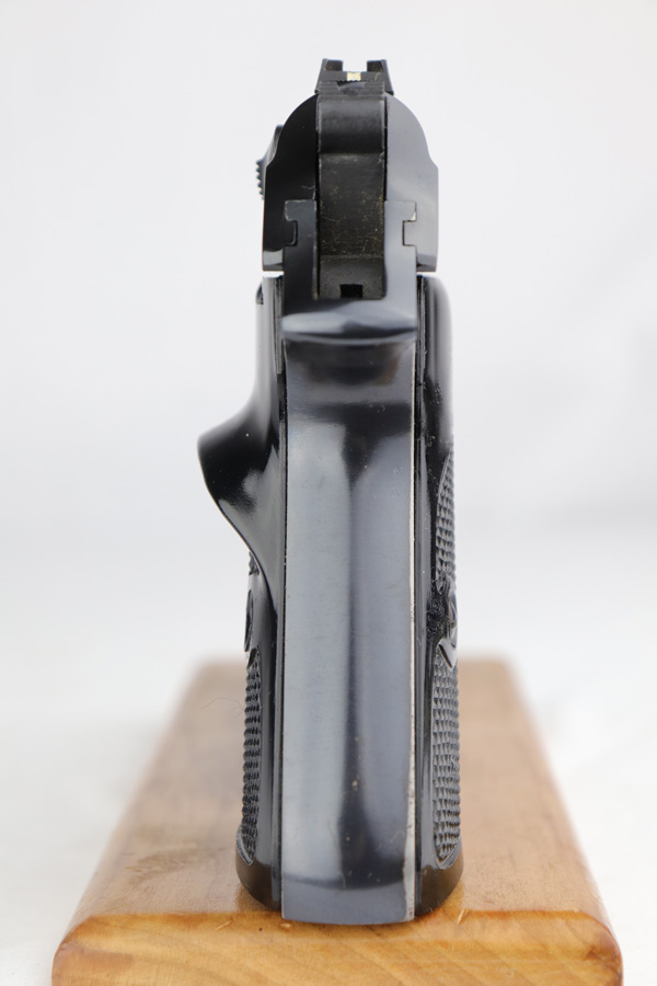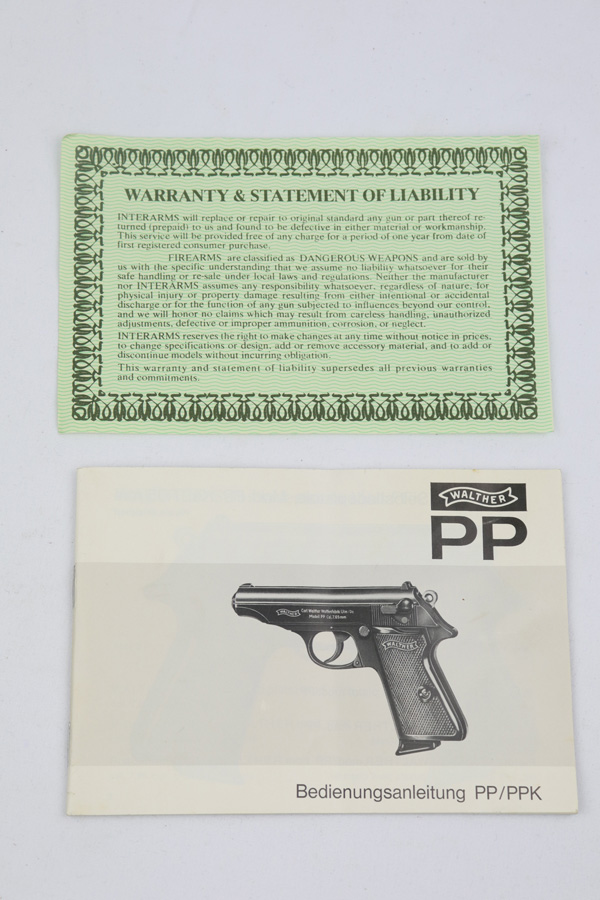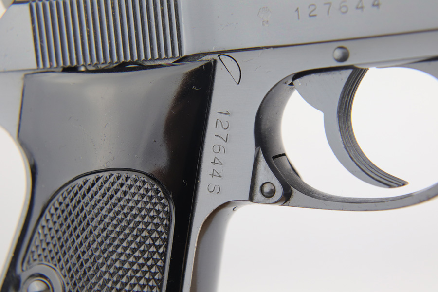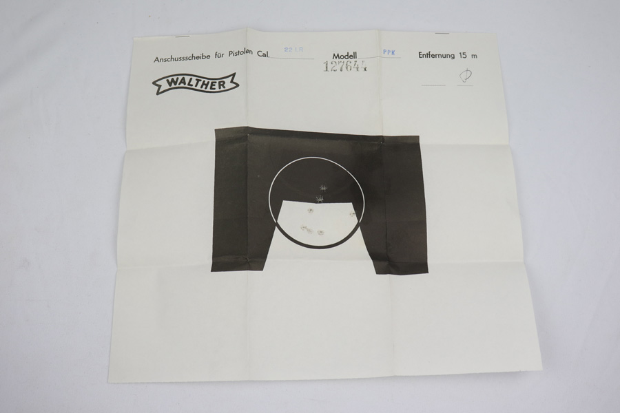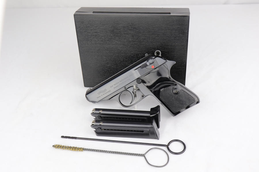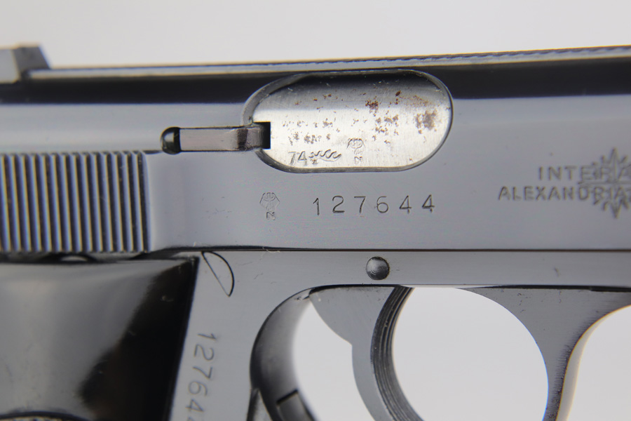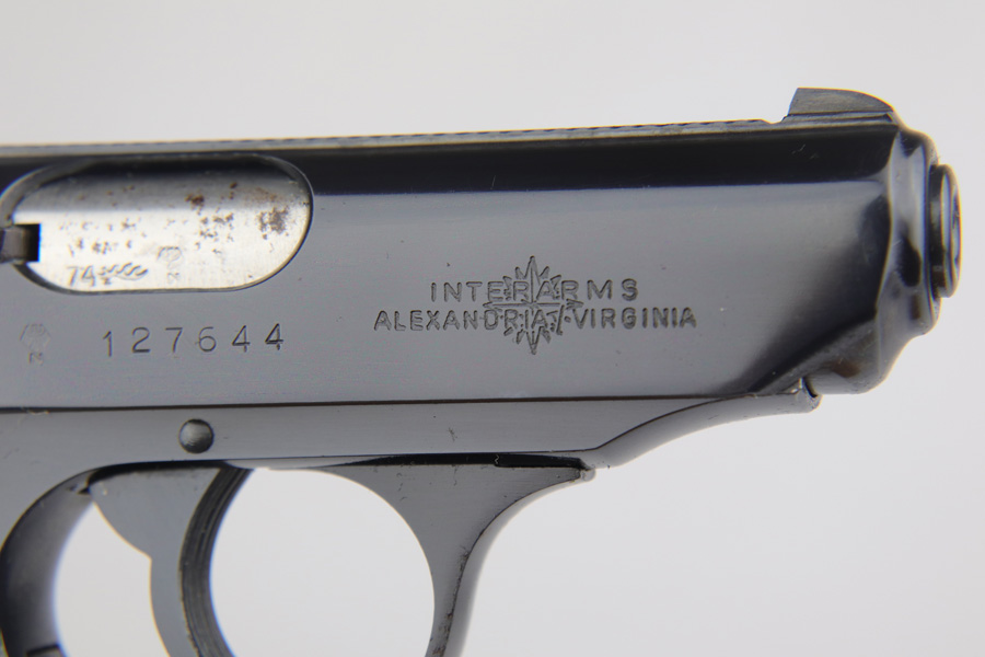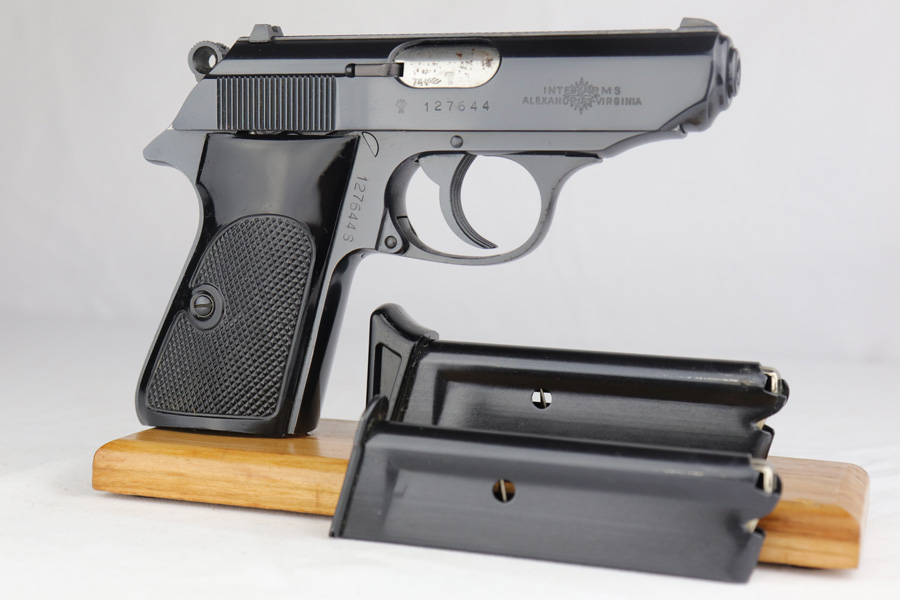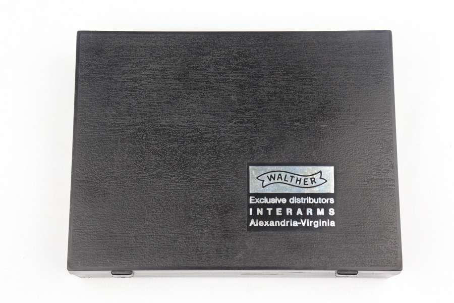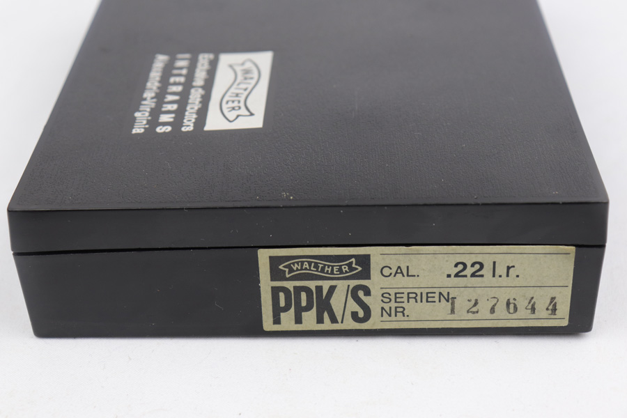 2/5/20 – This is a near-mint Walther PPK/S, chambered in the desirable .22 LR and presented in the original, matching box. The box includes a spare magazine, manual, cleaning rod and the matching test target. The pistol shows virtually zero bluing loss, though there is some age visible on the portion of the barrel exposed by the ejection port. Tiny bit of edge wear on the back strap, too. Thumb rest style grip shows only minor handling wear. Barrel is ’74 dated. Bore is mint. Interarms marking on slide.