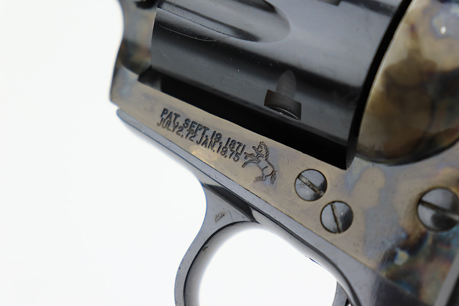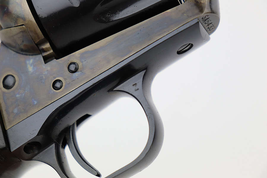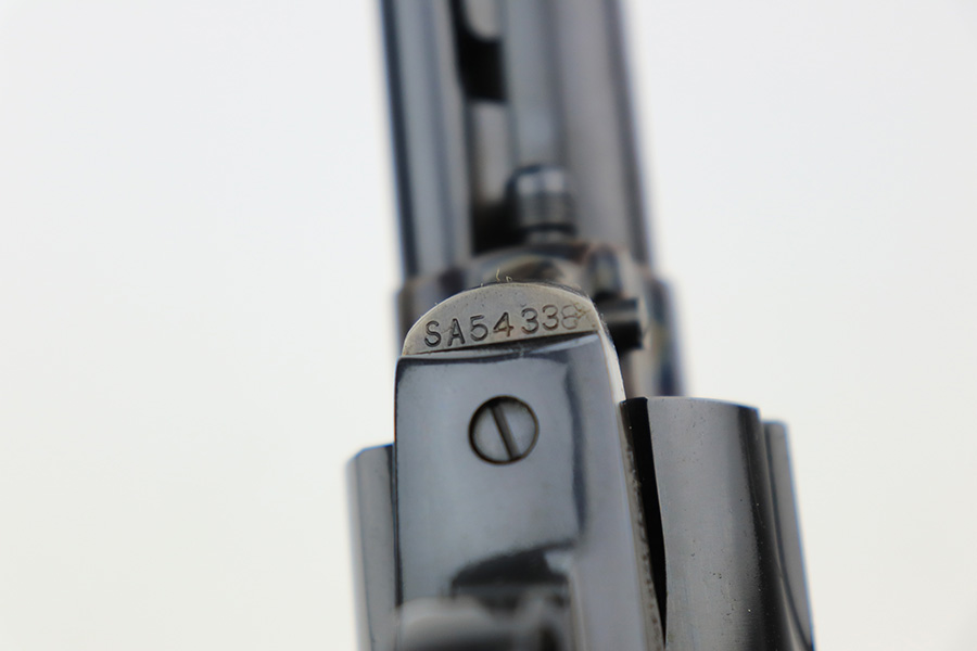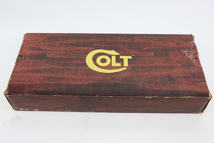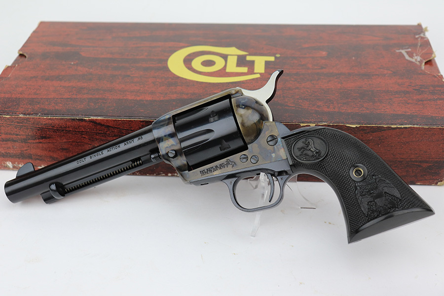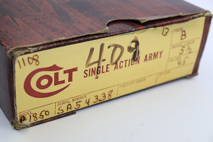 5/18/23 – This is a like-new example of a 3rd Generation Colt Single Action Army Revolver, manufactured in 1981 and chambered in .45 Colt. 5.5″ barrel. The gun comes with its original matching-numbered box, owners manual, and sales papers. The gun itself is in unfired condition with no signs of wear or use – not even a roll mark on the cylinder. Beautiful case-hardening on the frame. Fitted with excellent black plastic “American Eagle” grips. Factory-new bore.