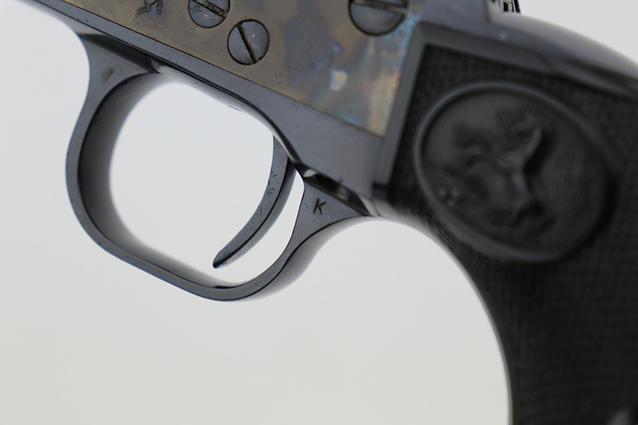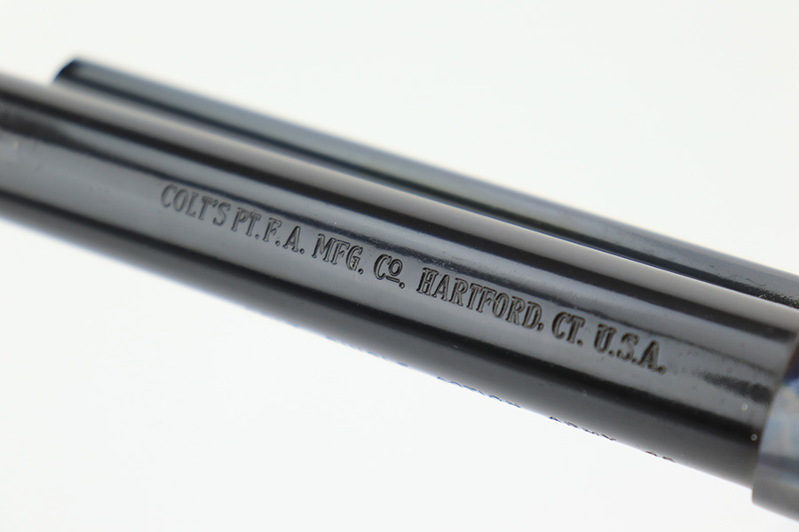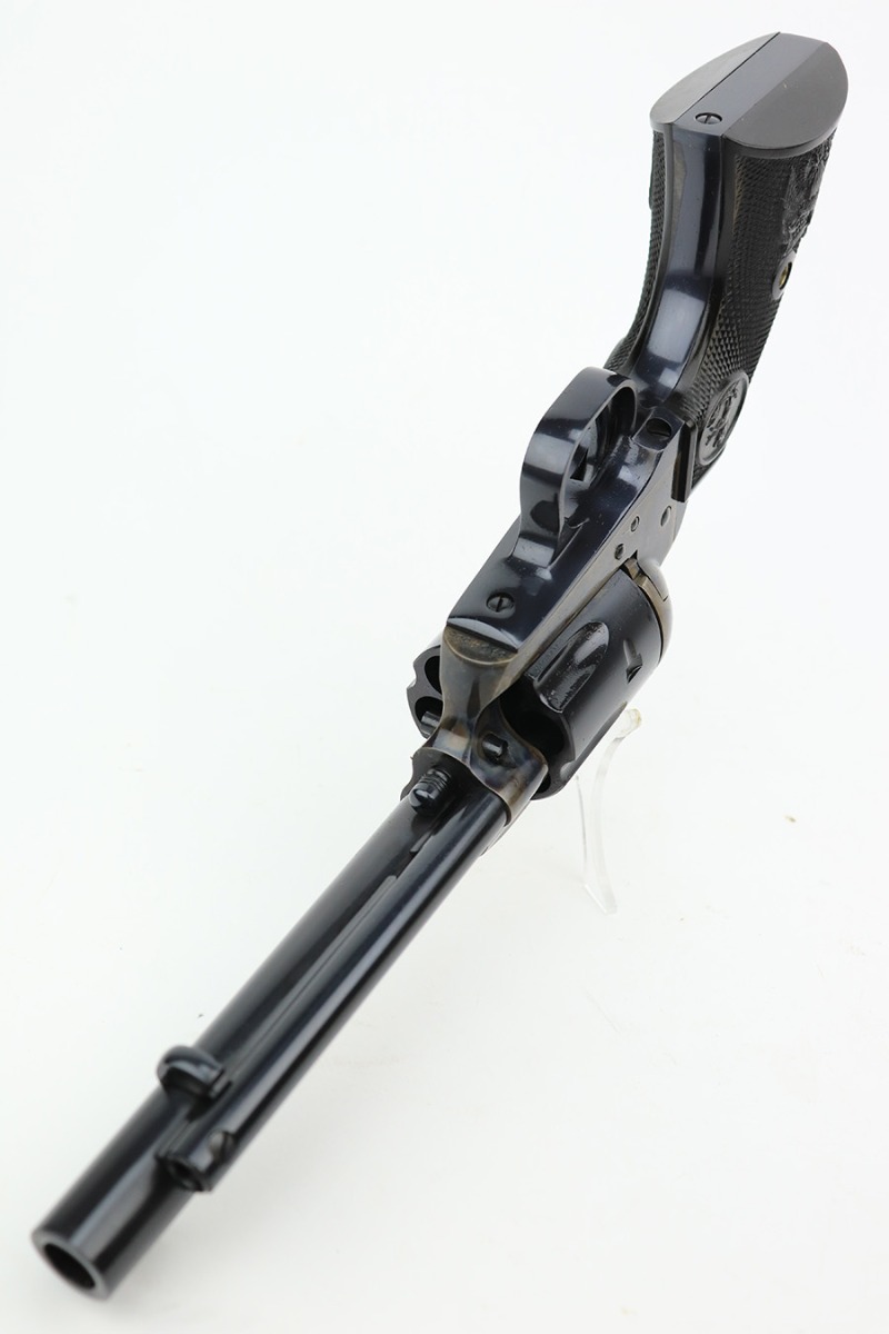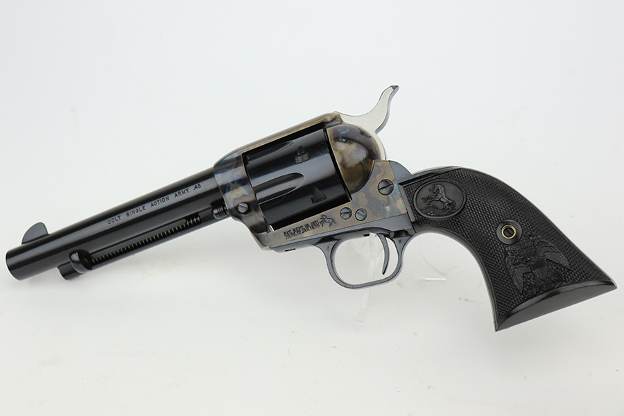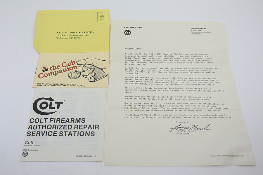 5/18/23 – This is a like-new example of a 3rd Generation Colt Single Action Army Revolver, manufactured in 1981 and chambered in .45 Colt. 5.5″ barrel. The gun comes with its original matching-numbered box, owners manual, and sales papers. The gun itself is in unfired condition with no signs of wear or use – not even a roll mark on the cylinder. Beautiful case-hardening on the frame. Fitted with excellent black plastic “American Eagle” grips. Factory-new bore.
