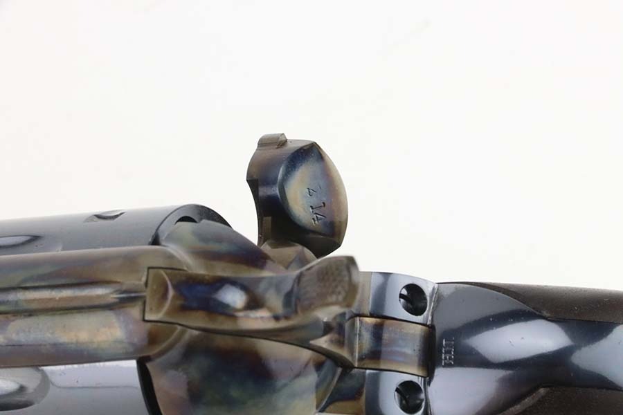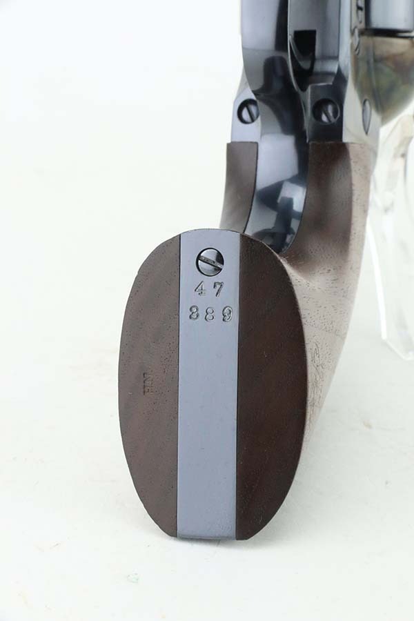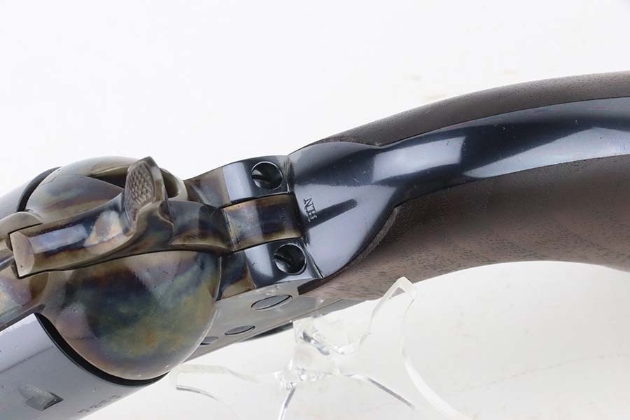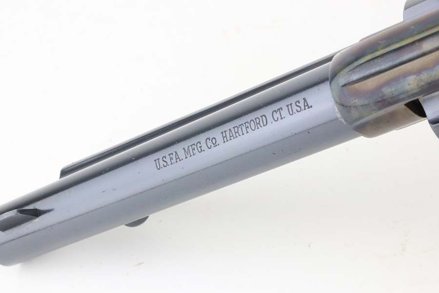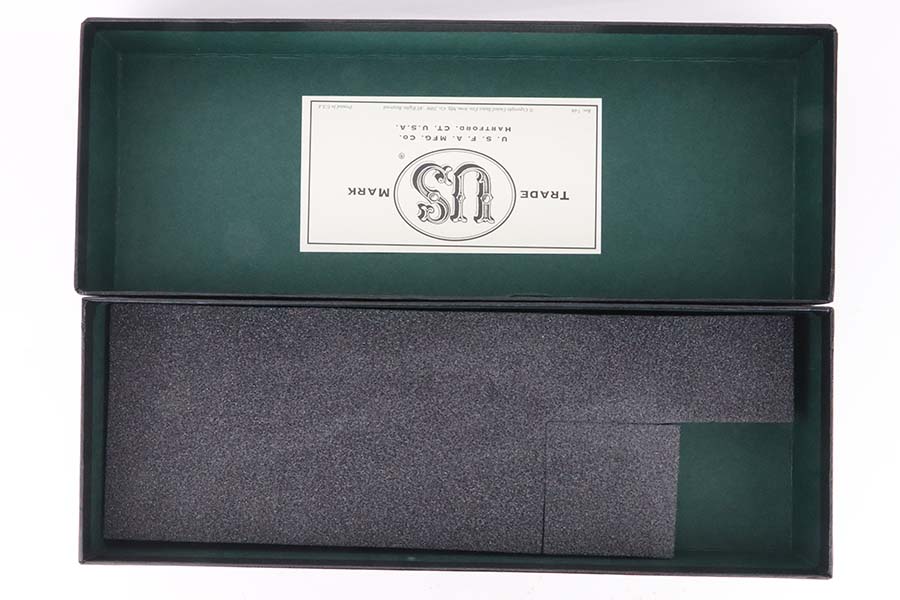 10/14/24 – This is mint example of a USFA revolver, a modern remake of the original Colt Single Action Army Revolver. This one has a 5.5″ barrel and is chambered in .45 Colt. The gun has a stunning high polish blued finish, and the hammer and receiver are beautifully case-hardened. It comes with its original box (not numbered), warranty card, and owners manual. The gun is mint – not even a roll mark on the cylinder. There are a few tiny surface scratches on the barrel. Fitted with mint wood grips. Mint bore.