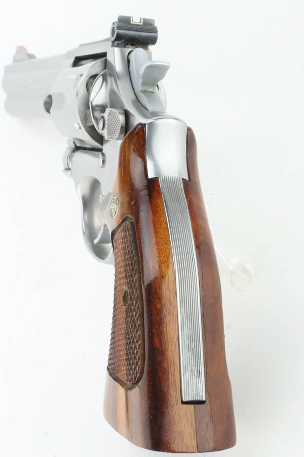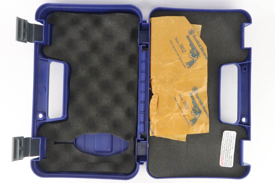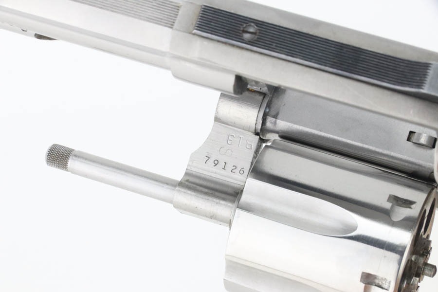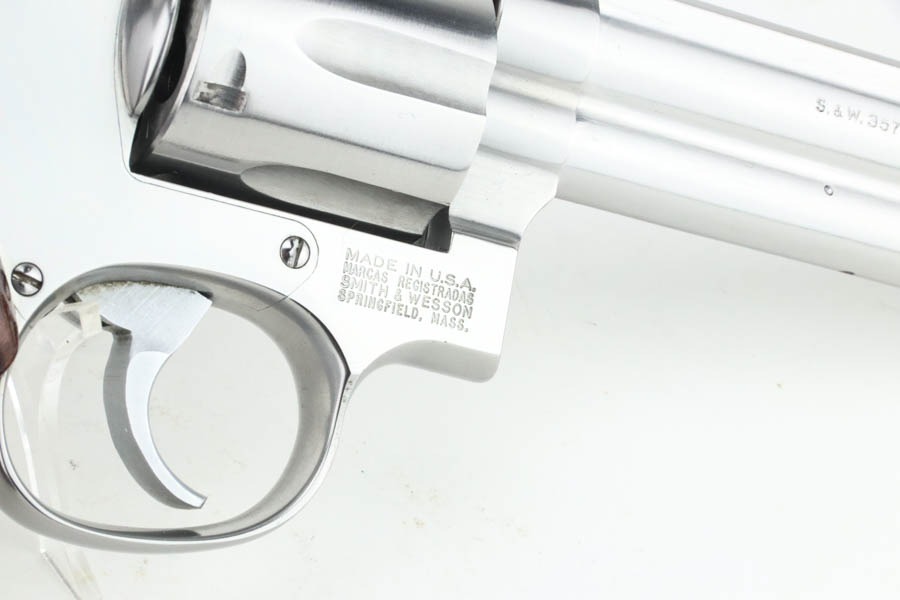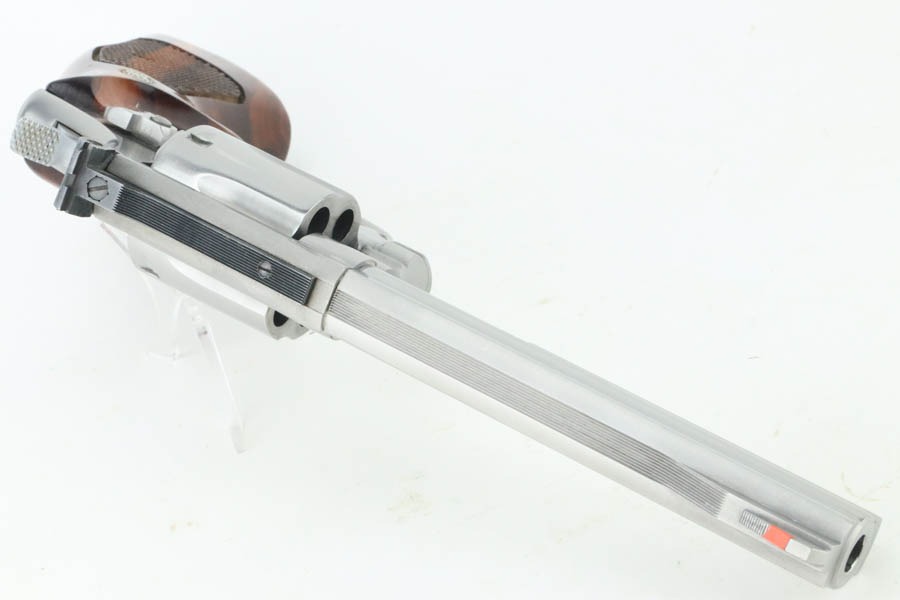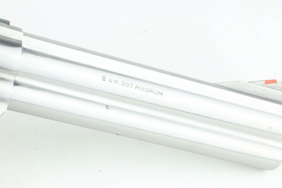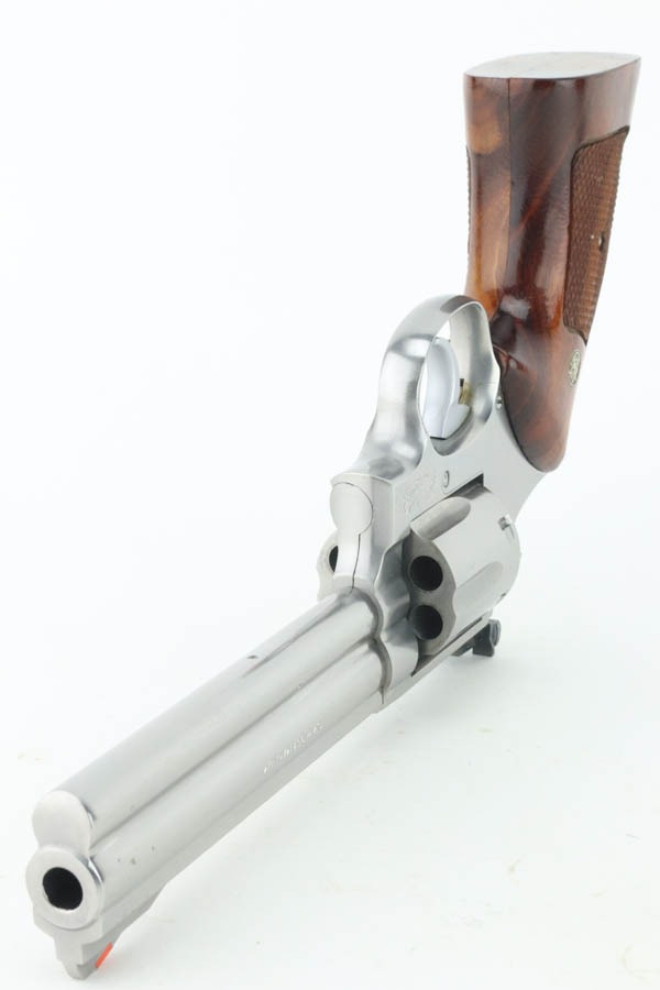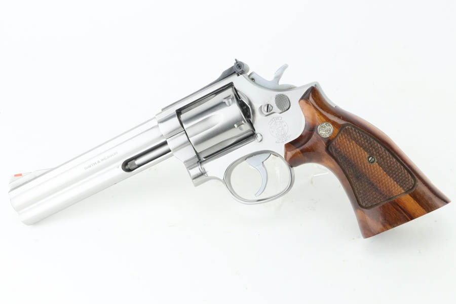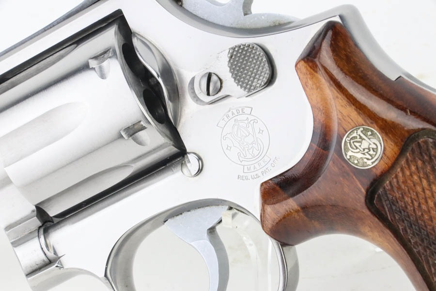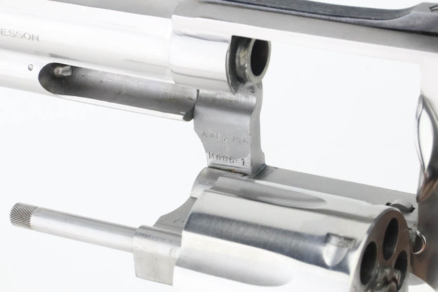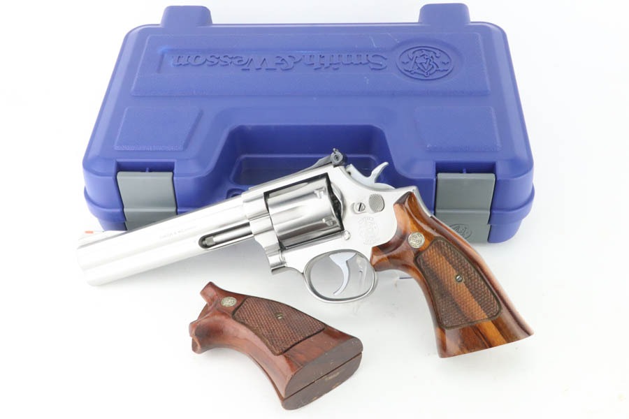 10/16/24 – This is a mint S&W Model 686-1 Revolver. Chambered in .357 Magnum with a 6 inch barrel. It has a really nice stainless finish and shows no signs of wear – just a hint of a roll mark on the cylinder. Comes with a correct hard case (not originally matching, but has been re-numbered to match), gun lock, and a spare set of checkered wood grips. Mint bore. Smooth action.