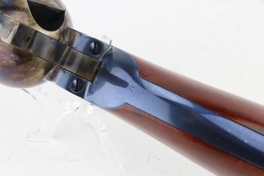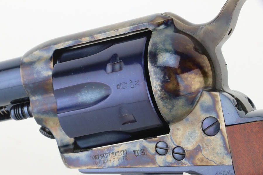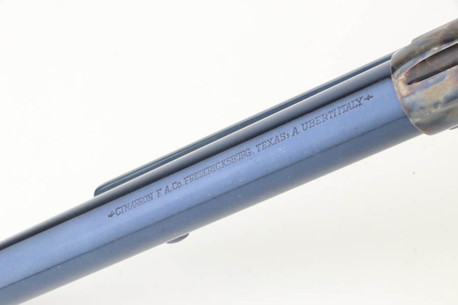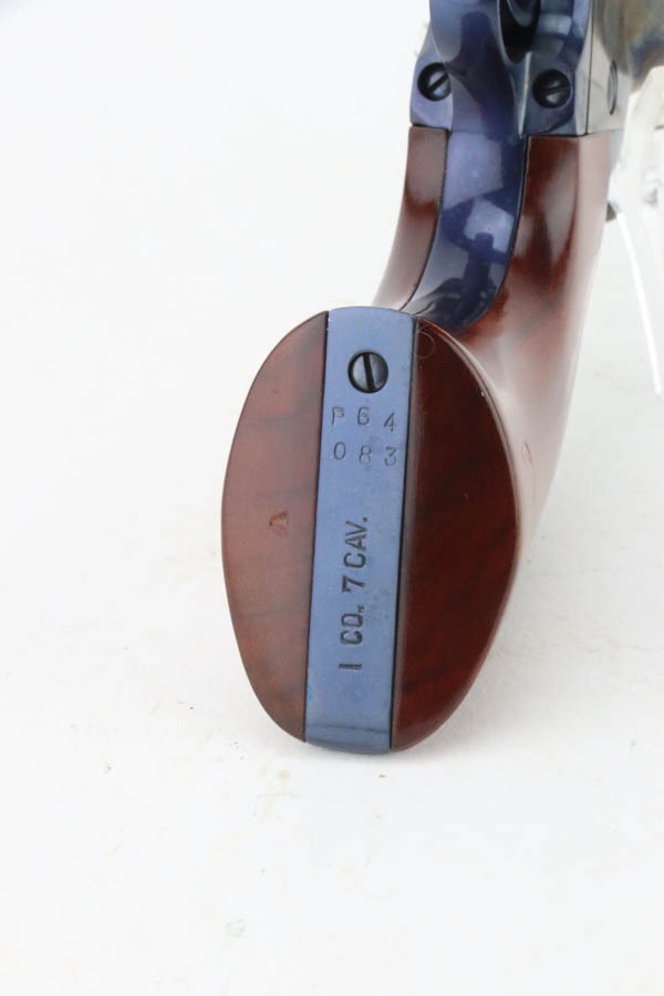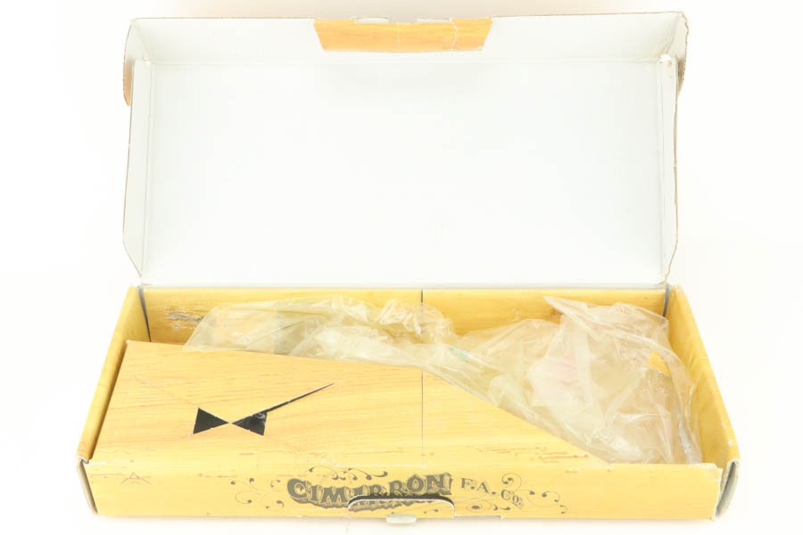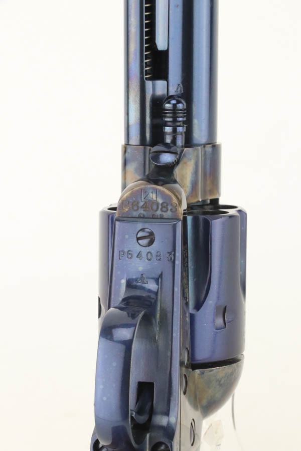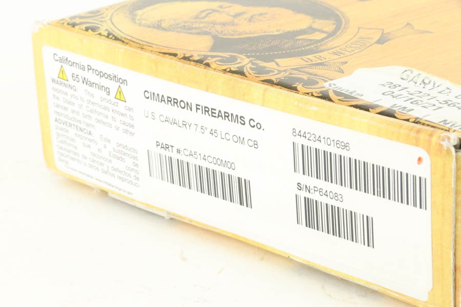 10/16/24 – This is a mint example of a modern Cimarron-made Colt Single Action Army Cavalry Model. Chambered in .45 Colt with a 7.5 inch barrel. Like the original Colt Cavalry Model, it is “US” Property marked, has martial inspection stamps, and has a military cartouche on the left grip. Cavalry marking on the butt of the frame. Most of the gun has a beautiful and bright fire-blued finish. Gorgeous case-coloring on the frame. The gun shows no signs of wear or use except for a couple of very light surface scratches on the cylinder. Mint bore. Comes with its original matching-numbered box, owners manual, and sales papers.