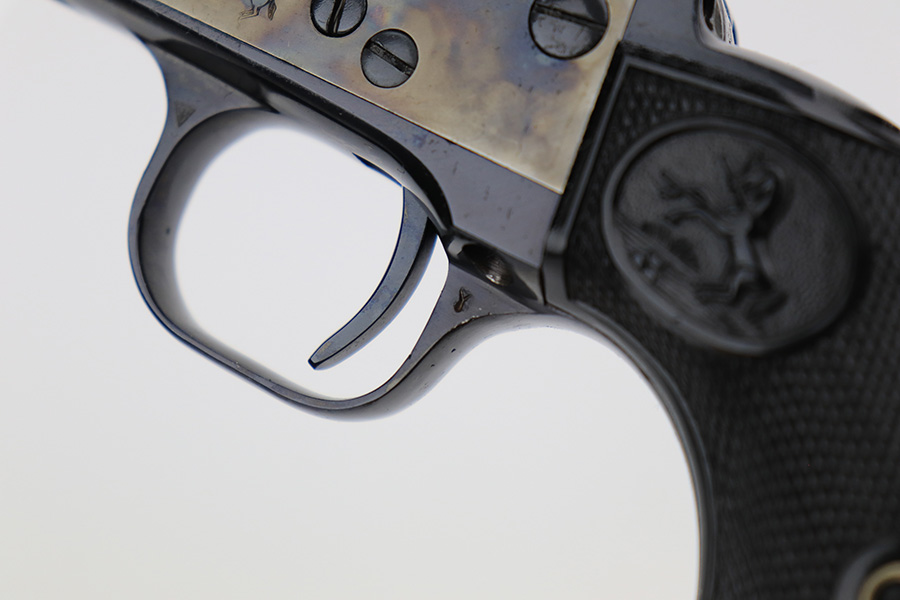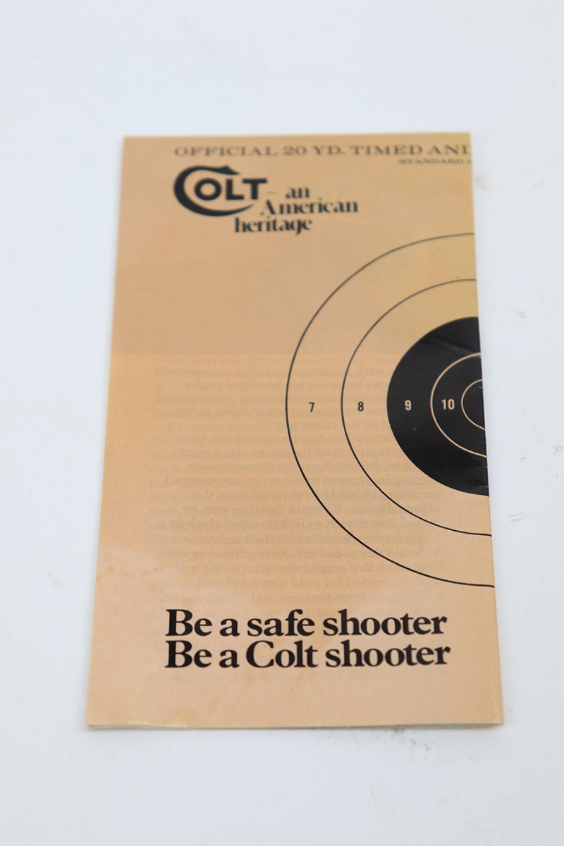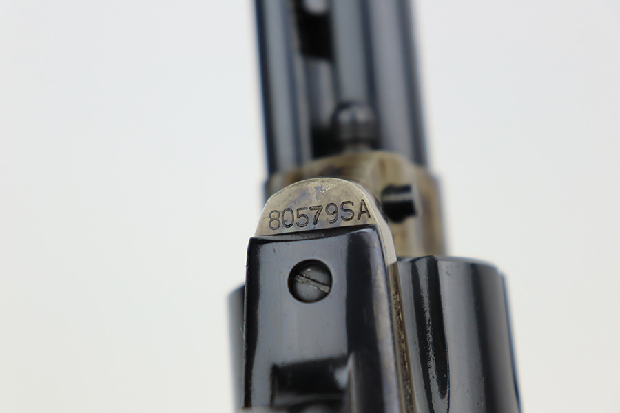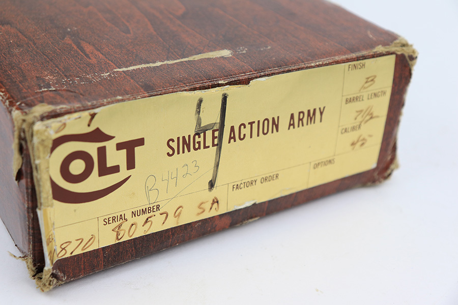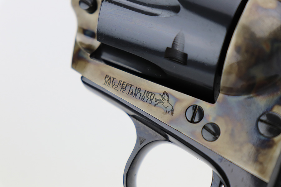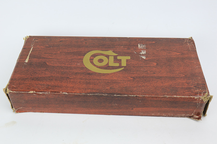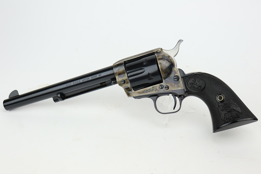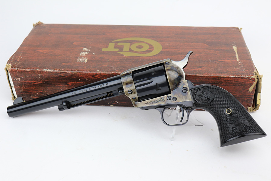 5/18/23 – This is a like-new example of a 3rd Generation Colt Single Action Army Revolver, manufactured in 1976 and chambered in .45 Colt. 7.5″ barrel. The gun comes with its original matching-numbered box and owners manual. The gun itself is in unfired condition with no signs of wear or use – not even a roll mark on the cylinder. Beautiful case-hardening on the frame. Fitted with excellent black plastic “American Eagle” grips. Factory-new bore.