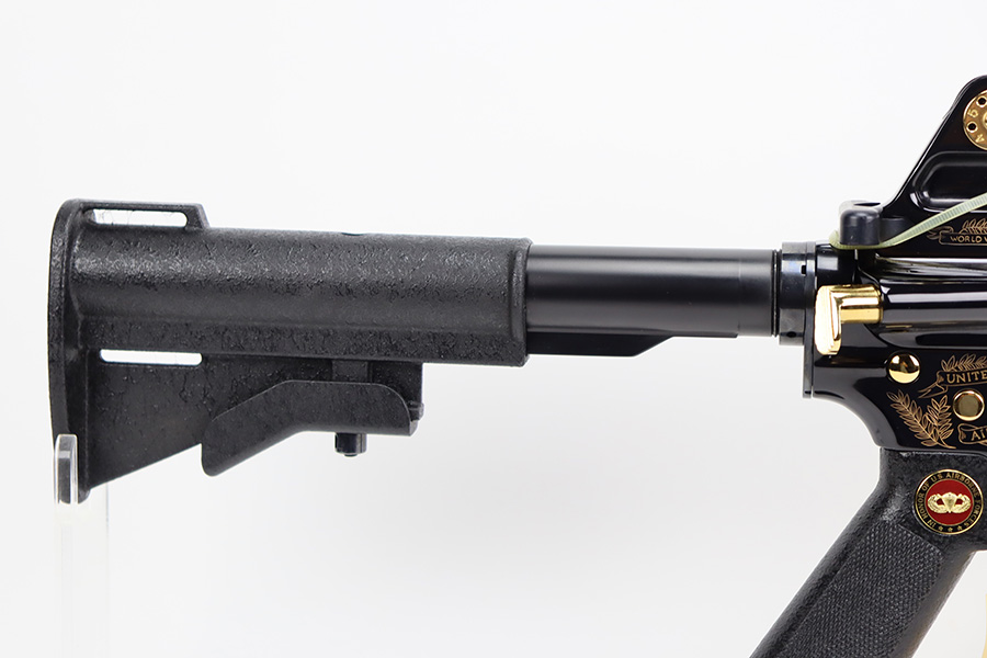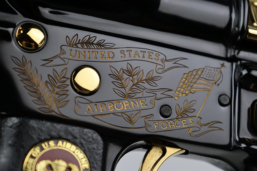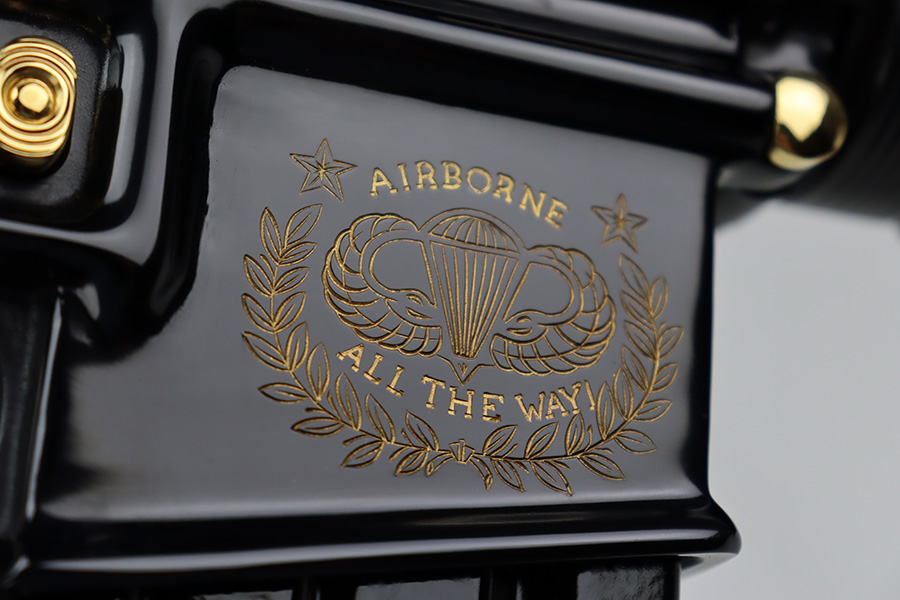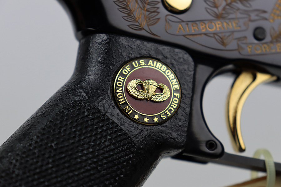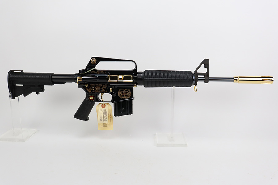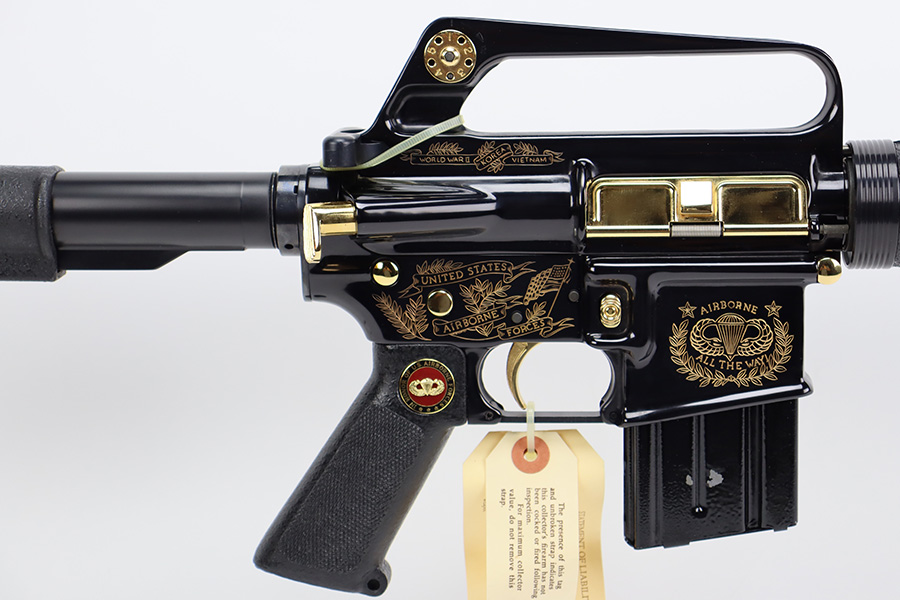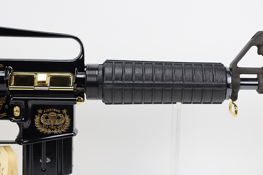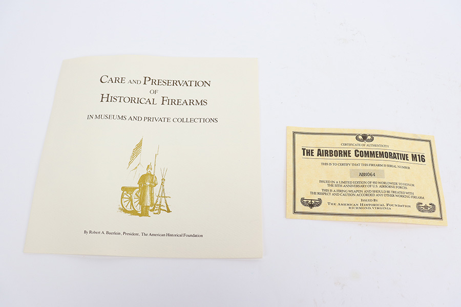 8/21/23 – “Issued in a limited edition of 950 worldwide to honor the 50th anniversary of U.S. Airborne forces”, this is the American Historical Foundation’s Airborne Commemorative M16. It’s in mint condition and appears unfired. It features gold inlay script on the receiver, with text including ‘UNITED STATES AIRBORNE FORCES’ and ‘AIRBORNE ALL THE WAY’. The small parts also feature gold accents, including the trigger, mag release, flash hider, etc. It comes in the original shipping box, and has the original COA from the AHF.