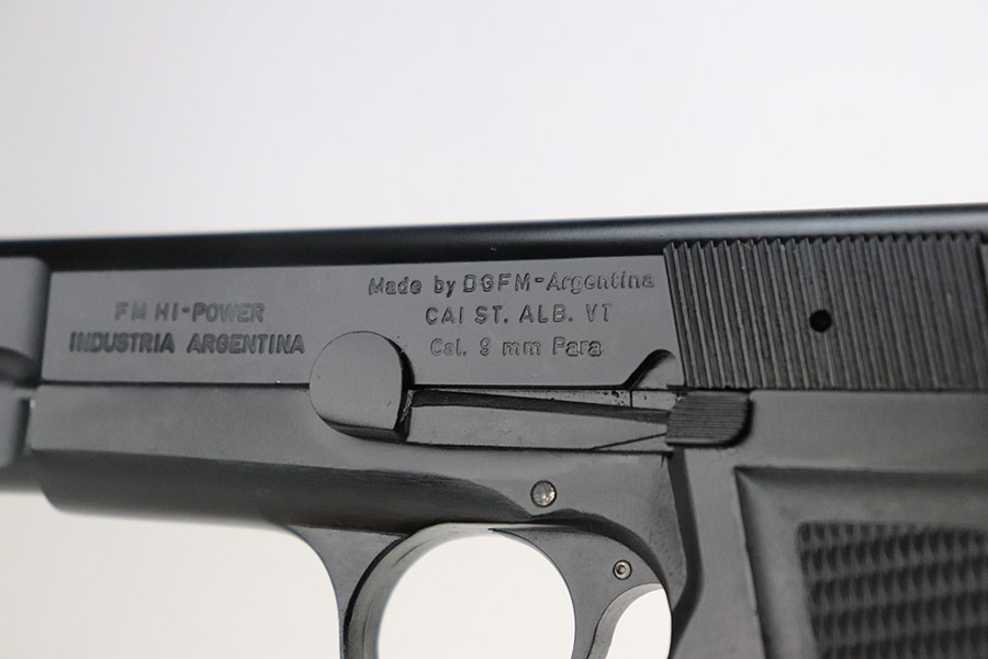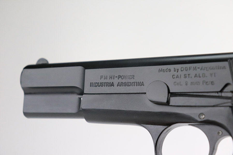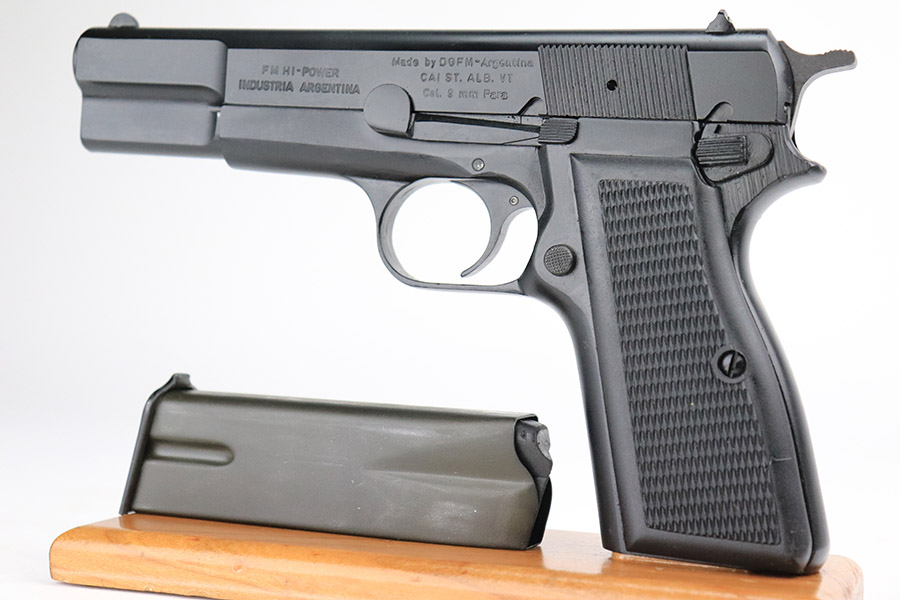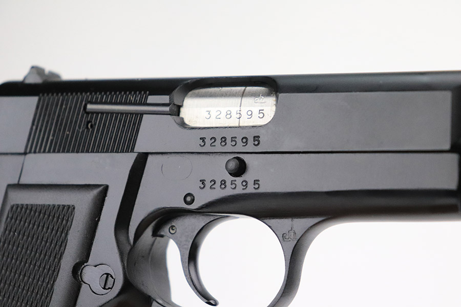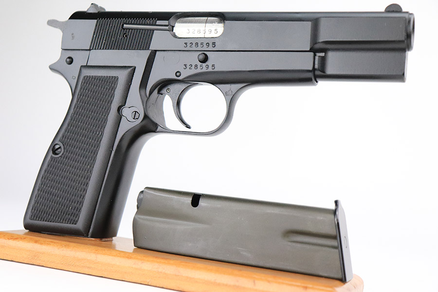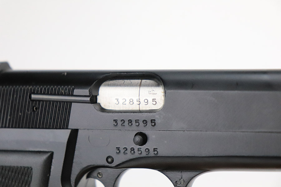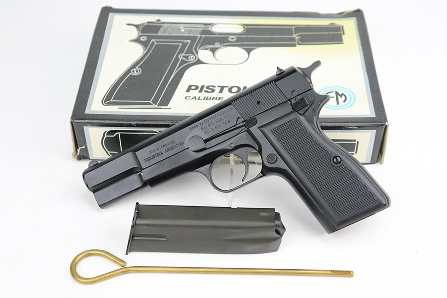 1/30/23 – This is a like-new example of a Hi Power Pistol manufactured by DGFM in Argentina. The gun is all matching and has an import mark on the left side of the slide. It comes with its original matching-numbered box and cleaning rod. The gun itself has retained virtually all of its matte black finish with very little sign of wear or use. Comes with excellent black plastic grips and one proper magazine. The bore is like-new.