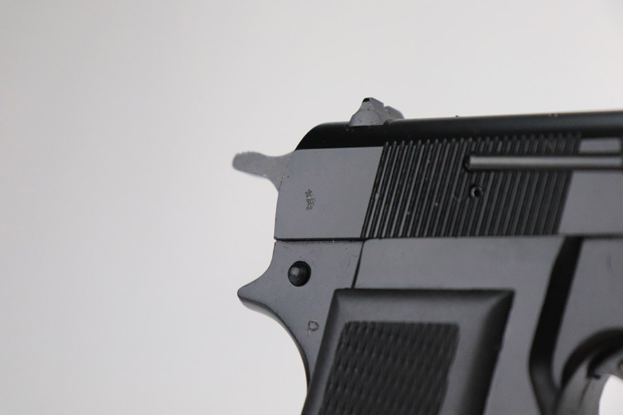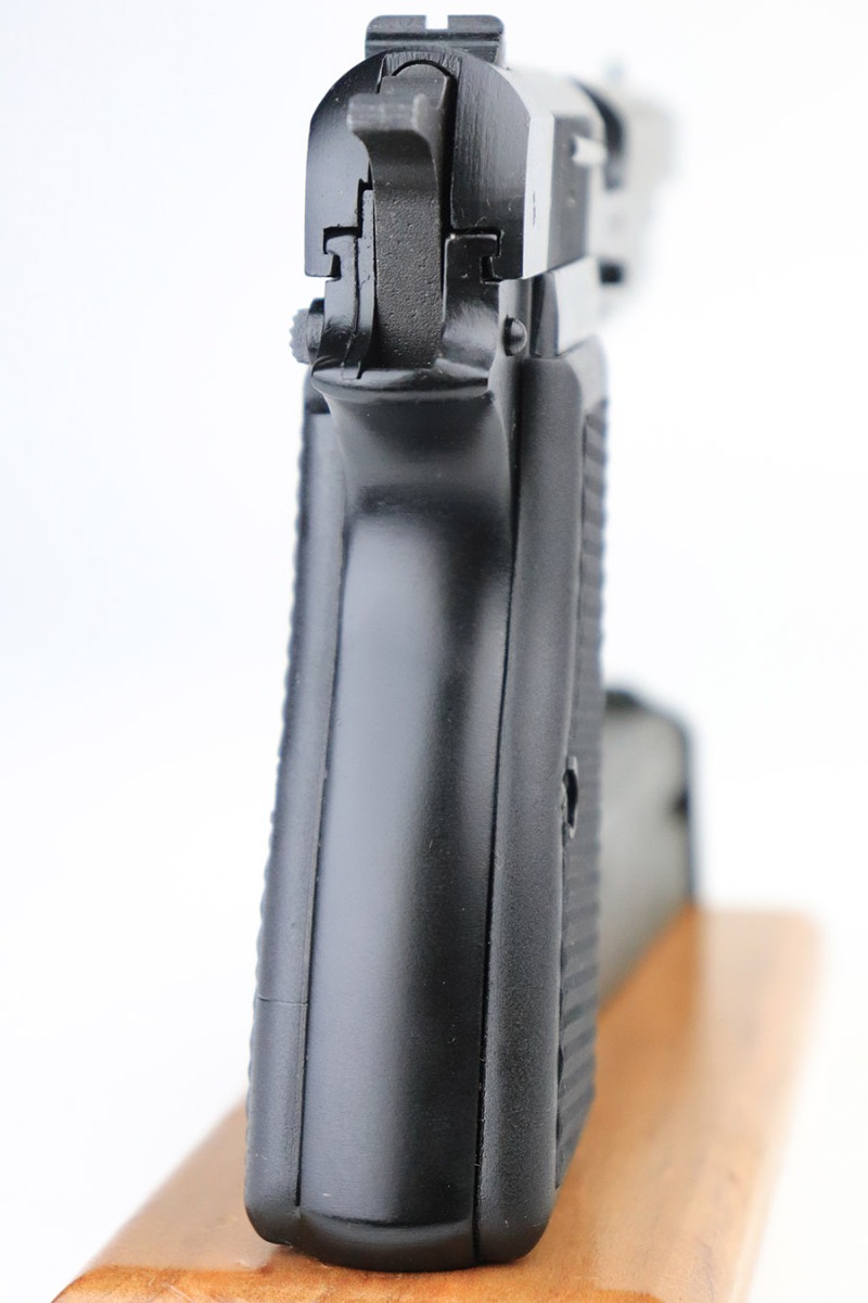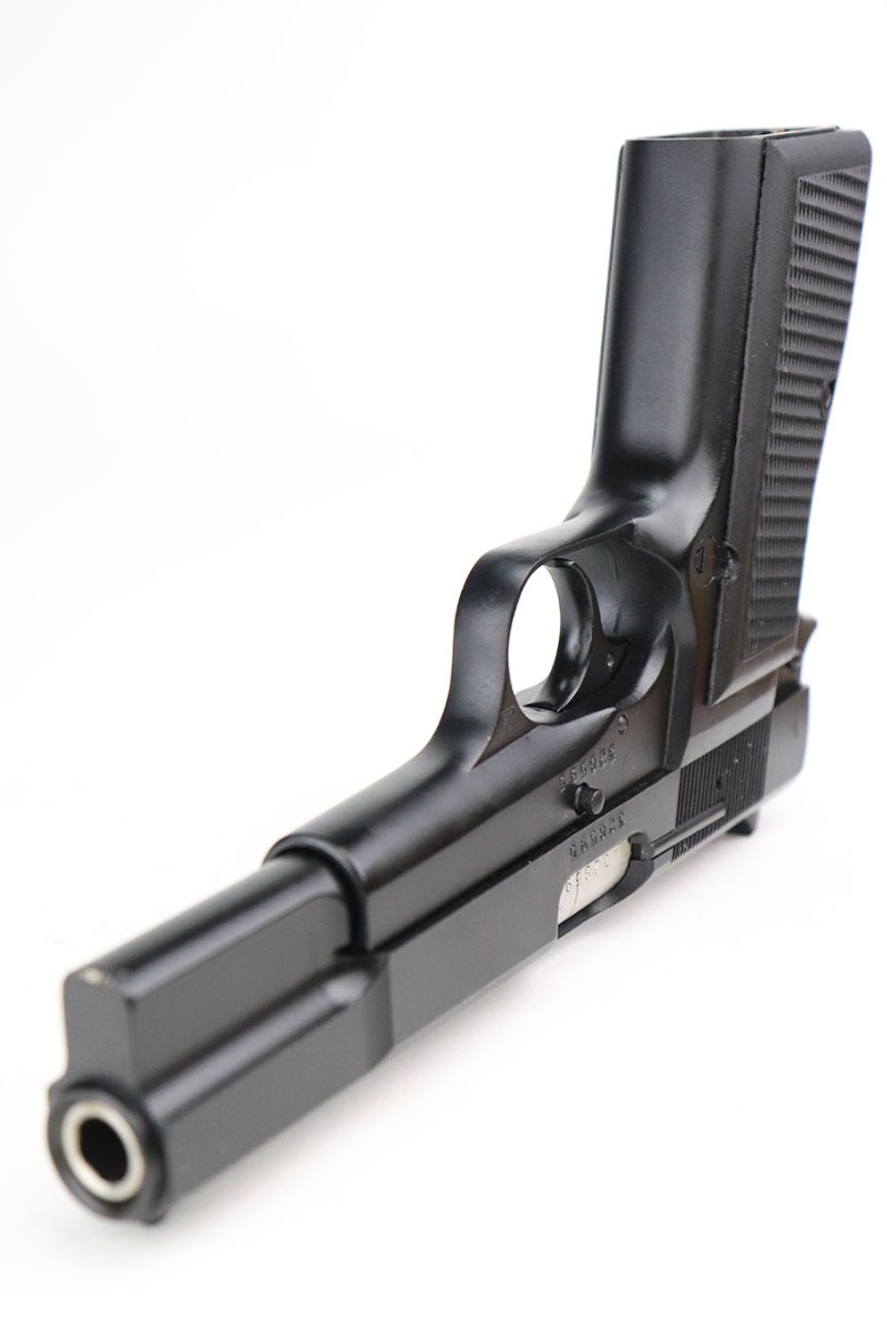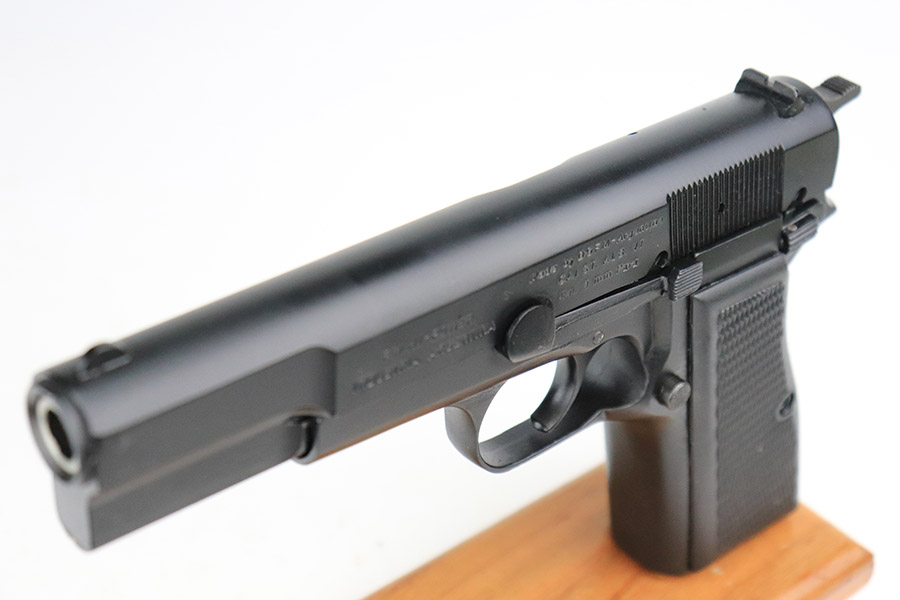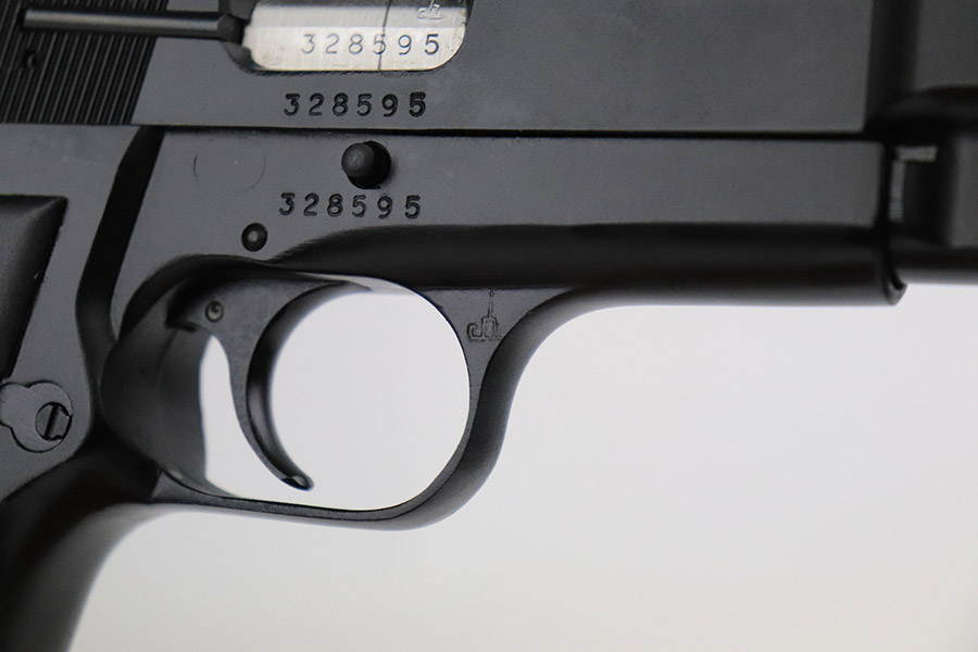 1/30/23 – This is a like-new example of a Hi Power Pistol manufactured by DGFM in Argentina. The gun is all matching and has an import mark on the left side of the slide. It comes with its original matching-numbered box and cleaning rod. The gun itself has retained virtually all of its matte black finish with very little sign of wear or use. Comes with excellent black plastic grips and one proper magazine. The bore is like-new.