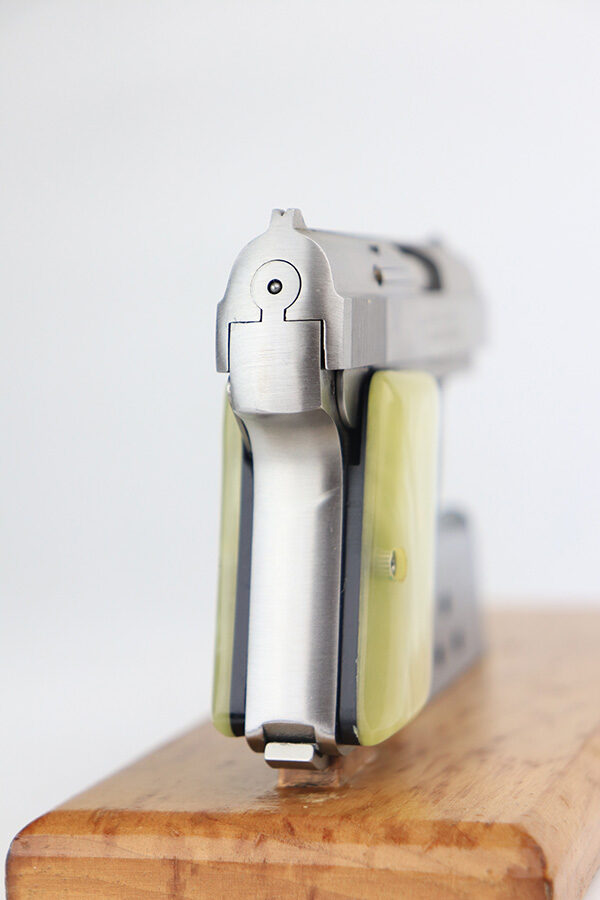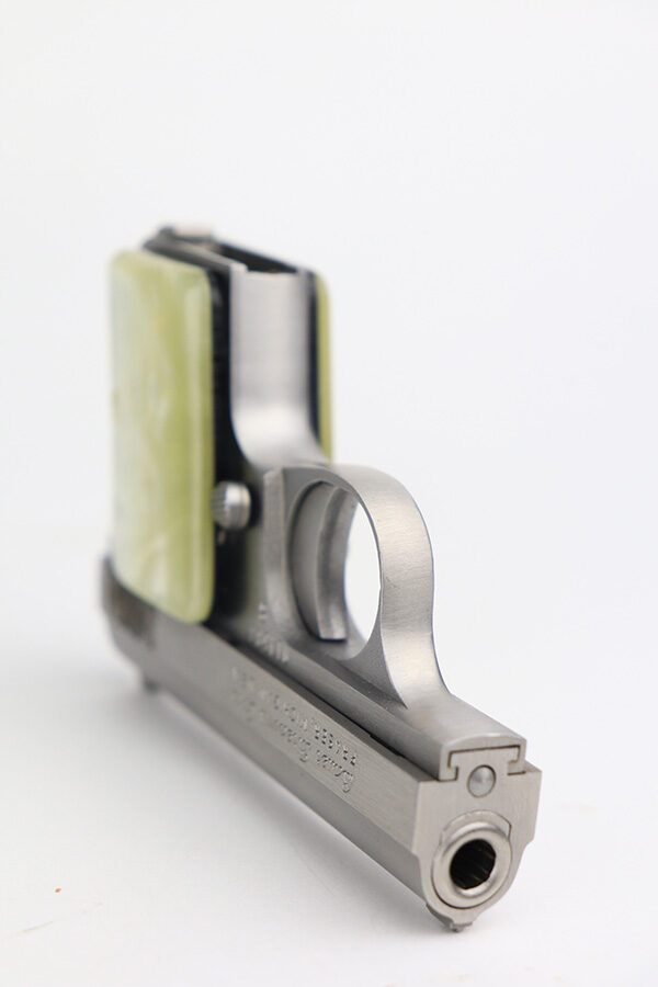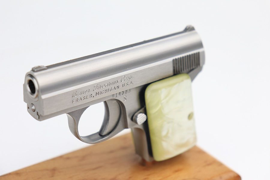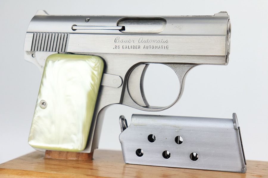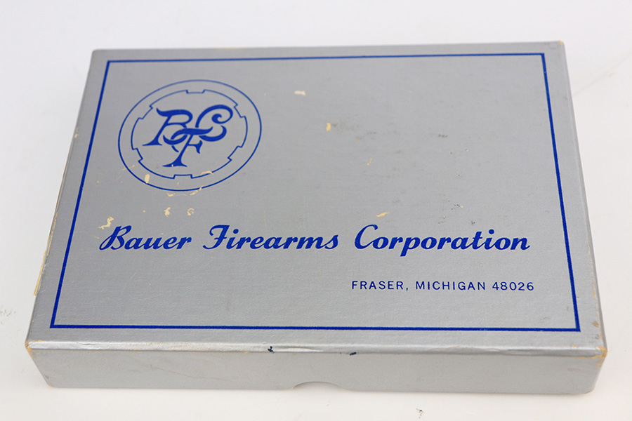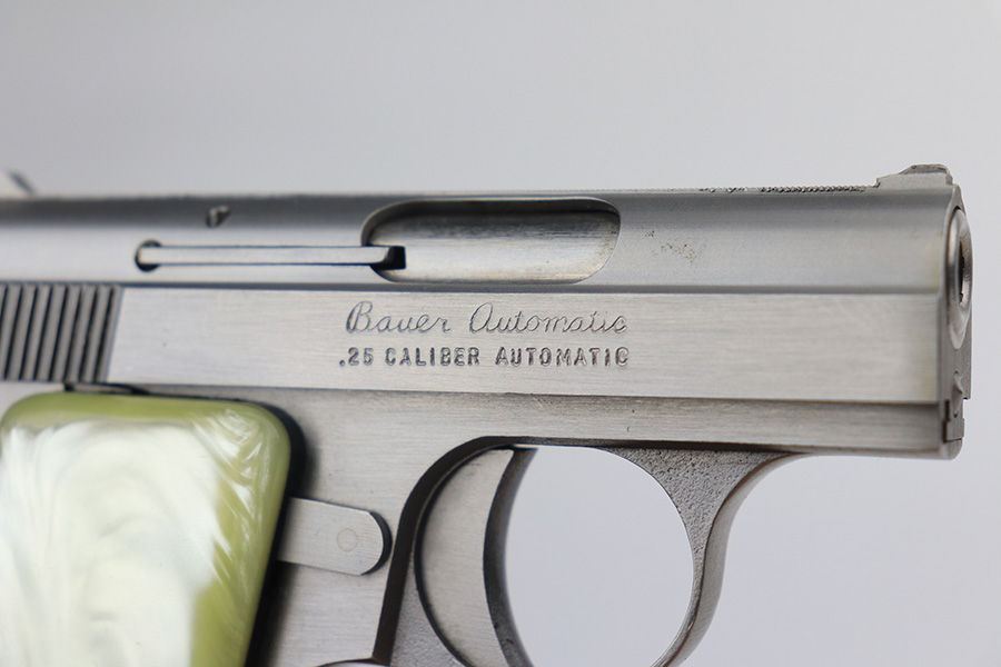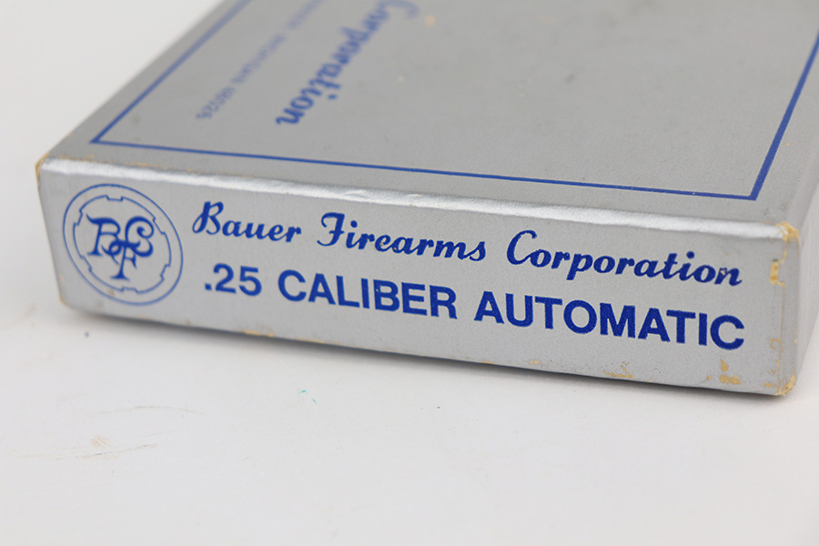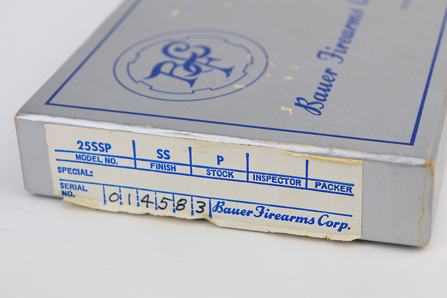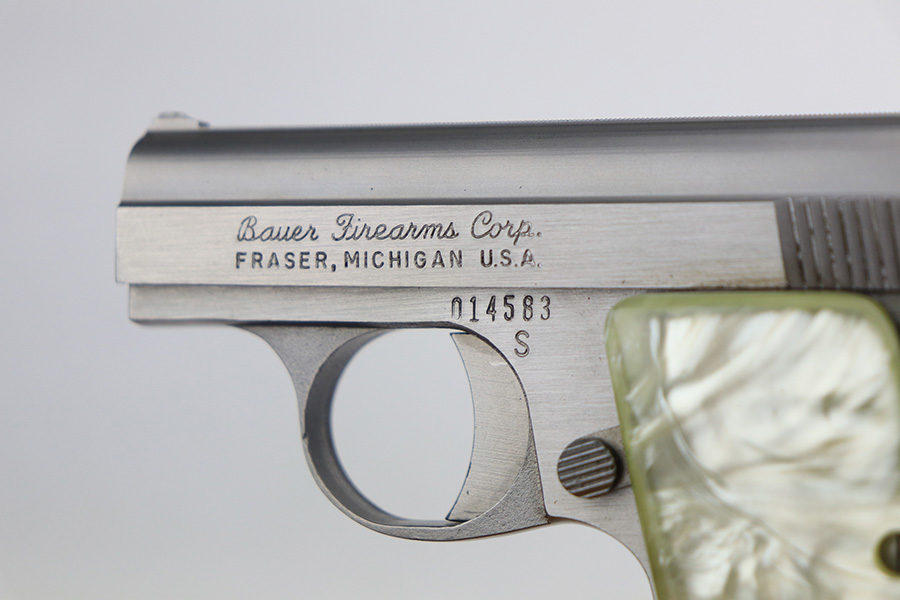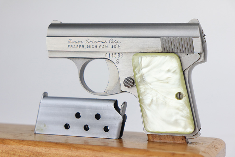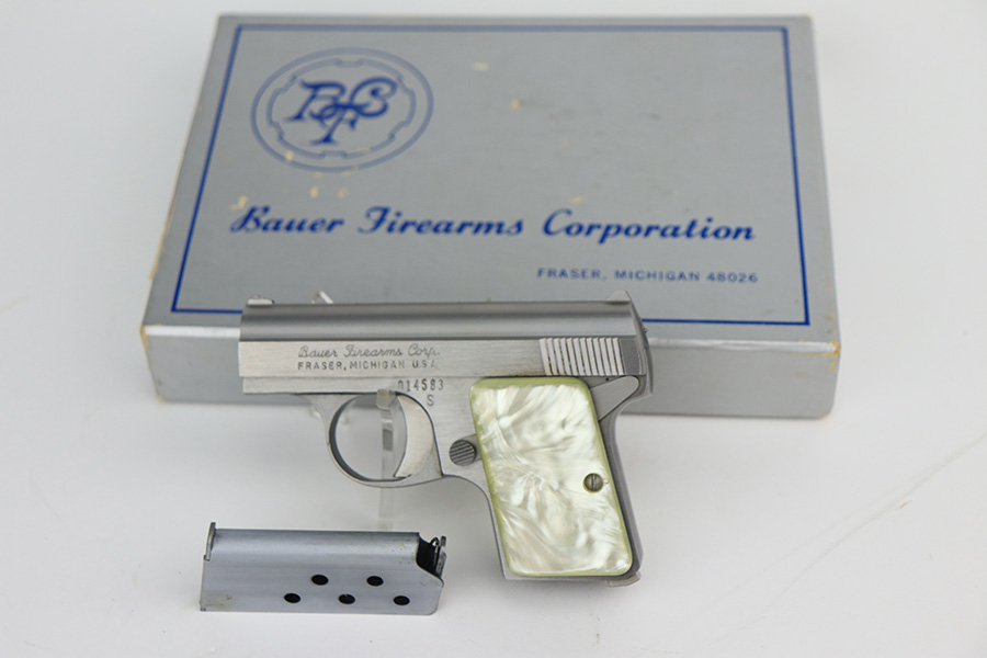 1/26/22 – This is a like-new example of a Bauer .25 Auto Vest Pocket pistol manufactured between 1972 and 1984. The gun comes with the original matching-numbered box, Bauer soft case, and one proper magazine. The gun has a really nice stainless finish and is in like-new condition with no obvious signs of wear. Comes with beautiful pearl grips. The bore is near-mint.