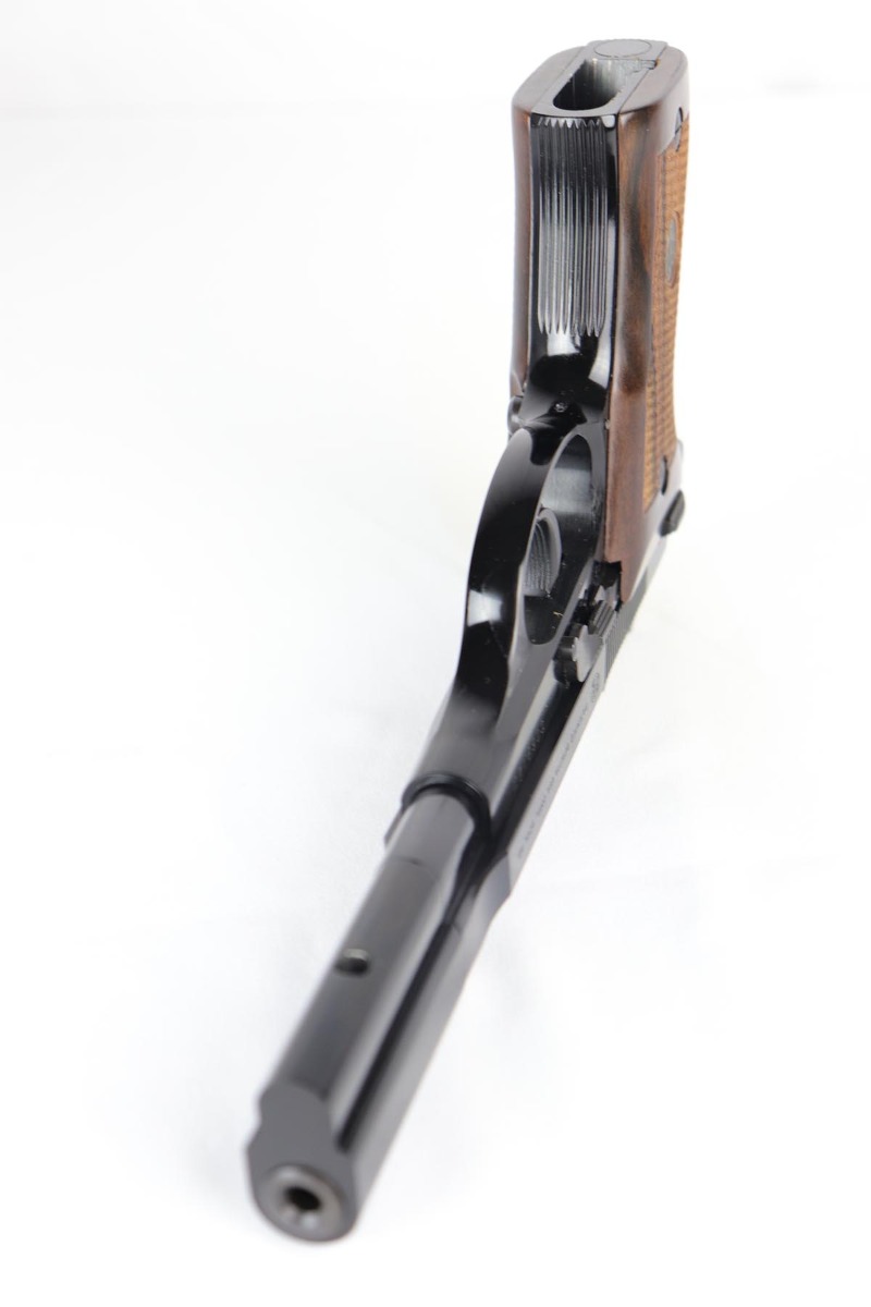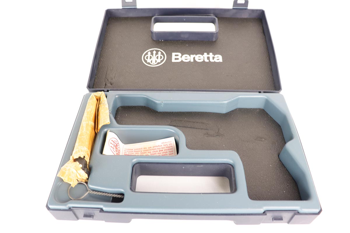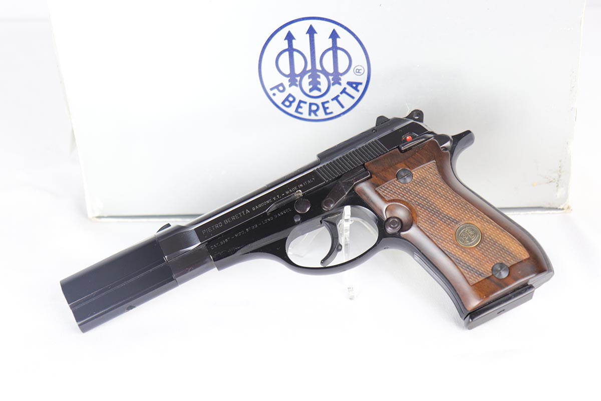 10/10/18 – This is yet another rarely seen Beretta target model. Made on the “Cheetah” frame, it is chambered in .22LR, sports a long 6 inch barrel with weights, and is absolutely mint and appears unfired. This is a complete set, with a matching serial numbered box, an original beretta plastic case and all the paperwork, wrapping paper and accessories. Beautiful high polished blue. Beautiful wood grips. Date coded “AT”- made in 1989. A superb example of a scarce gun.