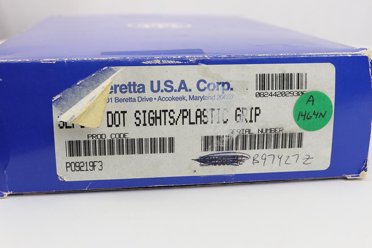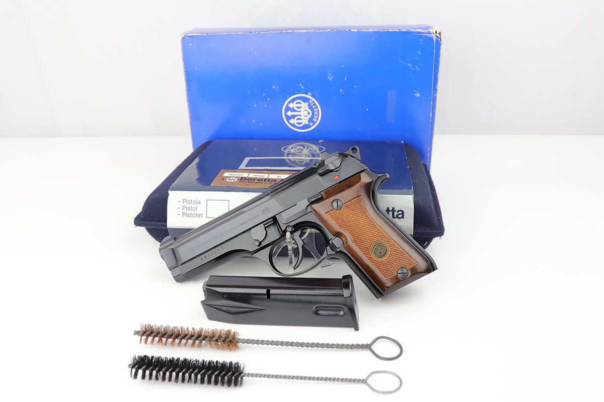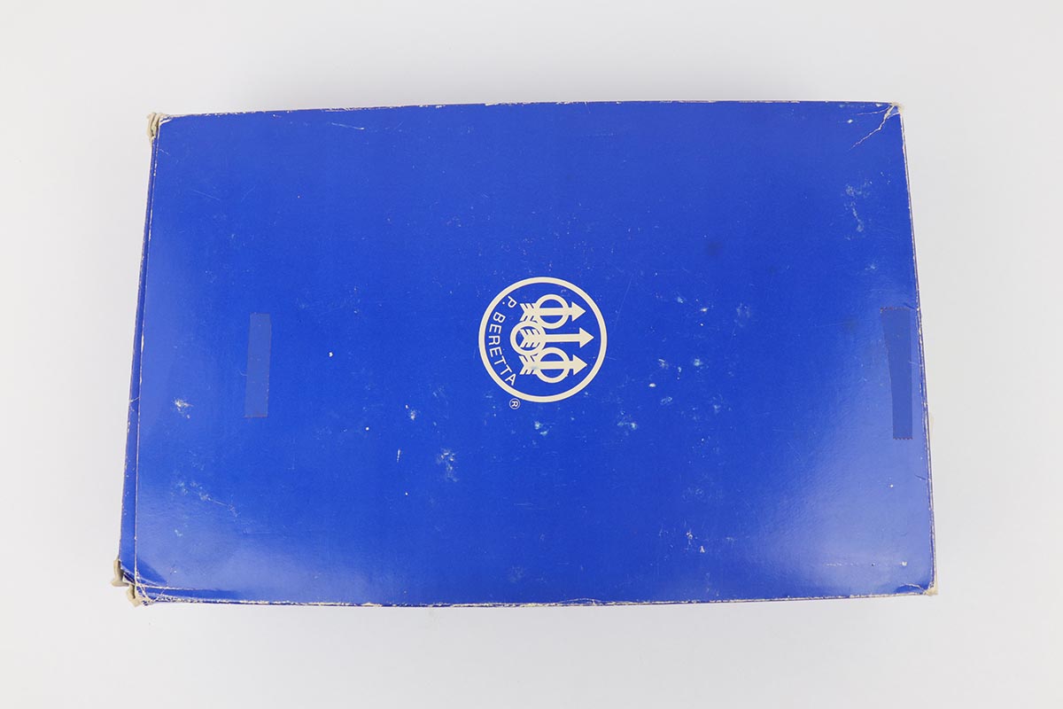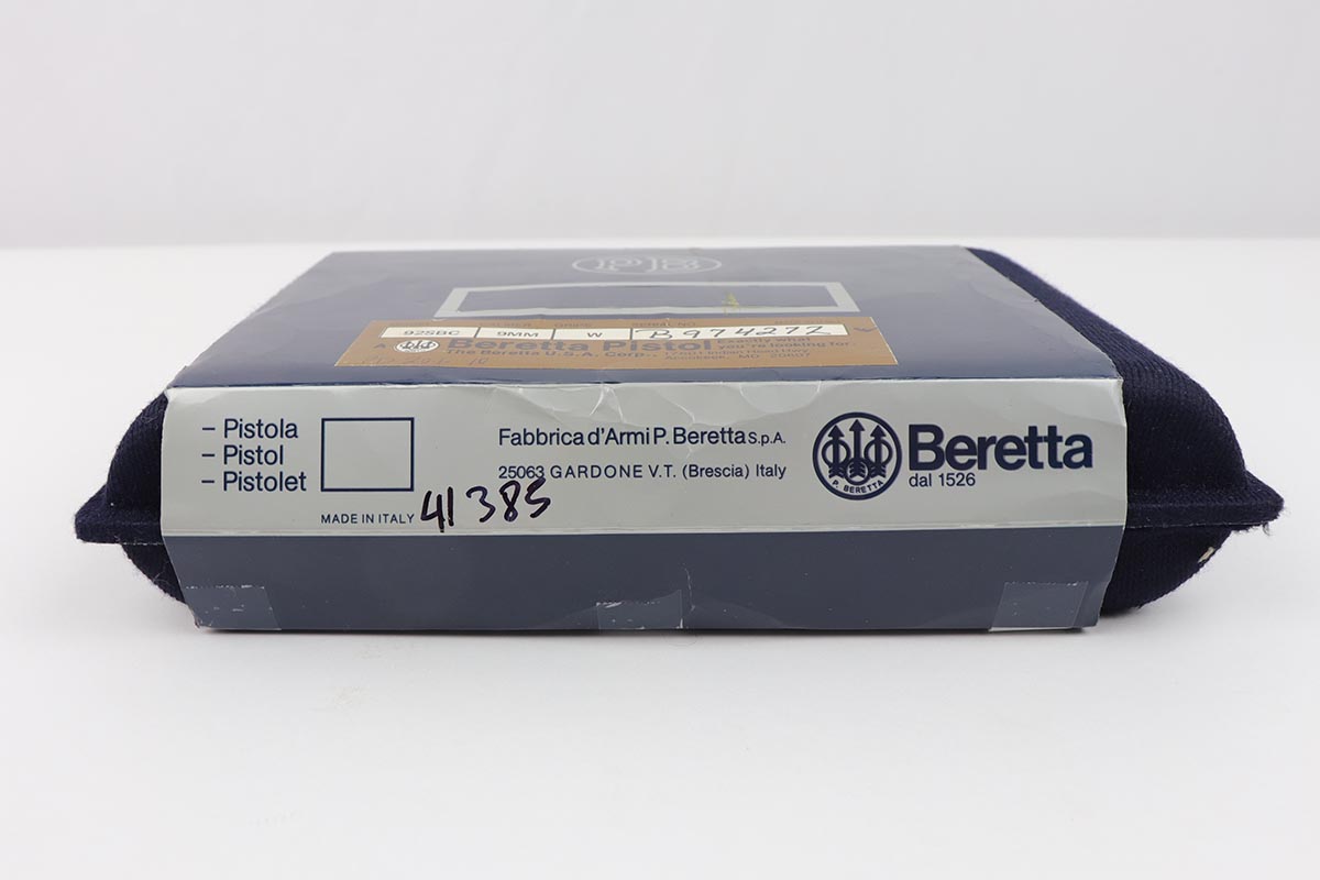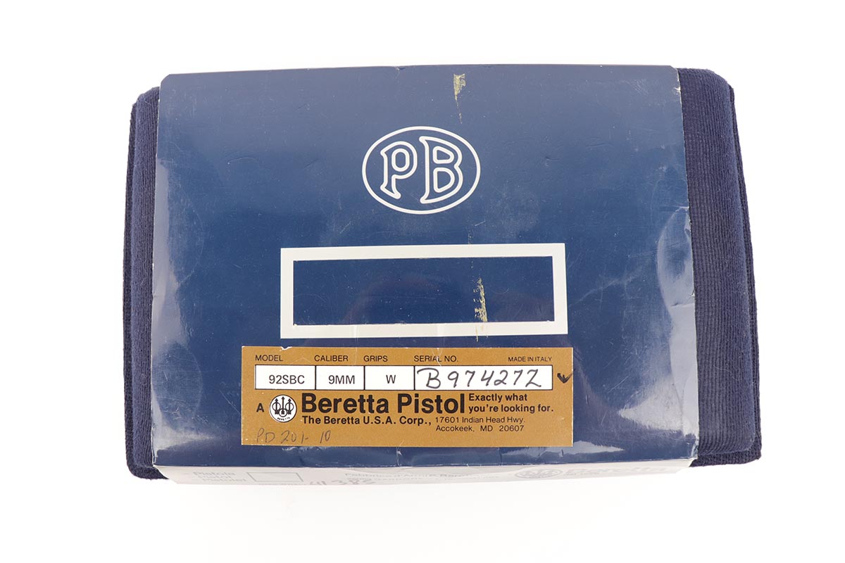 7/31/19 – This is a mint, nearly unfired example of a Beretta 92 SBC pistol, chambered in 9mm Para, complete with its original manual, extra mag, inner case and a serialized outer box. The gun appears new with no wear evident. Made in the 1980s, it has a high polished, blued slide, and an anodized dural frame. Mint bore and grips. A very desirable and scarce set in mint condition.