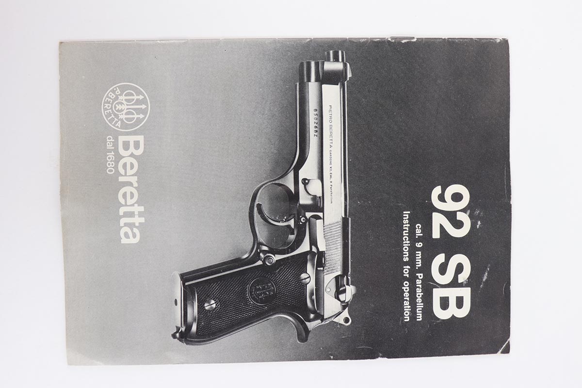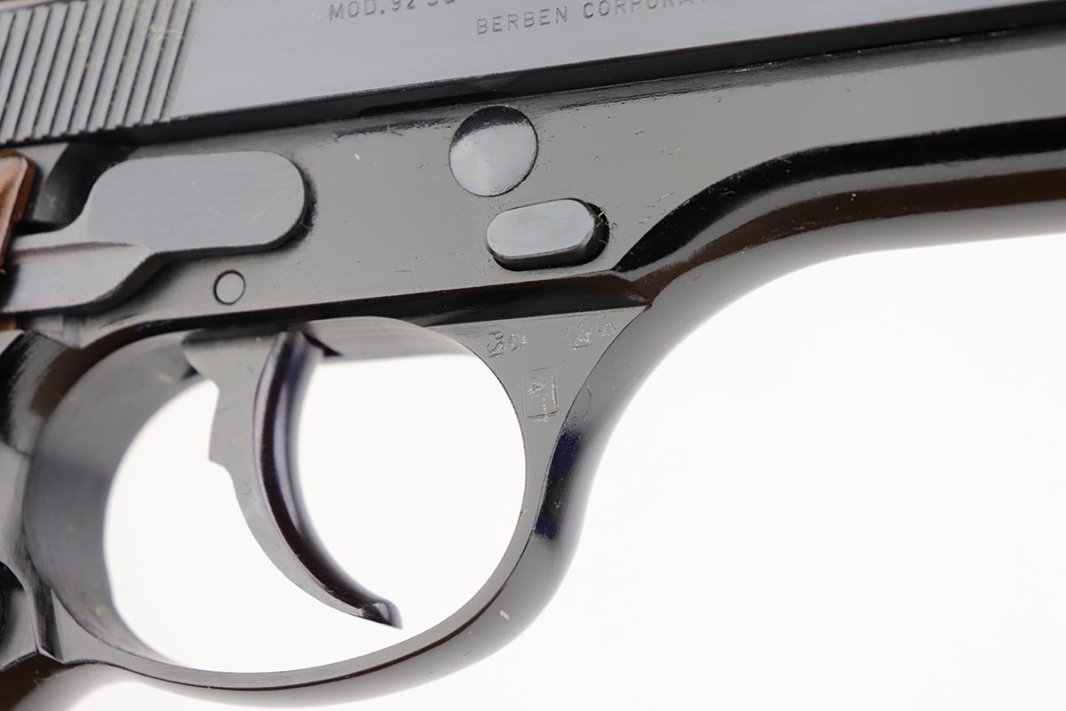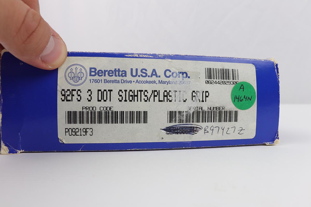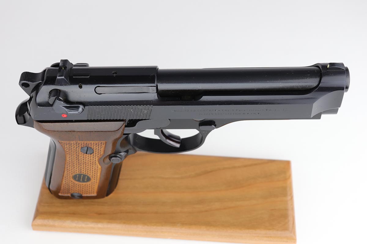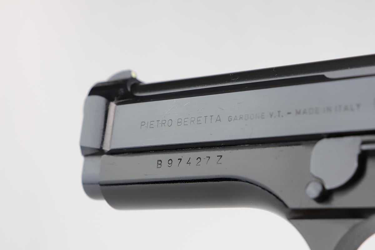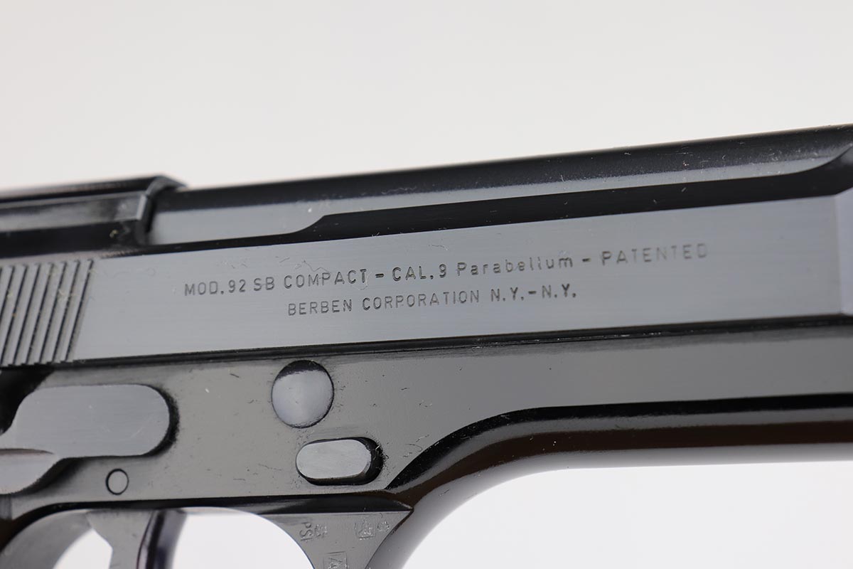 7/31/19 – This is a mint, nearly unfired example of a Beretta 92 SBC pistol, chambered in 9mm Para, complete with its original manual, extra mag, inner case and a serialized outer box. The gun appears new with no wear evident. Made in the 1980s, it has a high polished, blued slide, and an anodized dural frame. Mint bore and grips. A very desirable and scarce set in mint condition.