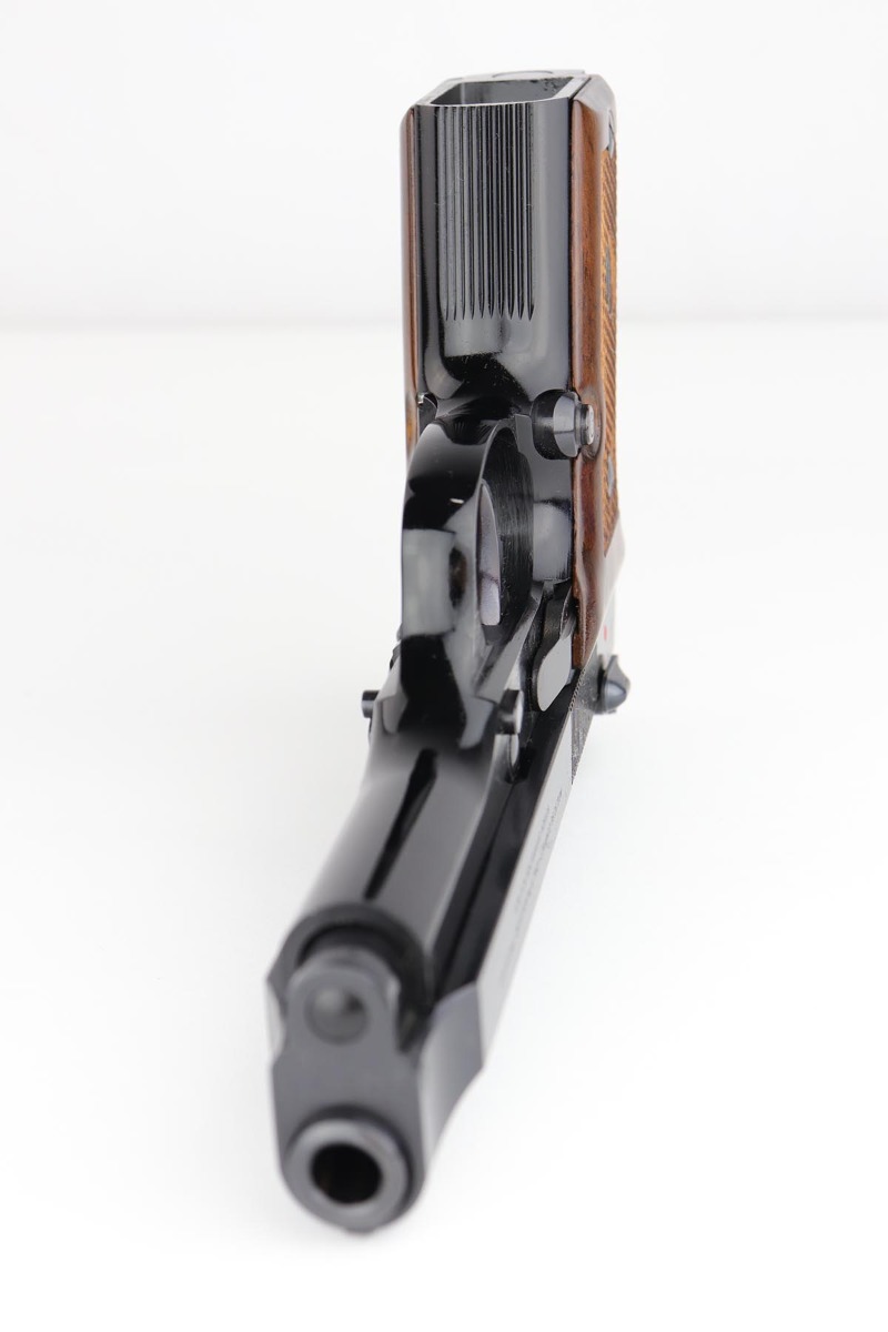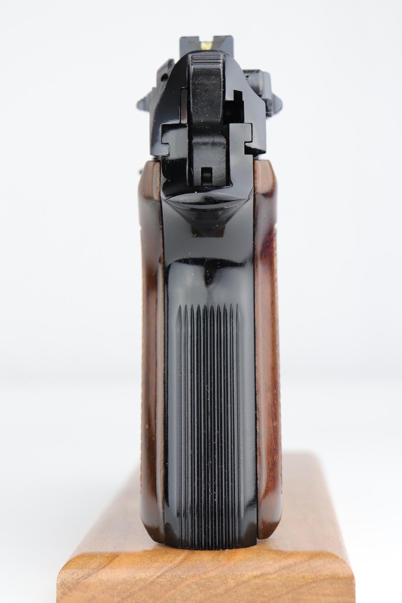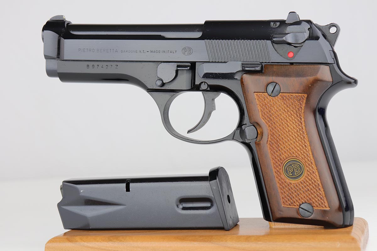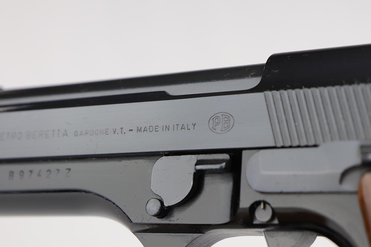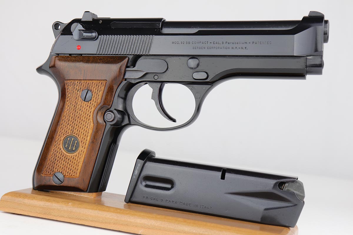 7/31/19 – This is a mint, nearly unfired example of a Beretta 92 SBC pistol, chambered in 9mm Para, complete with its original manual, extra mag, inner case and a serialized outer box. The gun appears new with no wear evident. Made in the 1980s, it has a high polished, blued slide, and an anodized dural frame. Mint bore and grips. A very desirable and scarce set in mint condition.